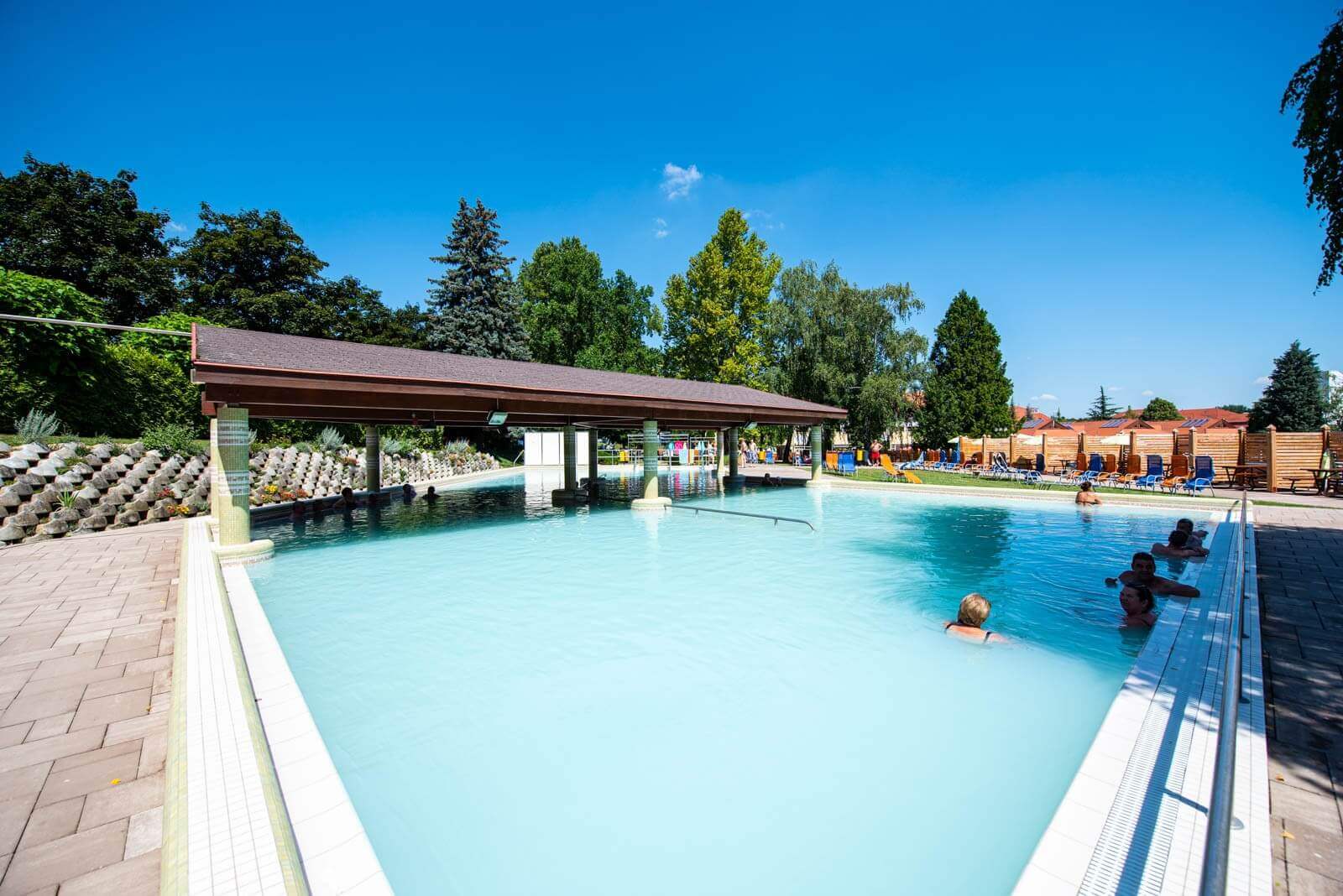 A gyógykertben megújultak a járdafelületek és a napozóterasz burkolata, a gyógykertet és a strandot elválasztó kerítést pedig teljes hosszában kicserélték. A meglévő, ősfákkal övezett parkban a kert is megszépült, új növényzettel várja a pihenni vágyókat.