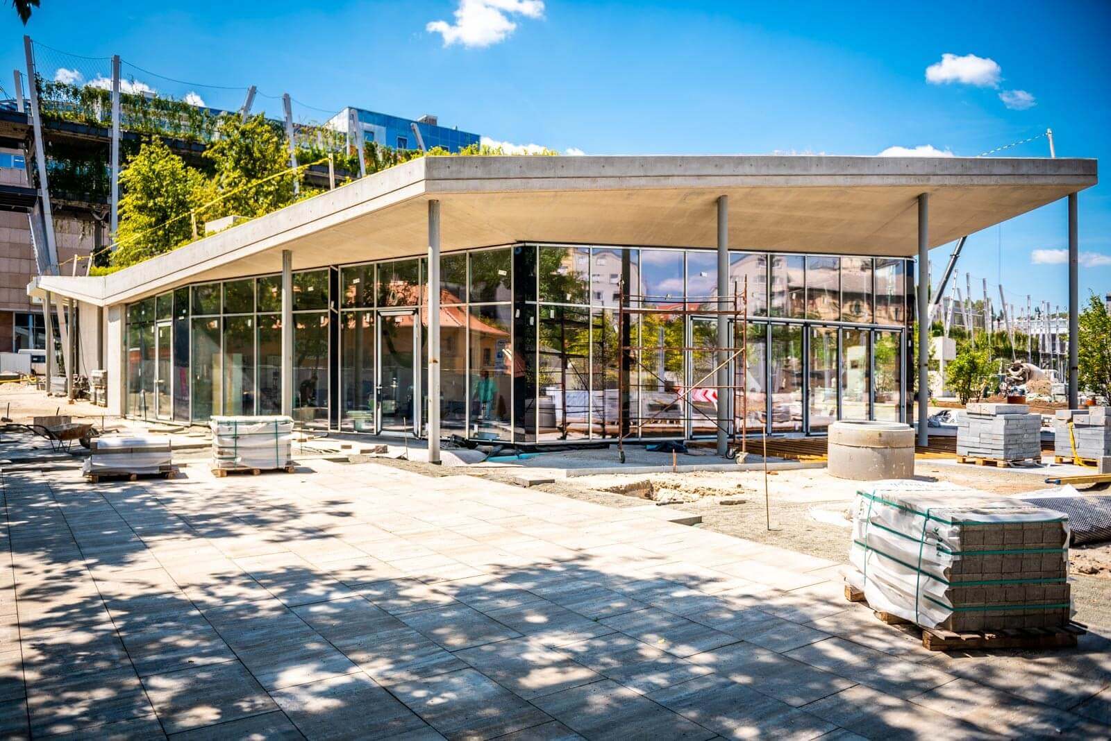 Az Épszerk-Pannónia Invest szakemberei ferdefödémek, a park majdani vizes részeit alkotó medencék, illetve 5-6 méter magas támfalak építkezésén dolgoznak, ami összetettebb munka a szokásosnál. A látszóbeton-építkezéskor a zsaluzás csaknem kétszer annyi ideig tart, mint egy hagyományos szerkezetű építkezésnél – derül ki a mérnök szavaiból. „Maguknak a kiszolgáló épületnek a zsaluzása közel annyi időbe telik, mint a mélygarázs felépítése, miközben jóval kisebb mennyiségről beszélünk” – mutat rá a feladat kihívásaira.