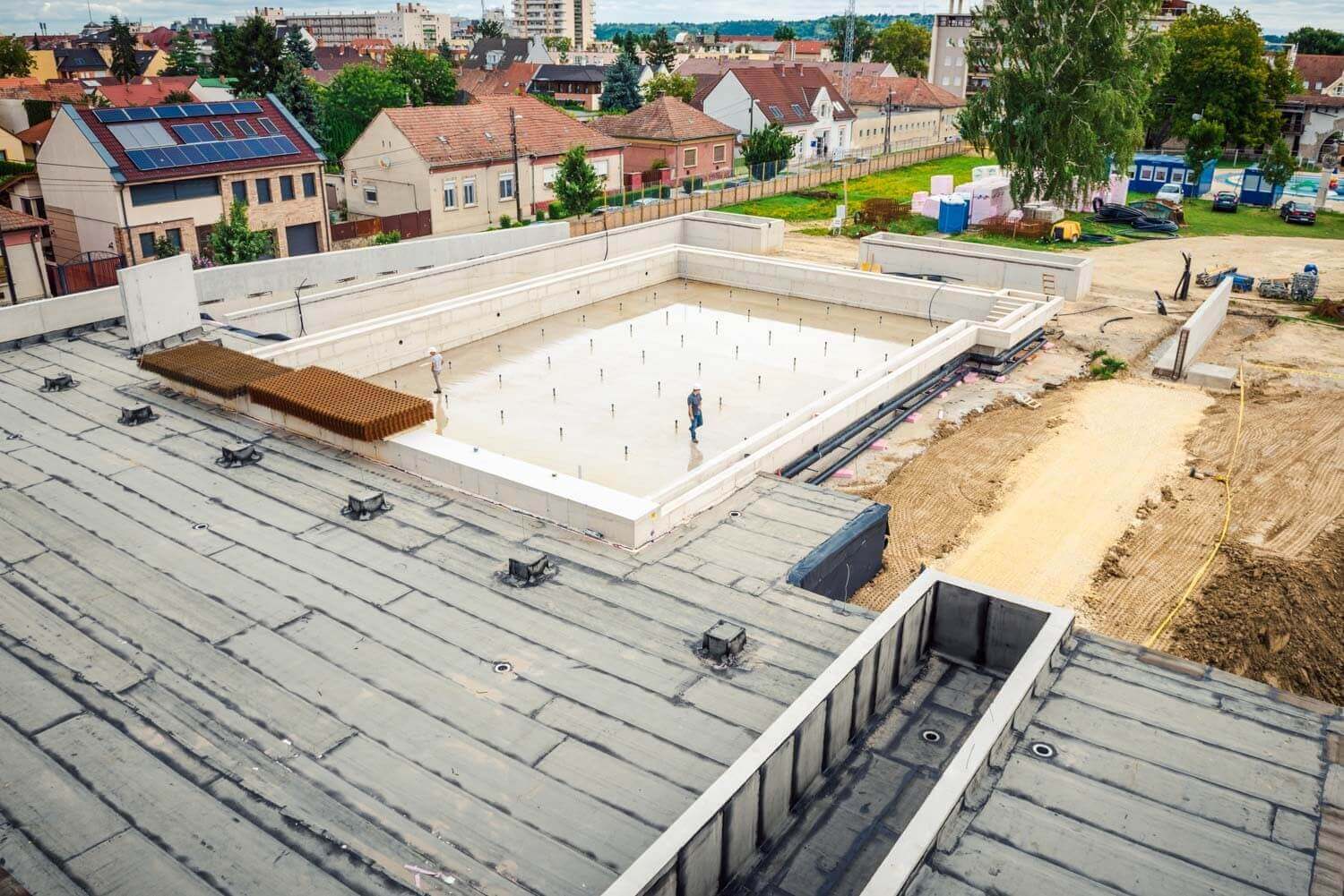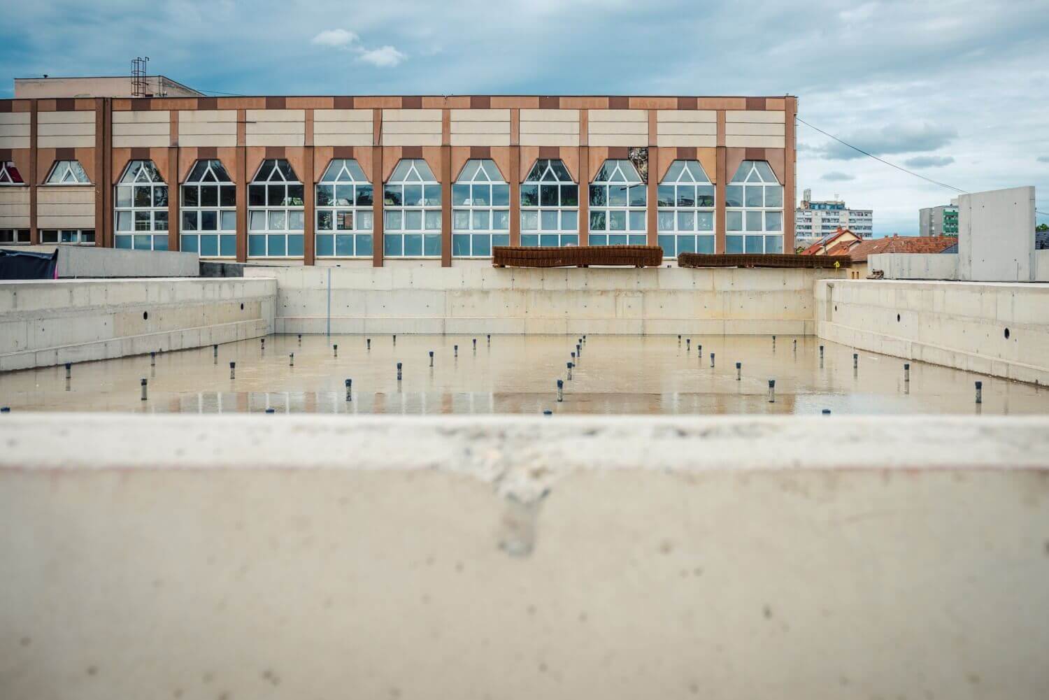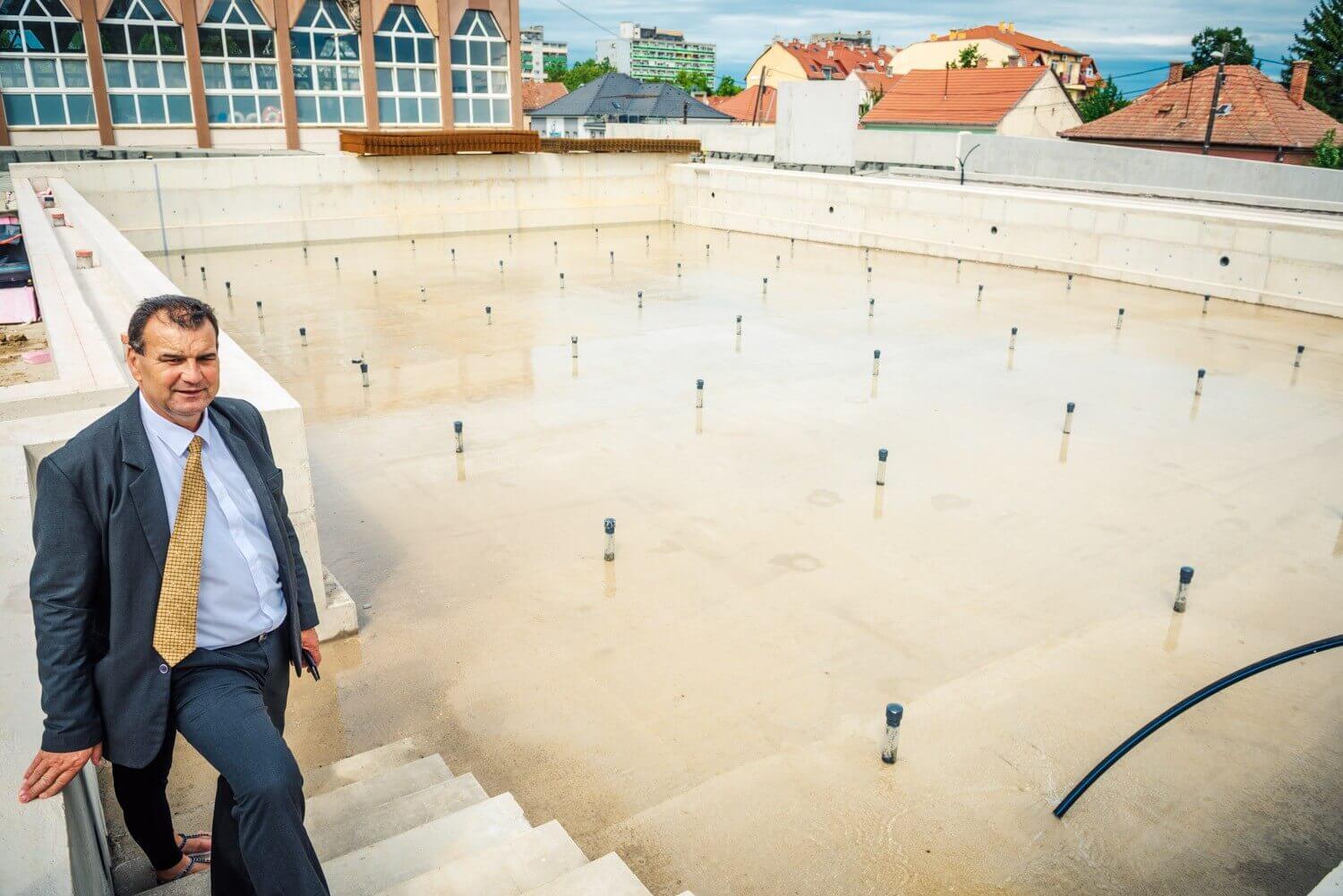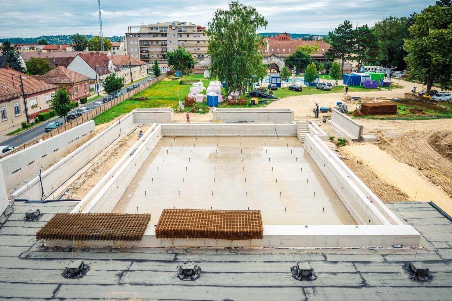 A kivitelező februárban vette át a munkaterületet, azóta elkészült a külső medence, aminek már a gépészeti szerelését készítik elő. Erre a medencére ideiglenes sátorborítás kerül várhatóan a jövő év elején, hogy alatta már üzemeltetni tudják, mert ezzel együtt elkezdik a régi fedett uszoda épületének bontását.