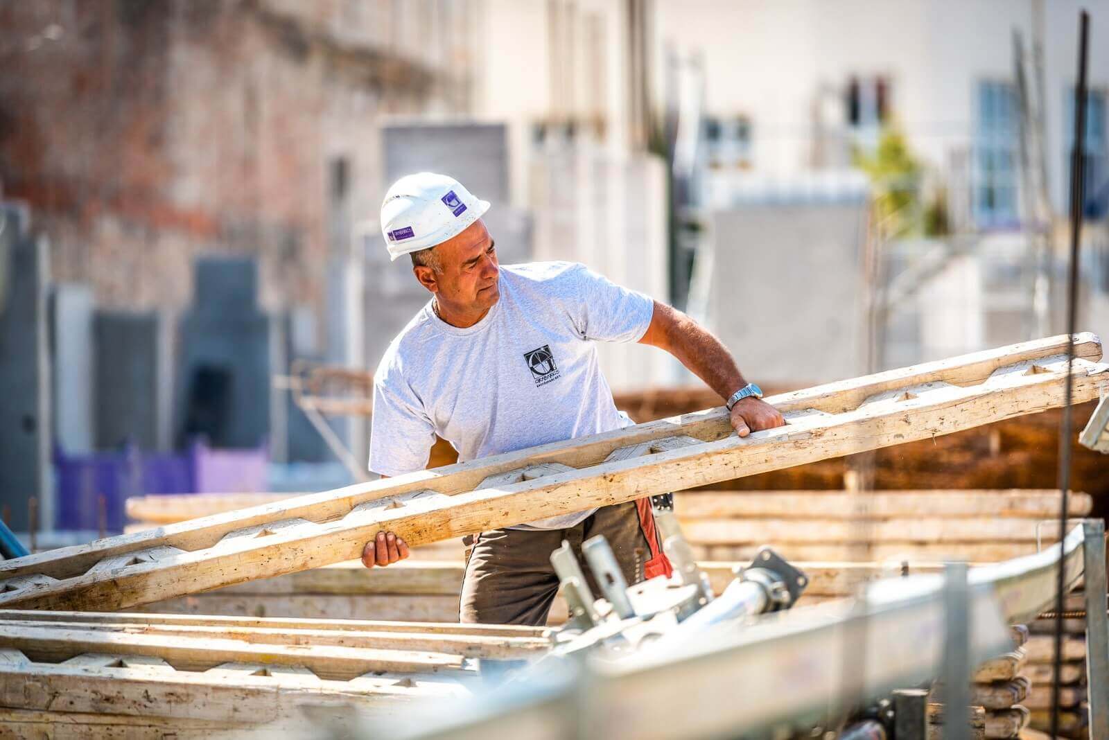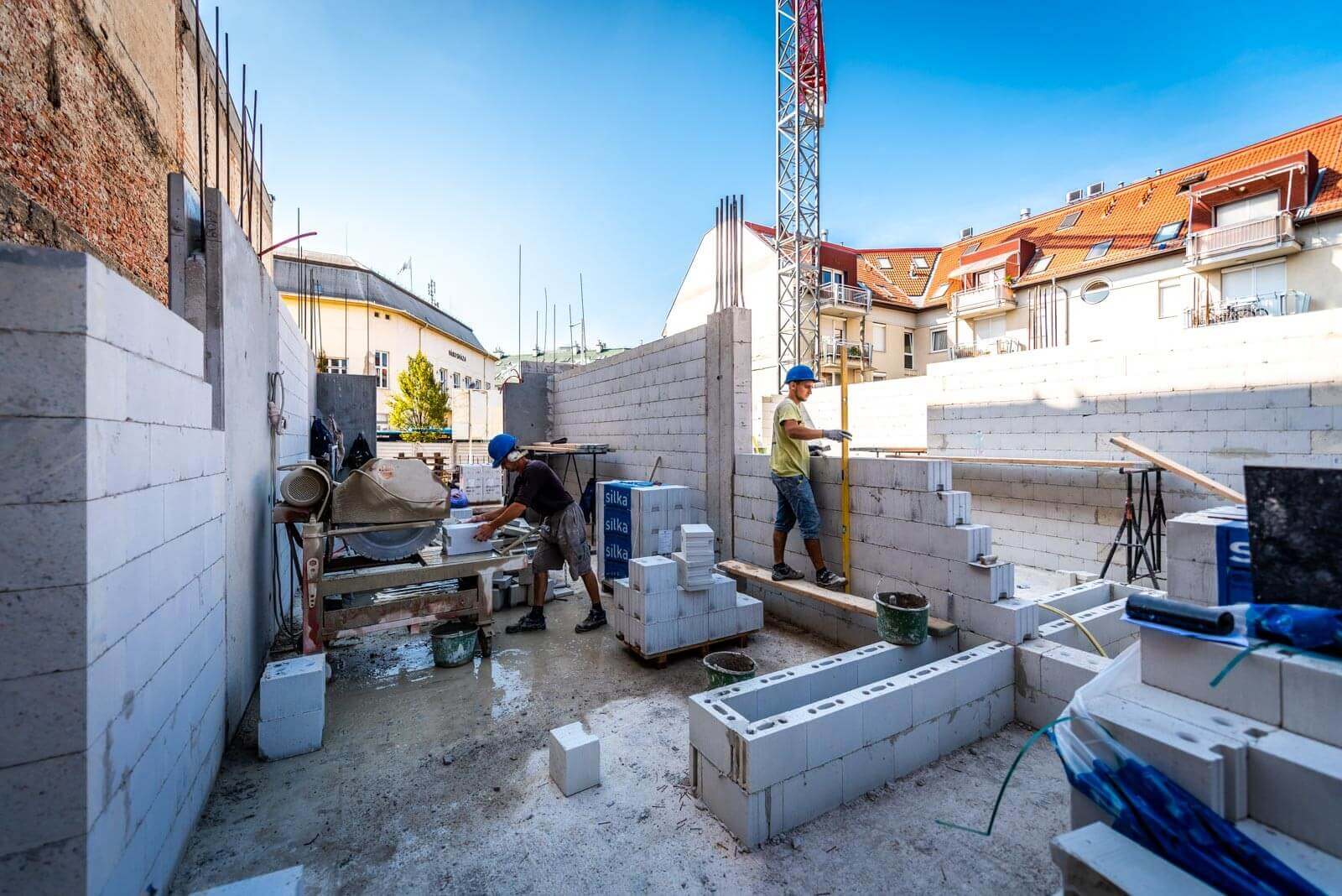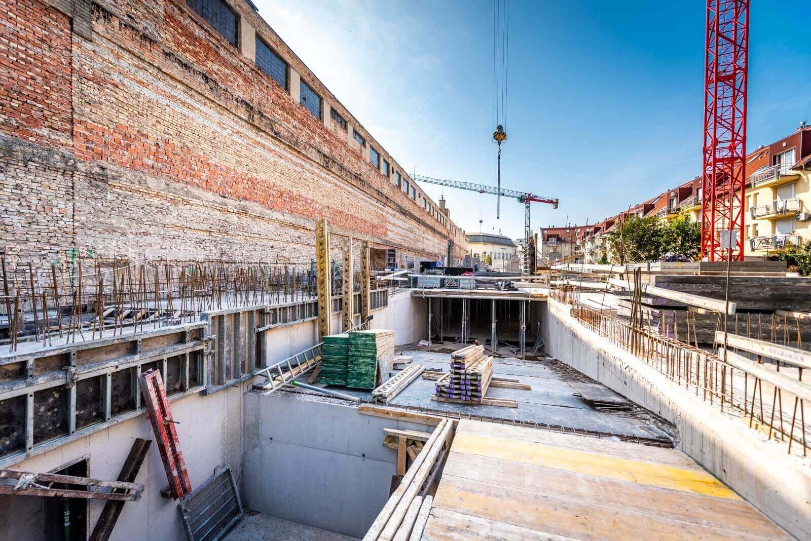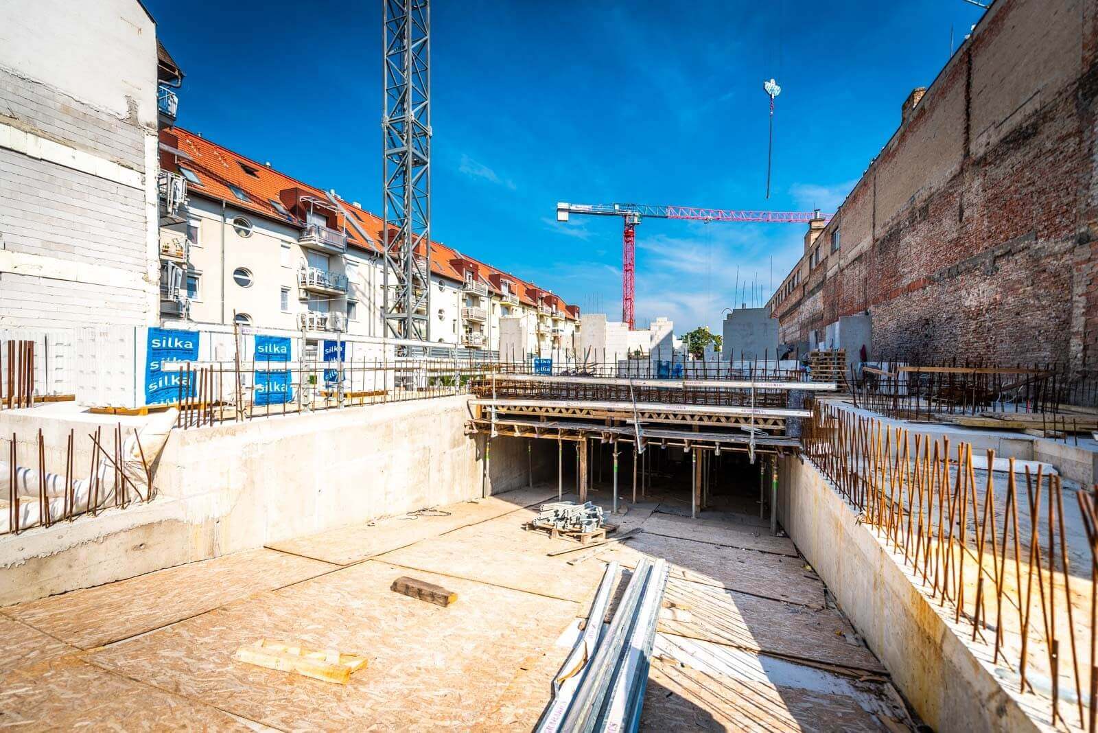 A projektvezető elmondta: A pinceszint teljes szerkezetében elkészült. A munkálatok most a földszinten haladnak és a 6 tömbből négy épül jelenleg. Két épület komplett földszintjével múlt héten elkészültek a szakemberek, további kettővel pedig a következő héten fognak. Itt jelenleg már állnak a falak, a kollégáknak pedig körülbelül öt napra van szükségük egy szint felhúzásához.