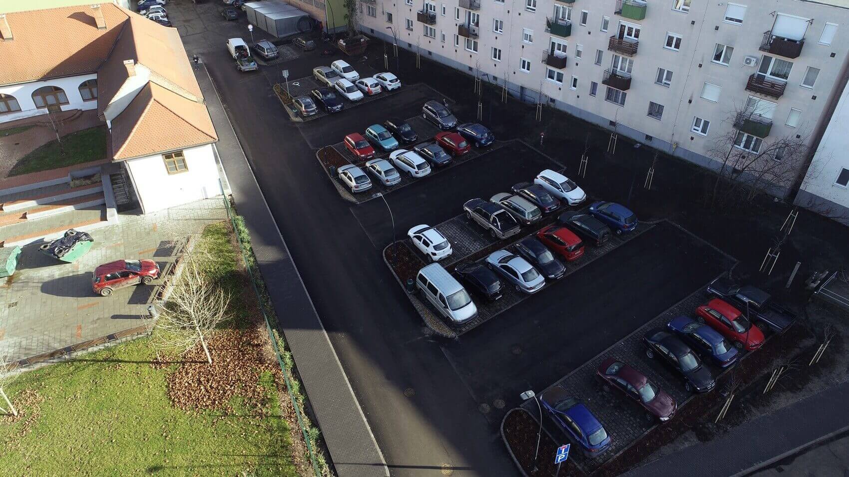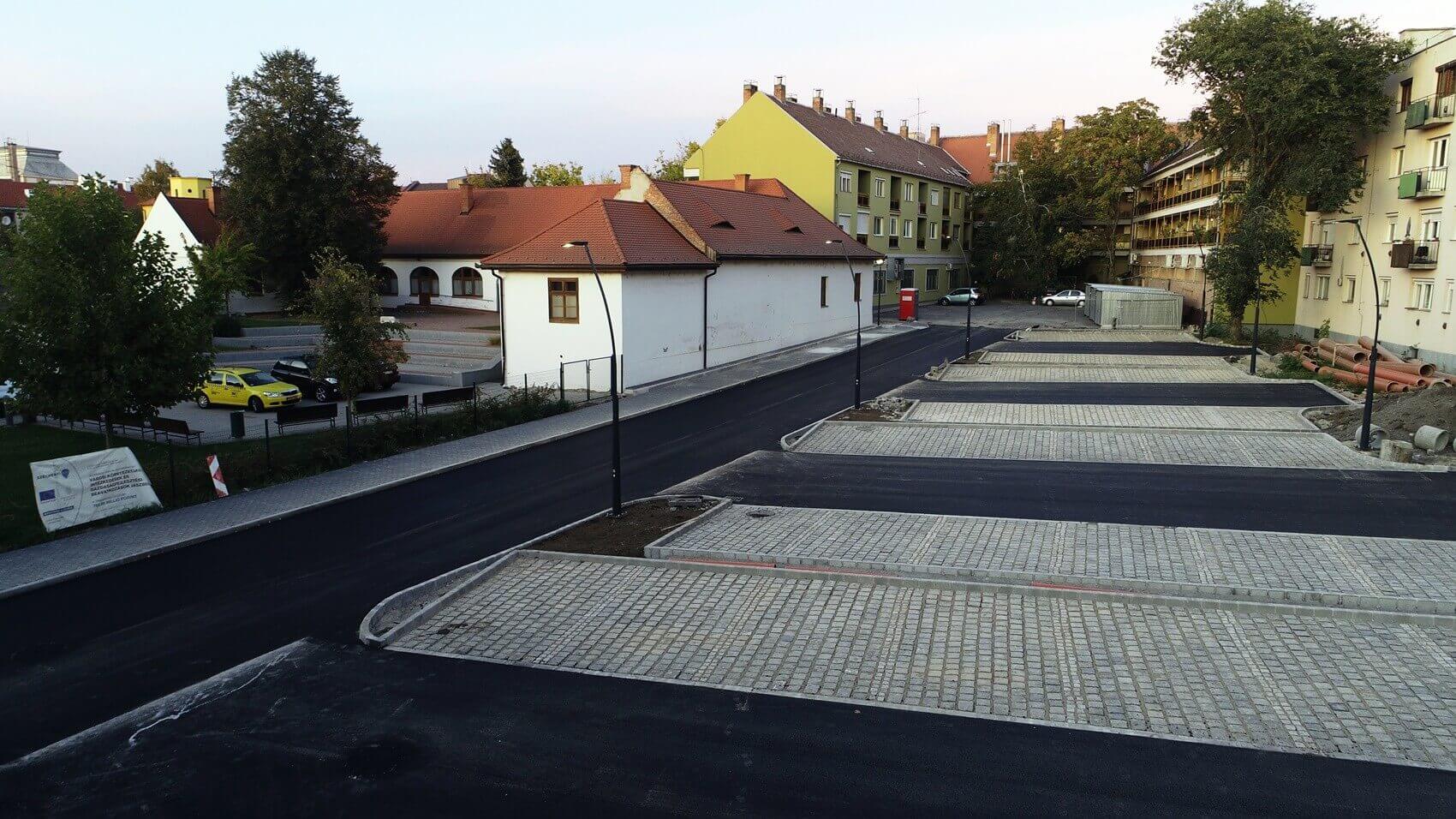 A Fürdő utcai parkoló területének burkolata, a Holló András utcából elbontott, nagykockakő újrahasznosításával jött létre.