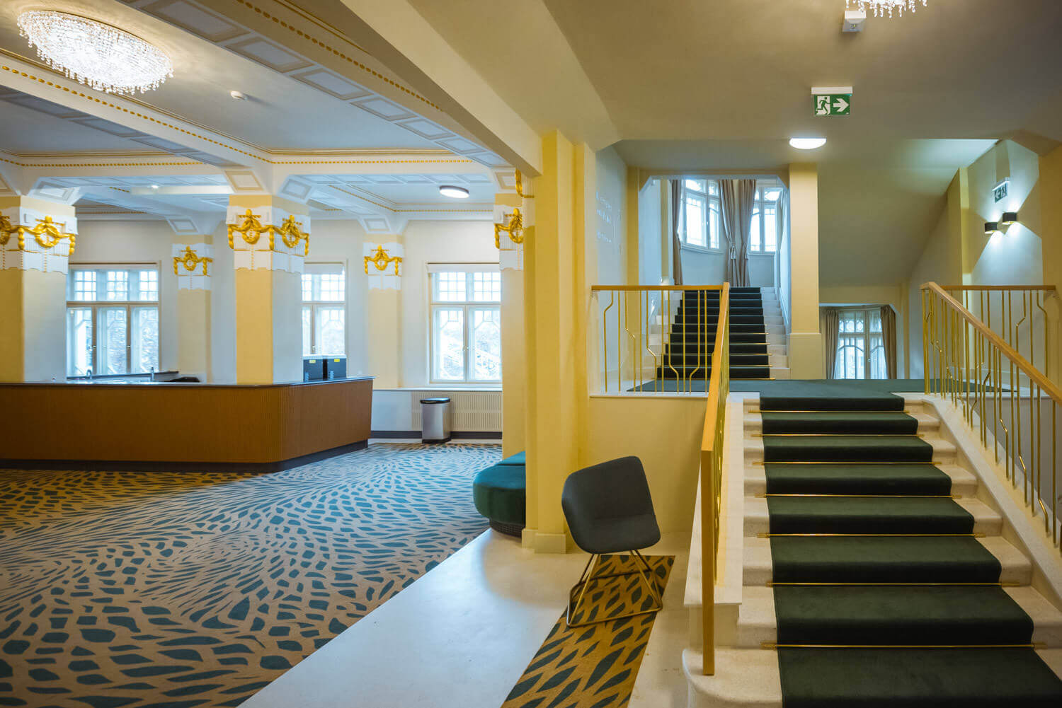 Az eredeti épület nem rendelkezett aulával, amit valahogy pótolni kellett. Ezért a meglévő épület előcsarnoka alá került beépítésre az új főbejárat és az új aula, ruhatárral és büfével együtt. Ebből az új beépített részből vezet fel két lépcső, illetve egy látványlift az eredeti épület előcsarnokába.