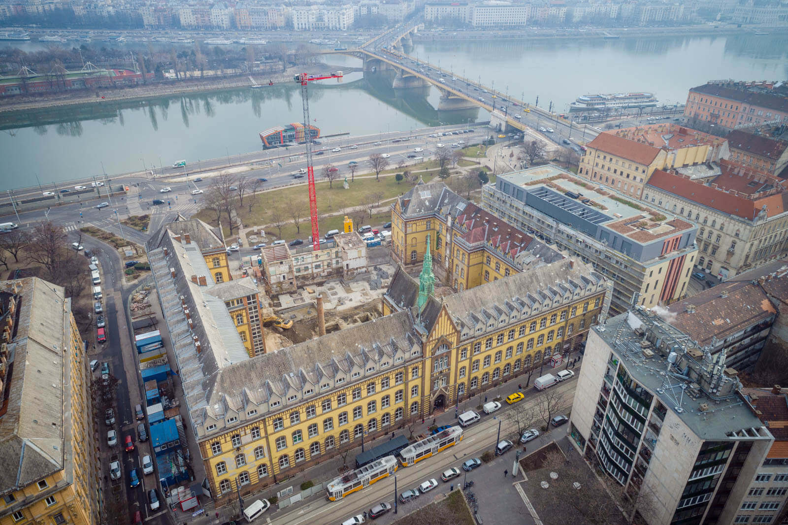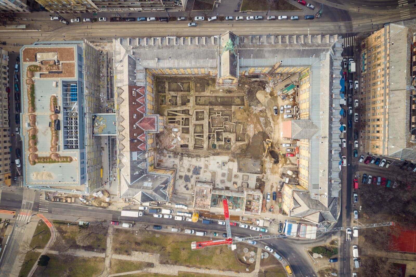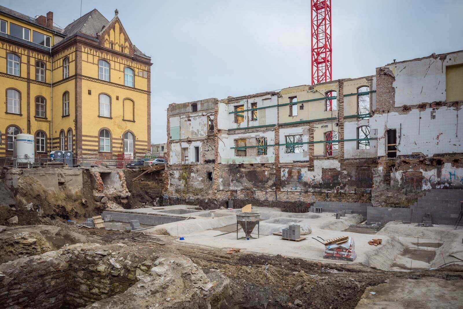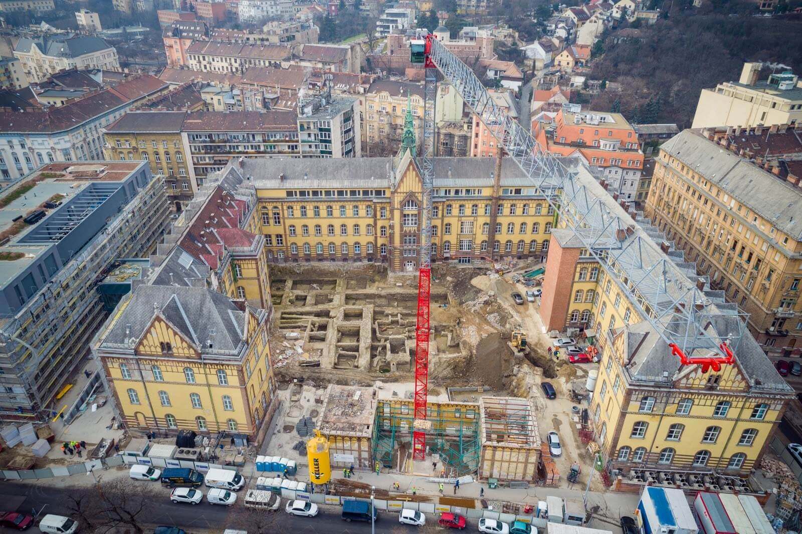 A kivitelező Grabarics Kft. beszámolója szerint a helyszín mintegy 8 méter mélységig jelentős mértékben tartalmazta az elmúlt évezredek emberi tevékenységének nyomait, ezek feltárása és kiásása után jutottak el az altalajig, és érték el a talajvíz szintjét is. Hogy a gödröt stabilizálják, több mint 315 speciális, 21 méteres cölöpöt fúrtak le körben, ezután kezdődhettek meg a további munkálatok.