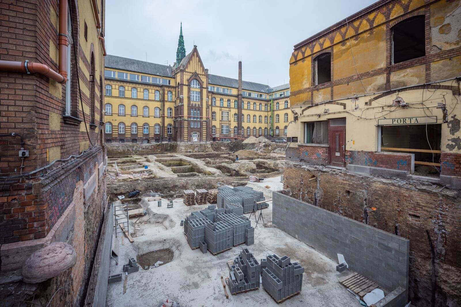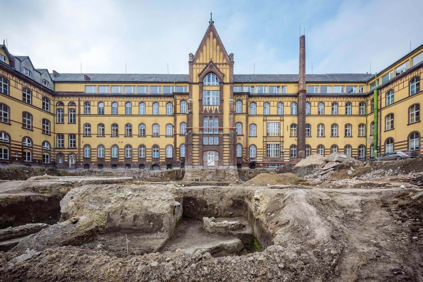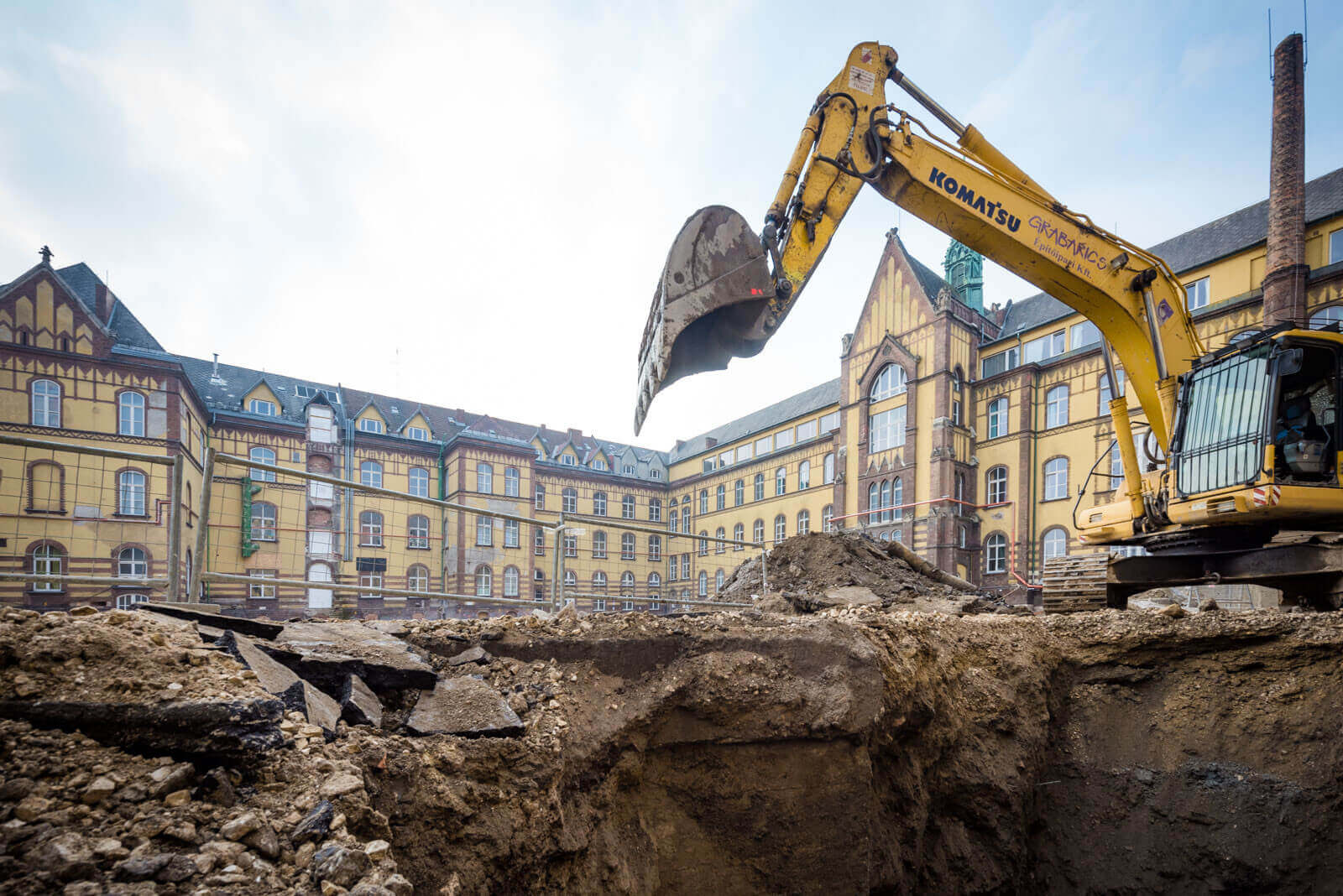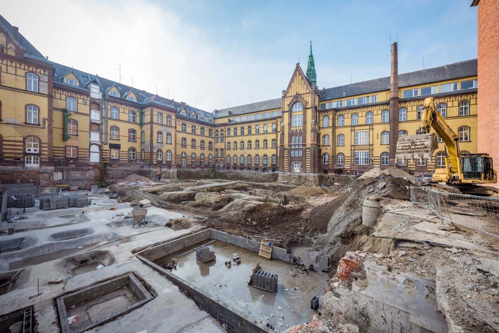 A kivitelező Grabarics Kft. beszámolója szerint a helyszín mintegy 8 méter mélységig jelentős mértékben tartalmazta az elmúlt évezredek emberi tevékenységének nyomait, ezek feltárása és kiásása után jutottak el az altalajig, és érték el a talajvíz szintjét is. Hogy a gödröt stabilizálják, több mint 315 speciális, 21 méteres cölöpöt fúrtak le körben, ezután kezdődhettek meg a további munkálatok.
