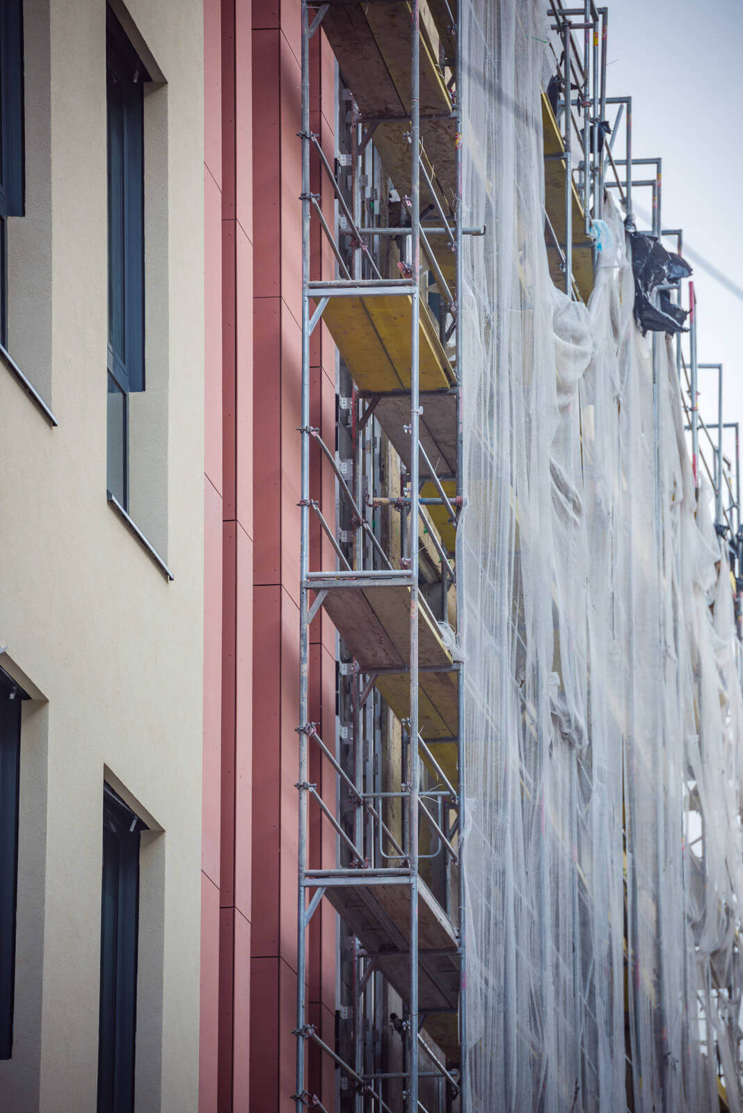 A homlokzati falaknál a szerkezetépítő kivitelező Tega-Bau Kft. biztonsági állványként alkalmazta a PERI FB munkaállványt – erről történt a külső falak vasszerelése, valamint a falzsaluzat összeszerelése. A szerkezetépítő azért választotta a PERI rendszereit, mert a falzsaluzatok összeállításánál az egyetlen kötőelemmel, a BFD kapoccsal könnyen összeszerelhető TRIO rendszer sok variációs lehetőséget biztosított.