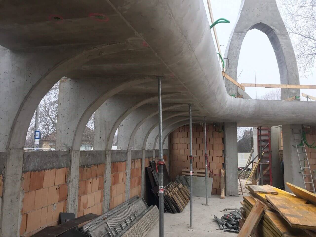 Az épület nagy részén már állnak a falak, helyükre kerültek a templomkarzatok vasbeton lemezei, bennük az elektromos védőcsövekkel, valamint megtörtént a főbejárati kapu zsaluzása. Az időjárás függvényében februárban már az ácsmunkák is megkezdődhetnek.
