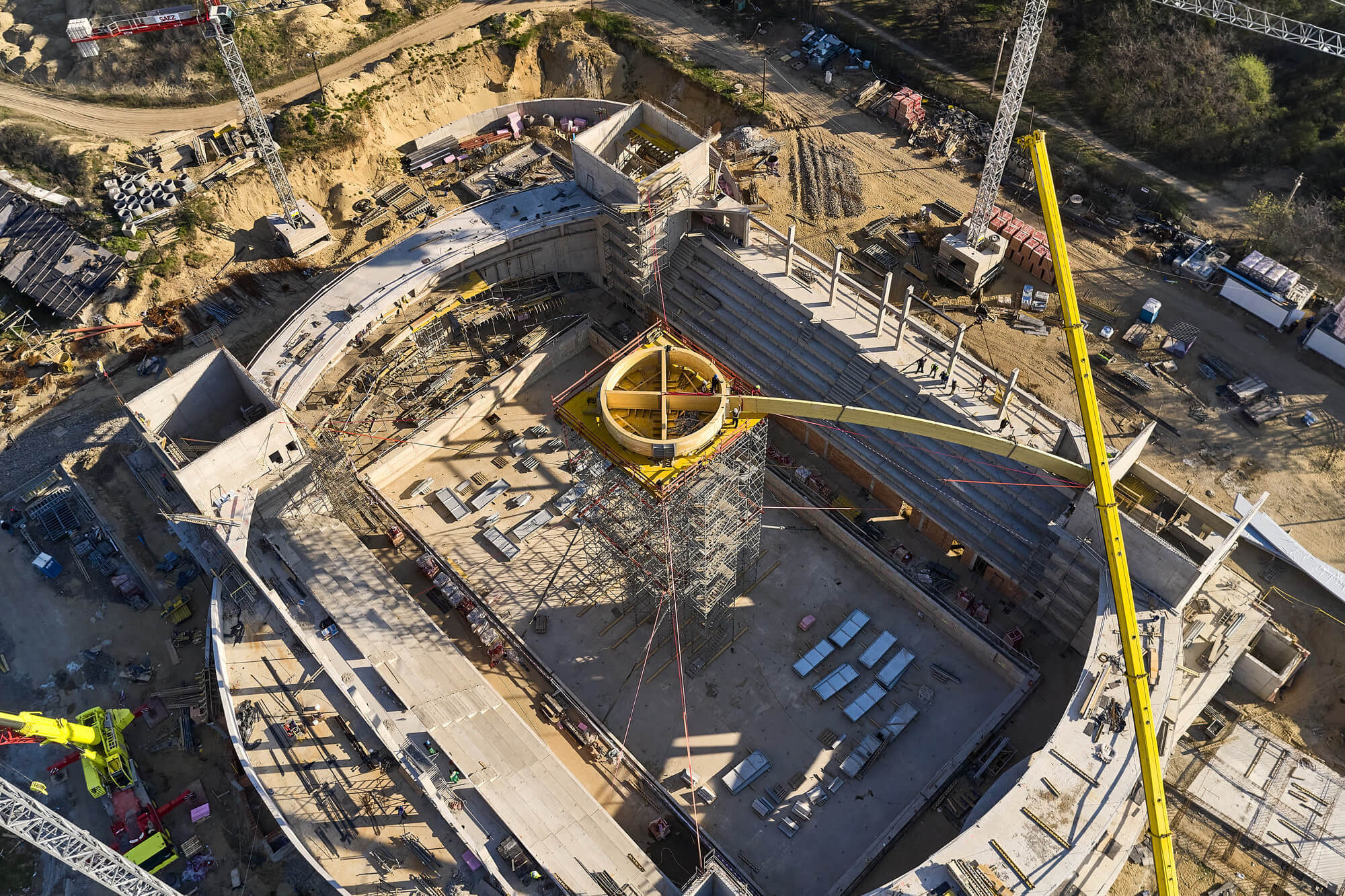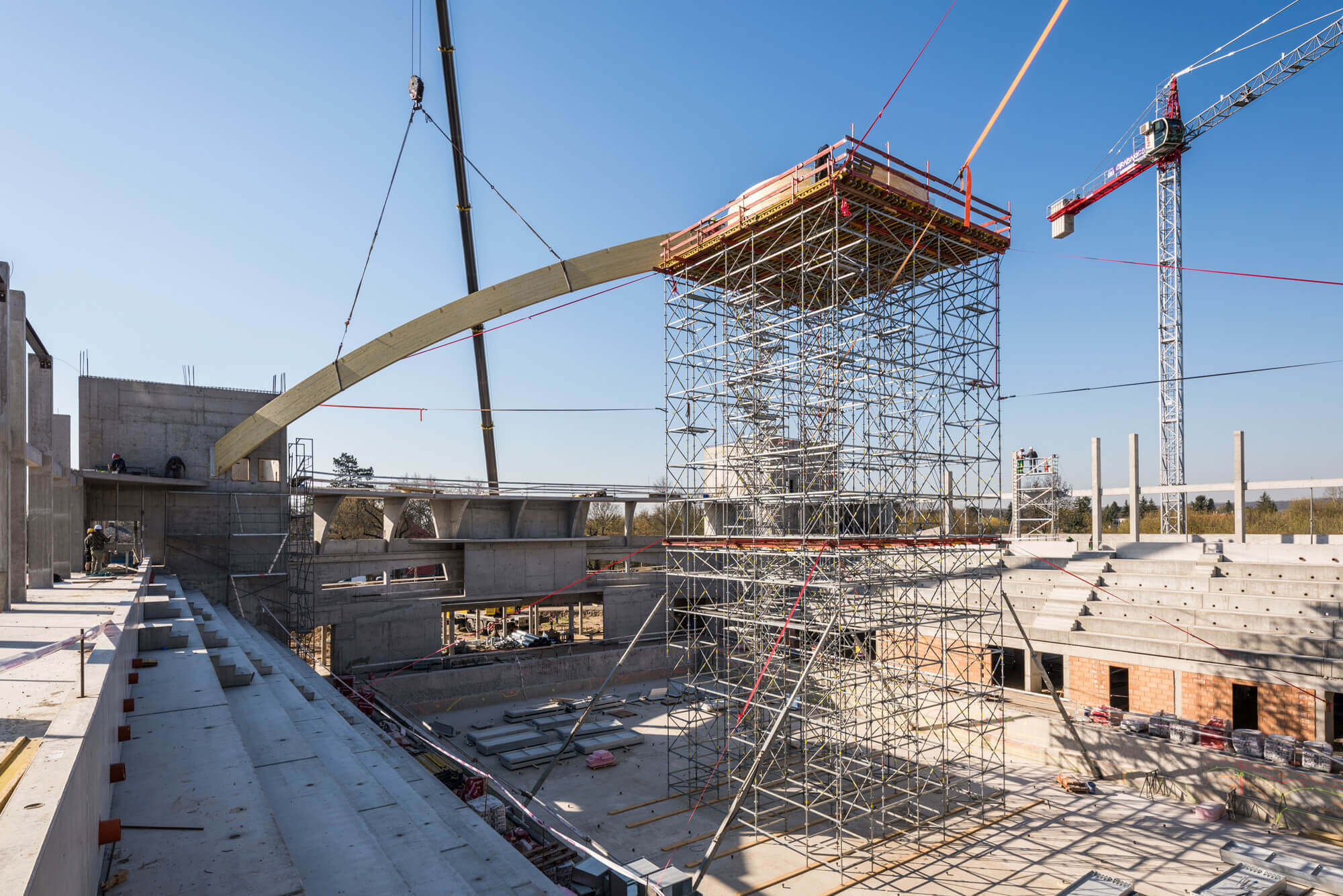 Egy 10x10 méter alapterületű, közel 23 méter magas és 25 tonna önsúlyú PERI UP Flex teherhordó állványszerkezetet alkalmaztak a kivitelezők az uszoda kupolájának ideiglenes megtámasztásához és összeszereléséhez.