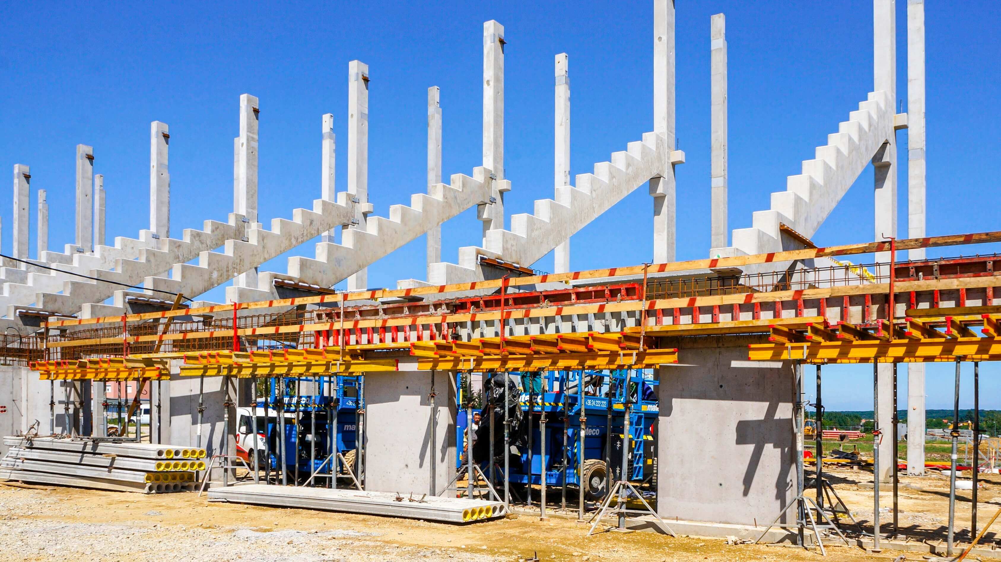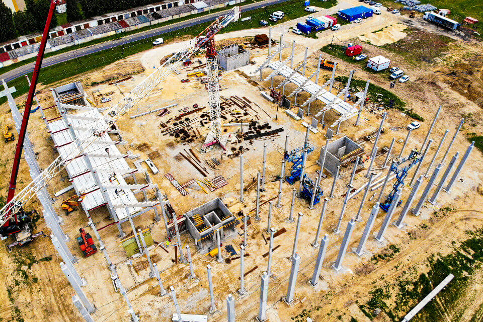 A Kanizsa Aréna fejlesztéséről legutóbb májusban számoltunk be, mikor megkezdték a tartópillérek beemelését. Jelenleg a teljes projekt 15 %-os készültségi szintnél tart. A közelmúltban 158 darab pillért gyártottak le, melyeket már el is helyeztek a helyszínen, az előre gyártott födémpanelek pedig ütemezett módon érkeznek az építési területre. Ezek beemelése után a monolit gerendákkal együtt a felbetonok is folyamatosan készülnek.