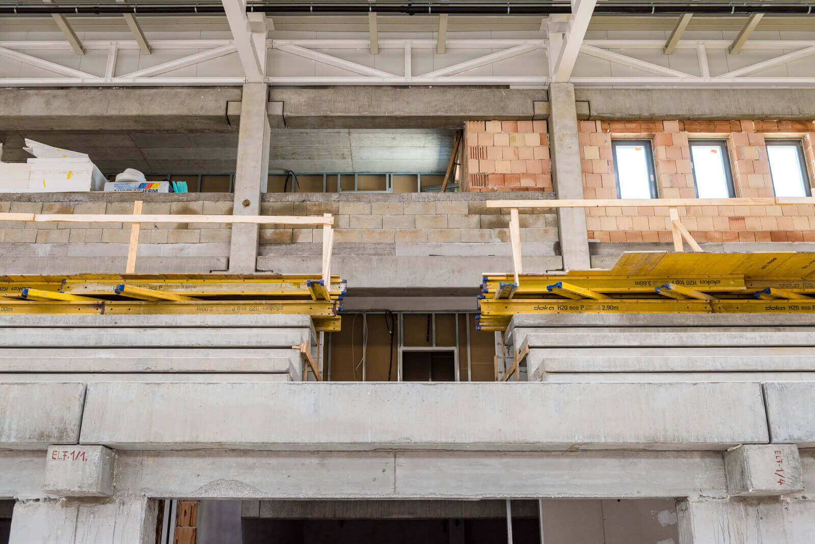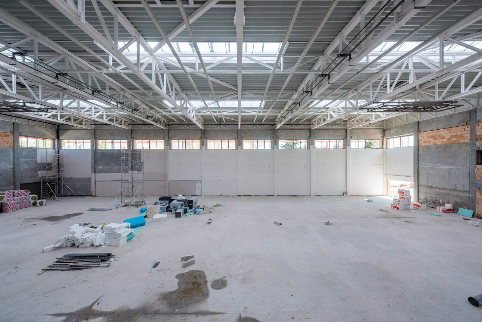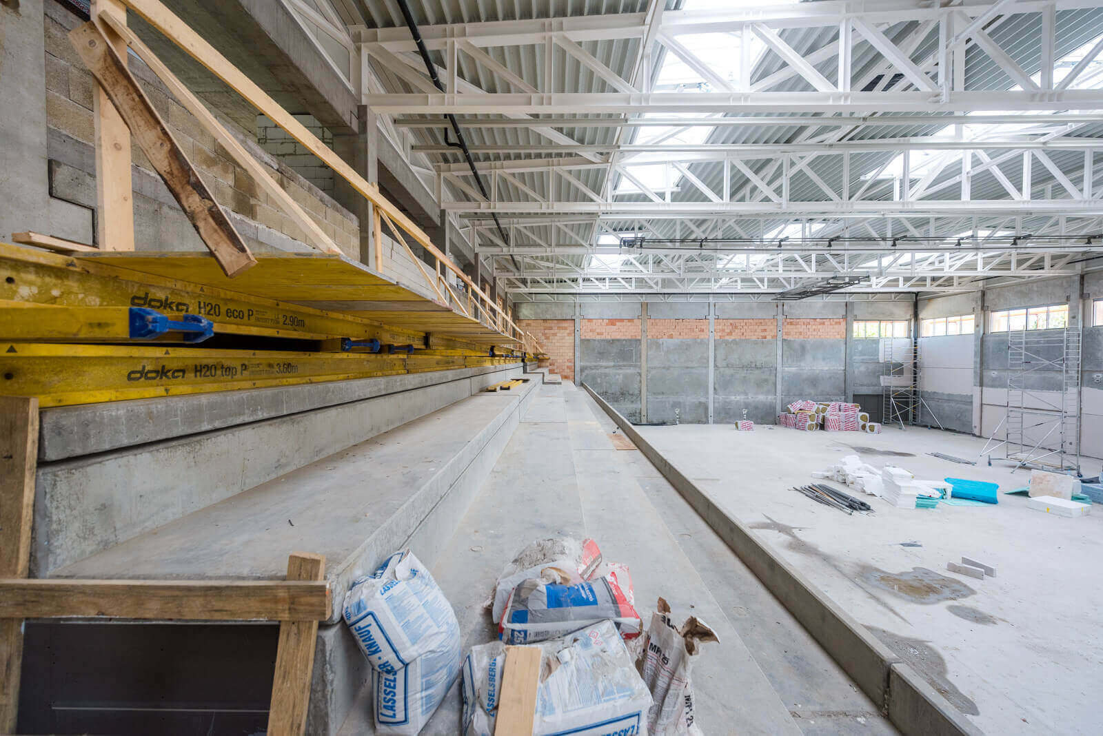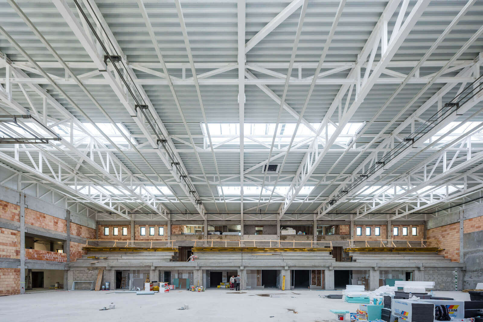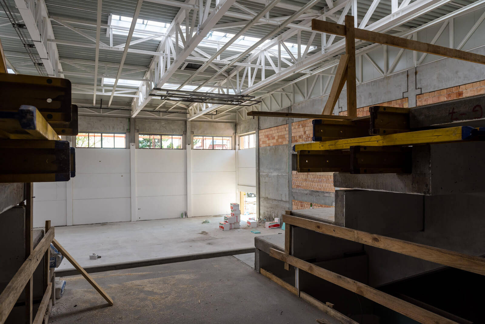 A tornacsarnokban jelenleg is zajlanak a szakipari munkák, többek közt a gipszkartonozás, a válaszfalak, a gépészeti vezetékek kialakítása és az aljzatbetonozás.