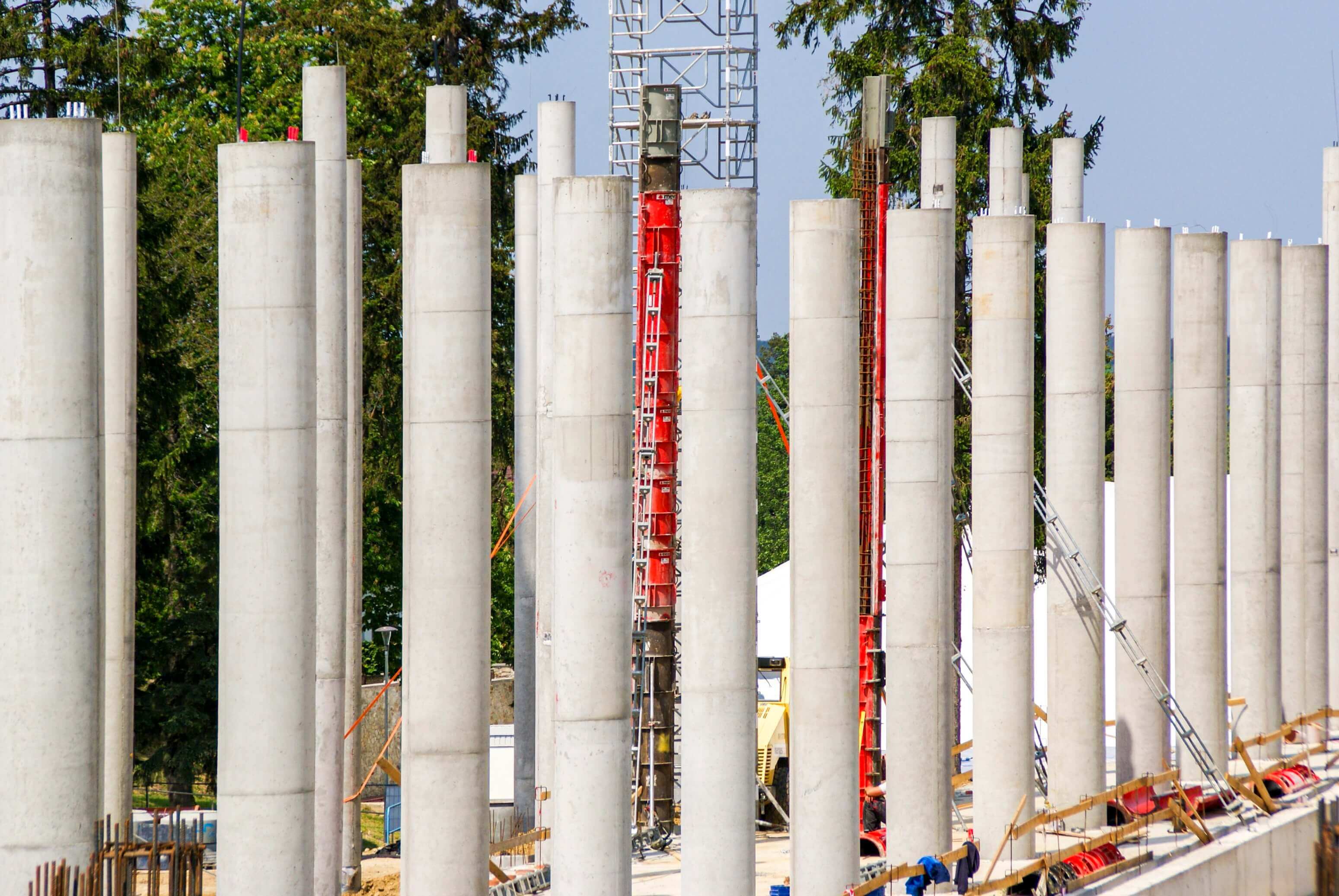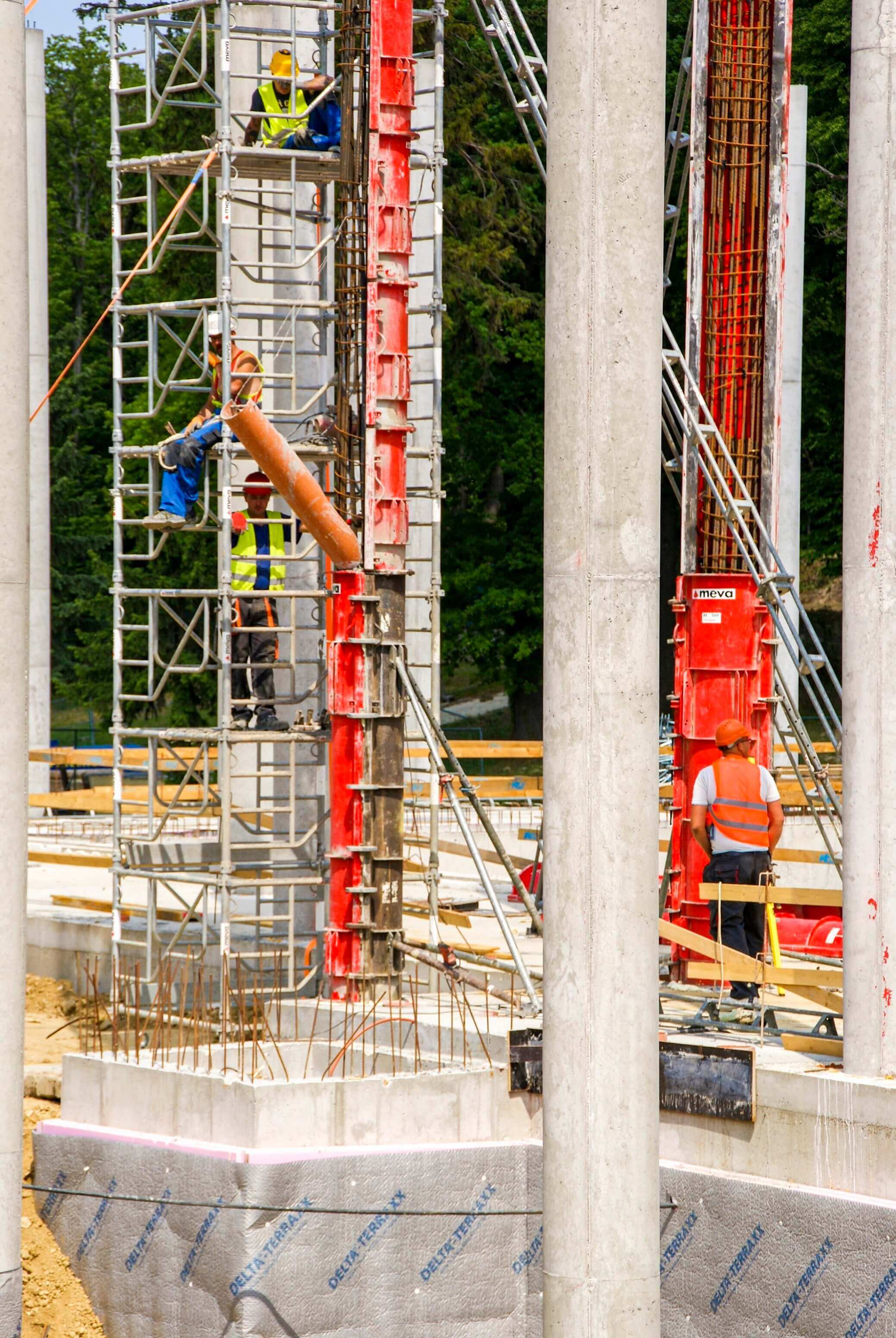 A 42 méter fesztávú ragasztott fa tetőszerkezetet összesen nyolc darab – 13,5 méter magas, 50 és 80 cm átmérőjű – vasbeton körpillér támasztja alá. A körpilléreket a MEVA acélköpenyes 120 KN/m2 teherbírású CIRCO körpillérzsaluzatával zsaluzták. A 13,5 méter magas pillérek két zsaluzási ütemben készültek folyamatos betonozással.