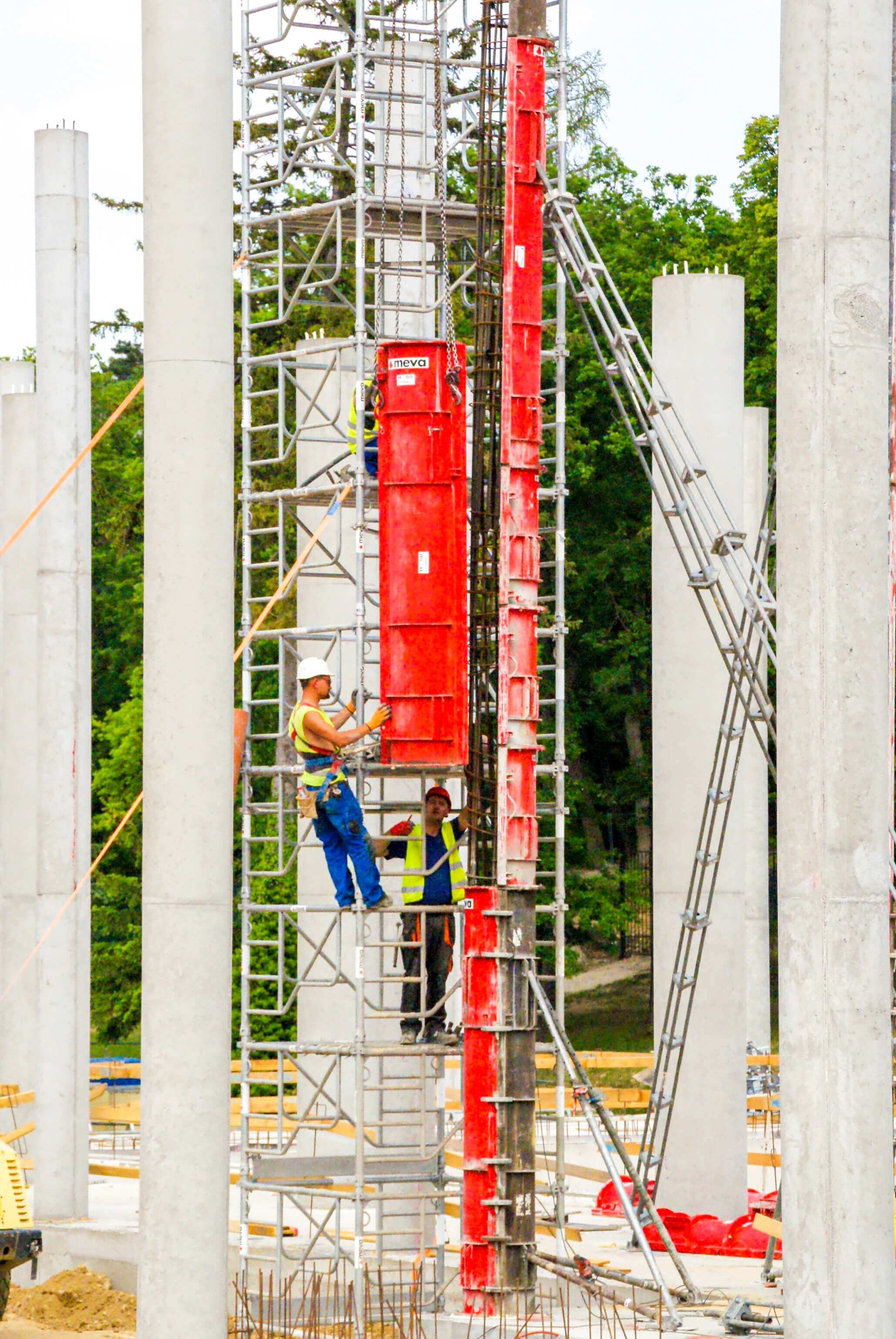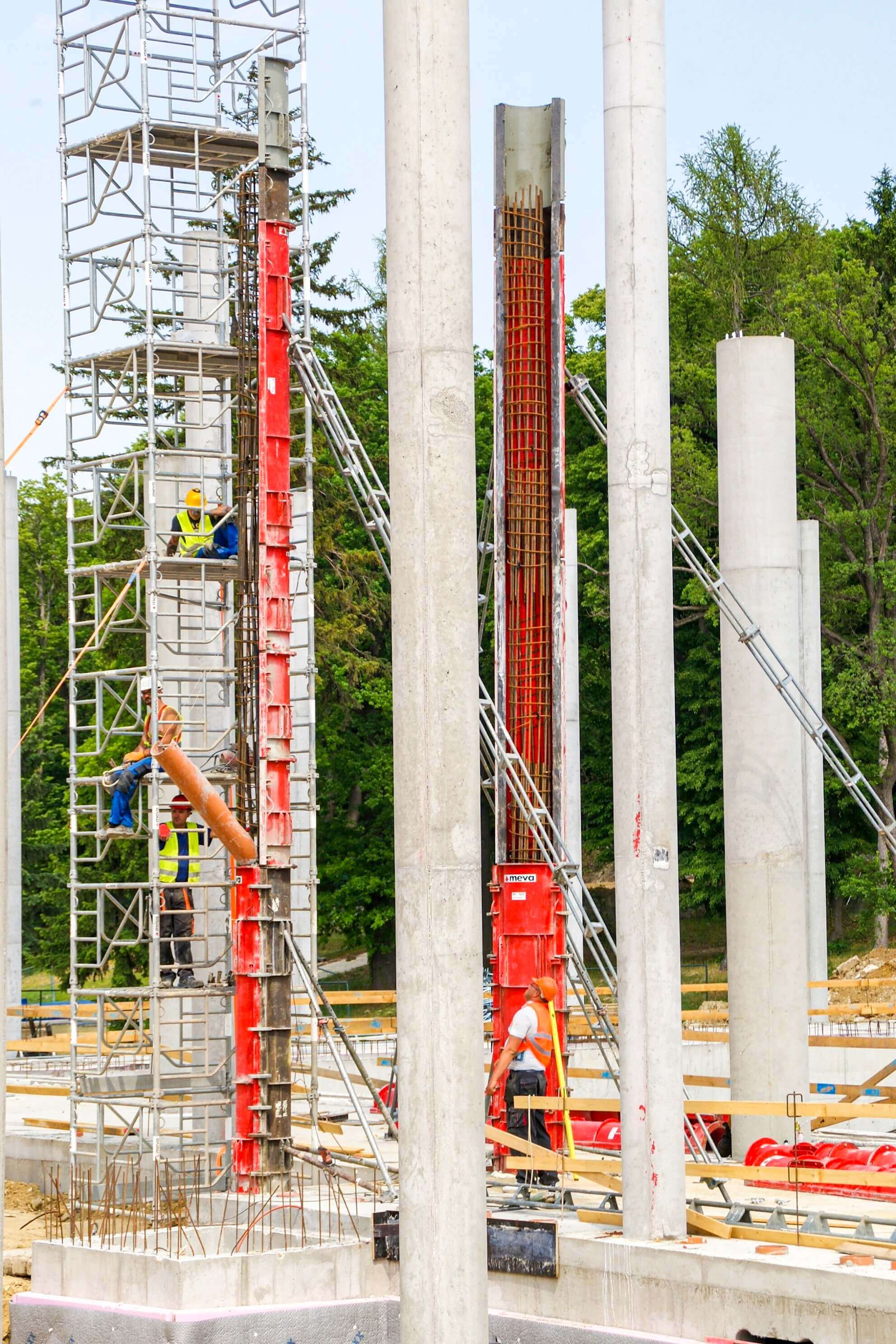 A pillérek vasszereléséhez és a pillérzsaluzat szereléséhez a MEVA MT60 állványrendszert használta a kivitelező, mely munkaszintjeiről biztonságosan folyhatott a munkavégzés. Az állványrendszerből épített torony daruval pillérről pillére könnyen áthelyezhető volt, így költséghatékonyan segítette az aktuális zsaluzási és betonozási munkálatokat.