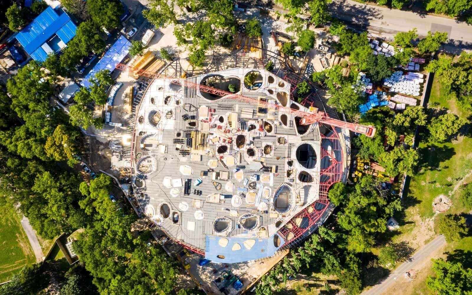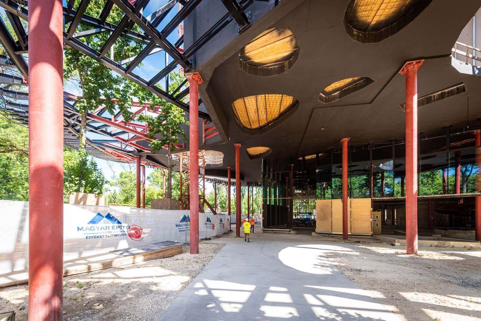 „A tetőzetében szinte nincs két párhuzamos elem, nincs derékszög, minden egyedi, felületét közel 100 egyedi tervezésű lyuk töri át, melyen a ligeti fák átbújnak” – mondta a vezérigazgató.