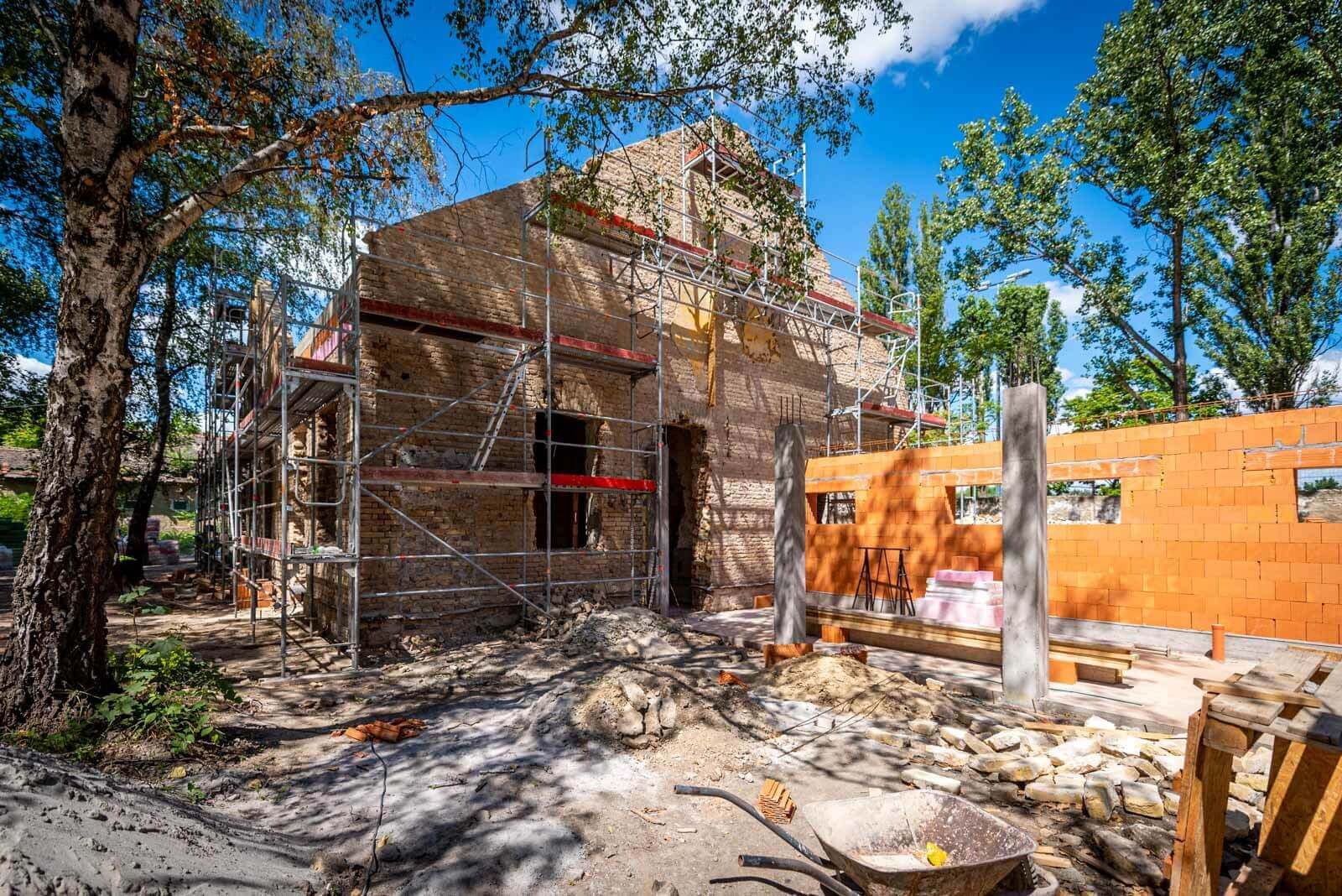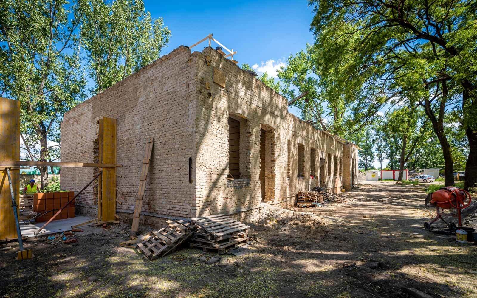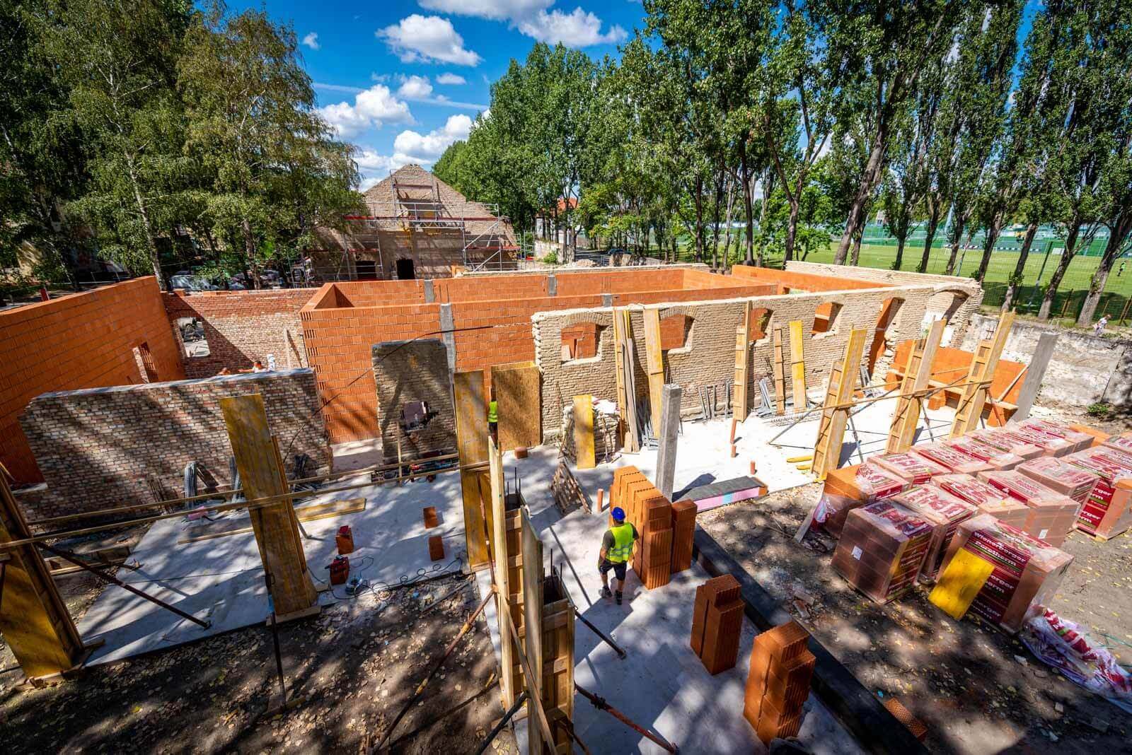 Miután áprilisban főként a régi átázott elemeket, burkolatokat bontották el, most már a szerkezetépítéssel haladnak jó ütemben a Lecpes Kft. munkatársai: az alapozási munkák után a falak, a válaszfalak, és a vasbeton szerkezetek kerültek sorra.