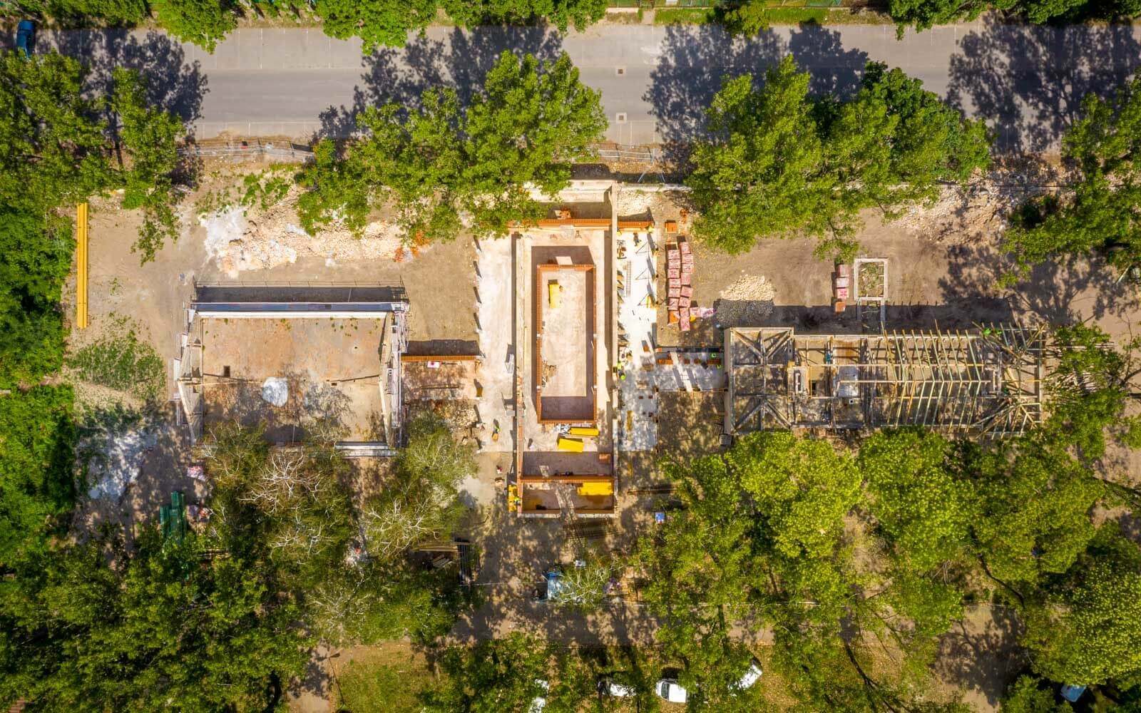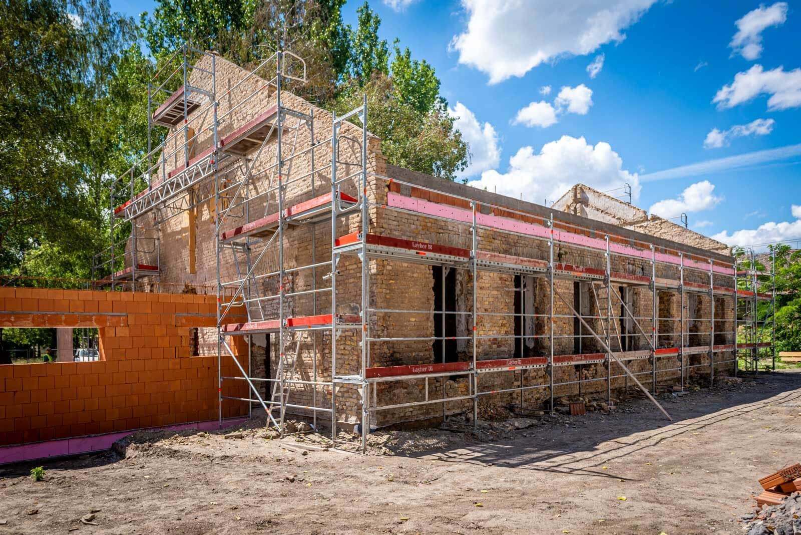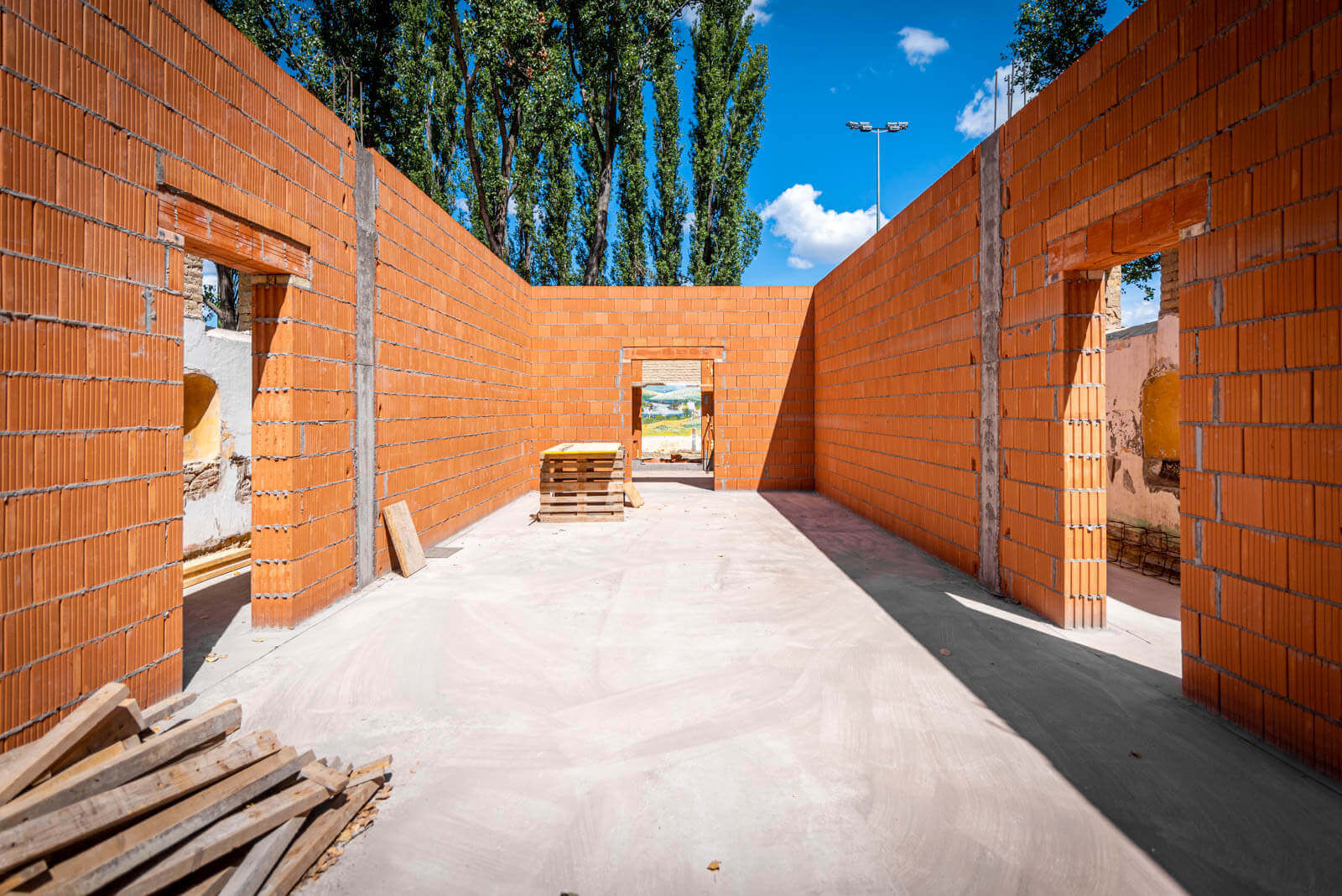 Miután áprilisban főként a régi átázott elemeket, burkolatokat bontották el, most már a szerkezetépítéssel haladnak jó ütemben a Lecpes Kft. munkatársai: az alapozási munkák után a falak, a válaszfalak, és a vasbeton szerkezetek kerültek sorra.