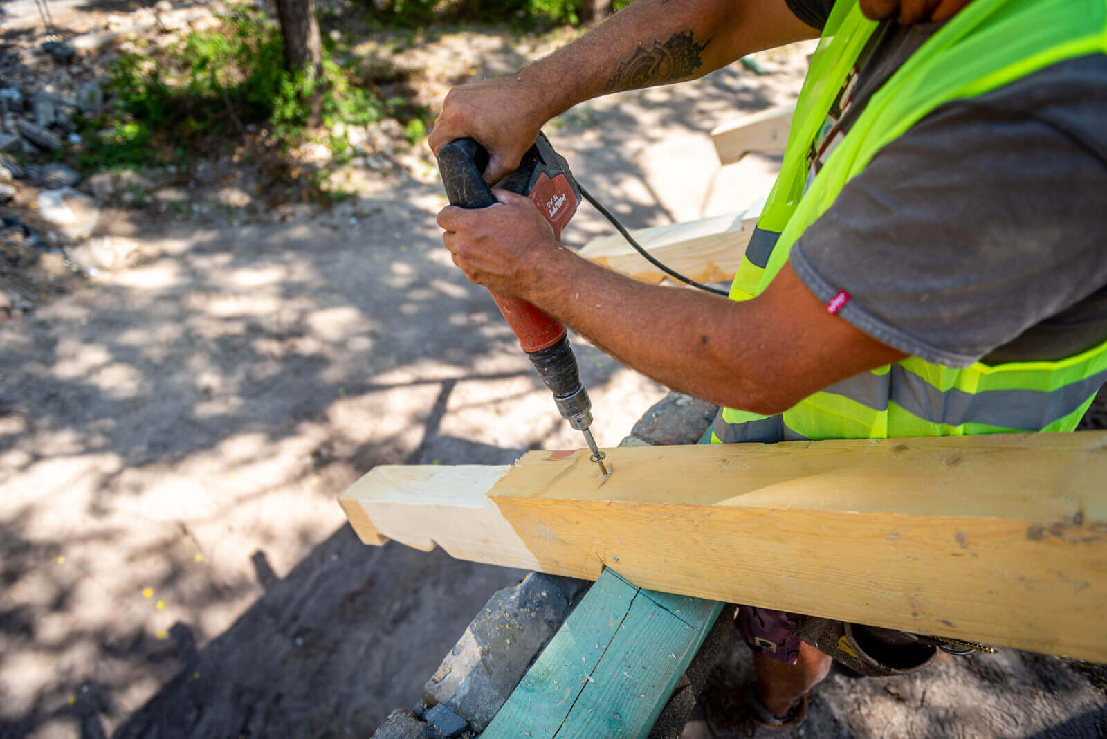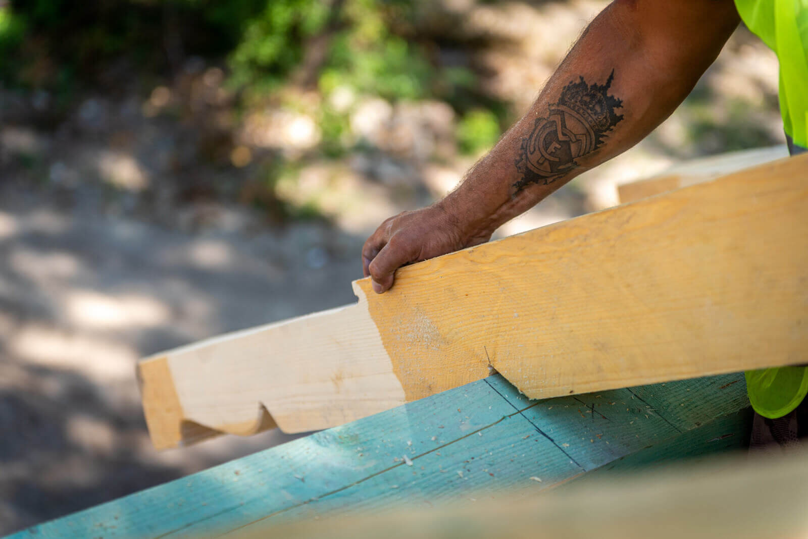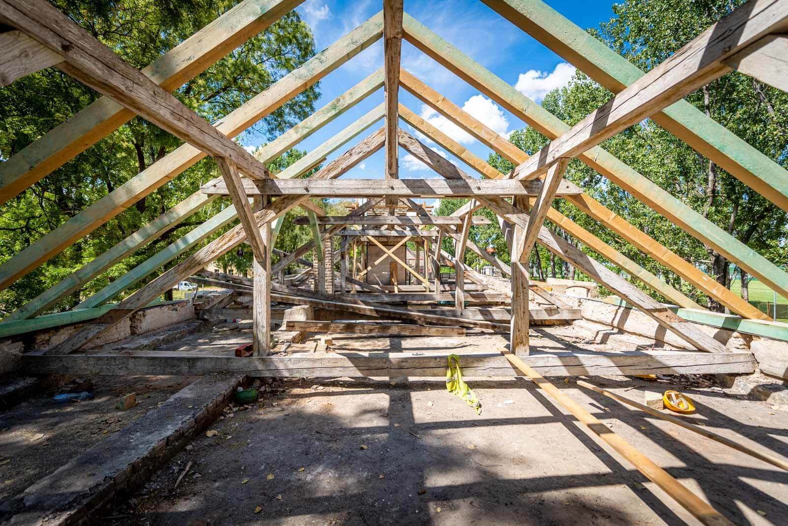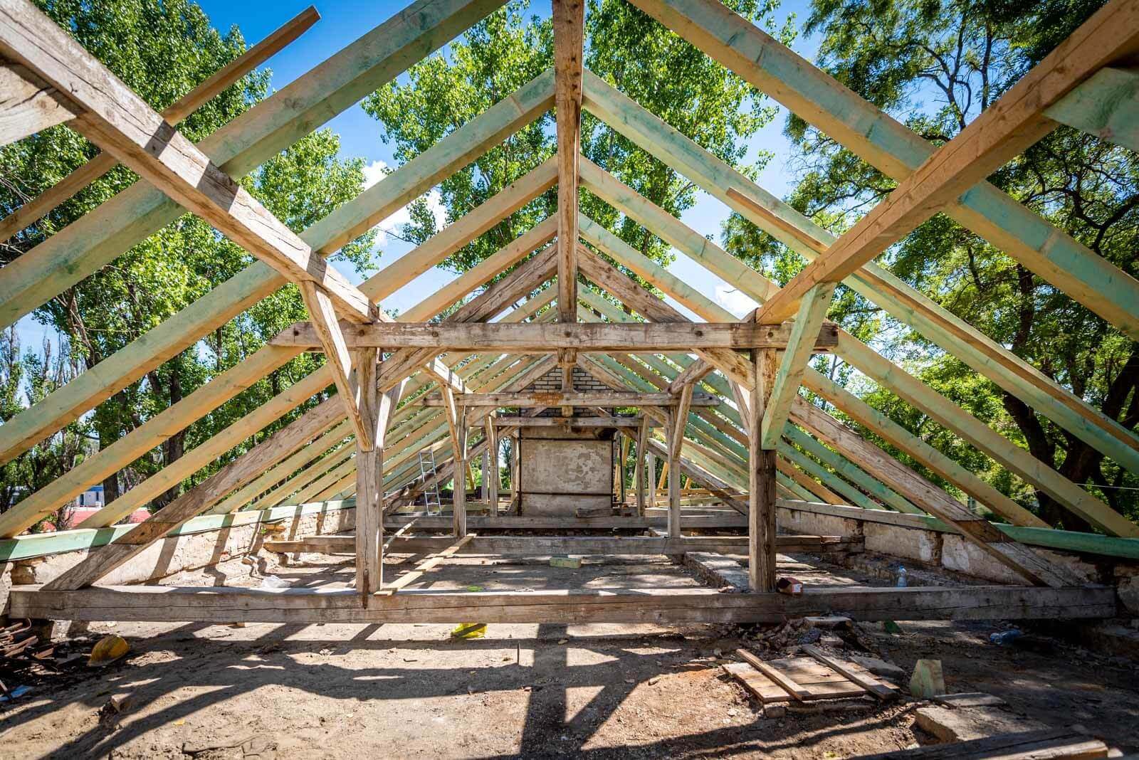 Mind a szarufák, mind a a kötőgerendák, mind a talpgerendák az eredeti méretekben, stílusban és faragásokkal készülnek el, jelentős utánajárás után. Csak a legnagyobb elemeknél használnak többelemű, ragasztott fa megoldásokat.