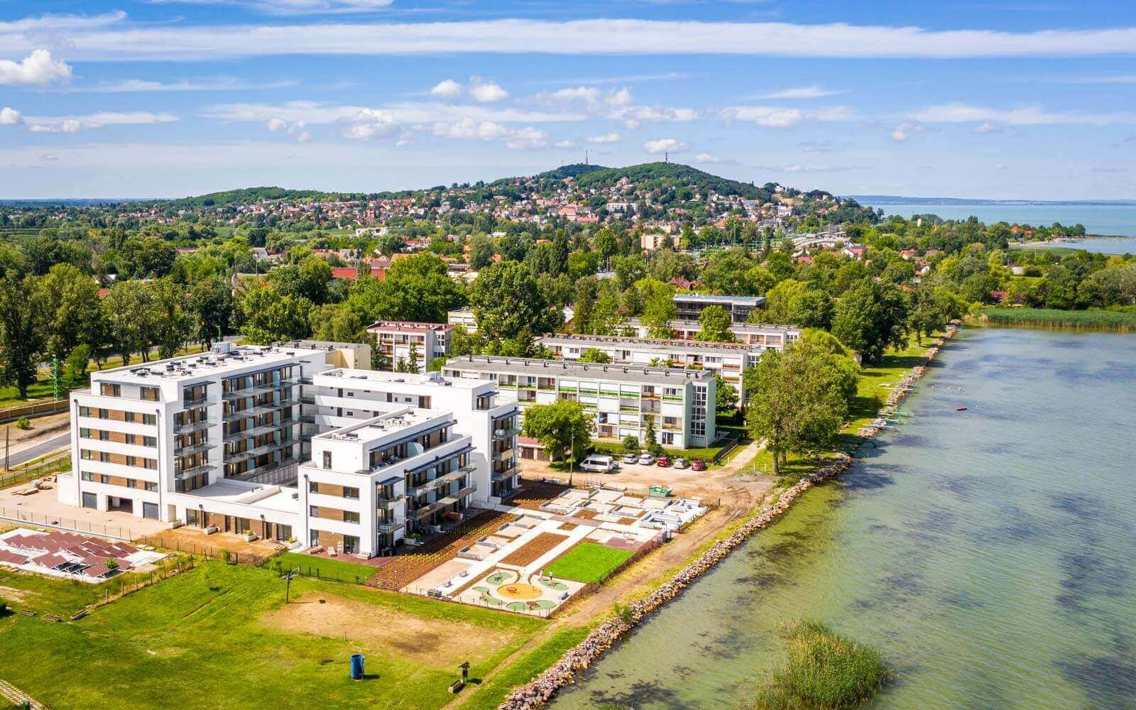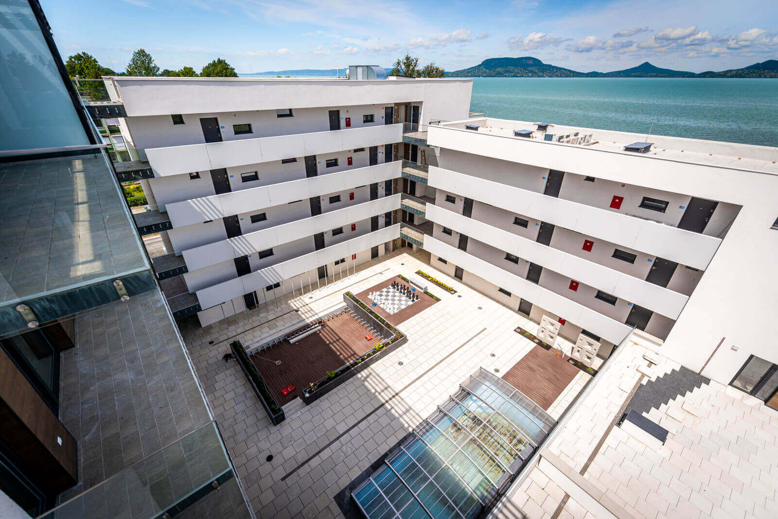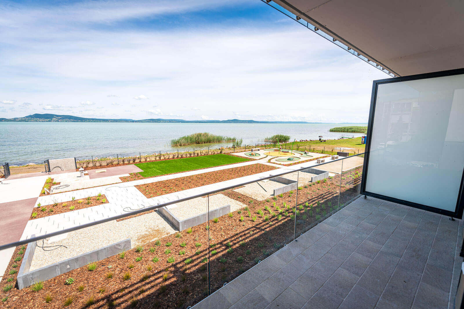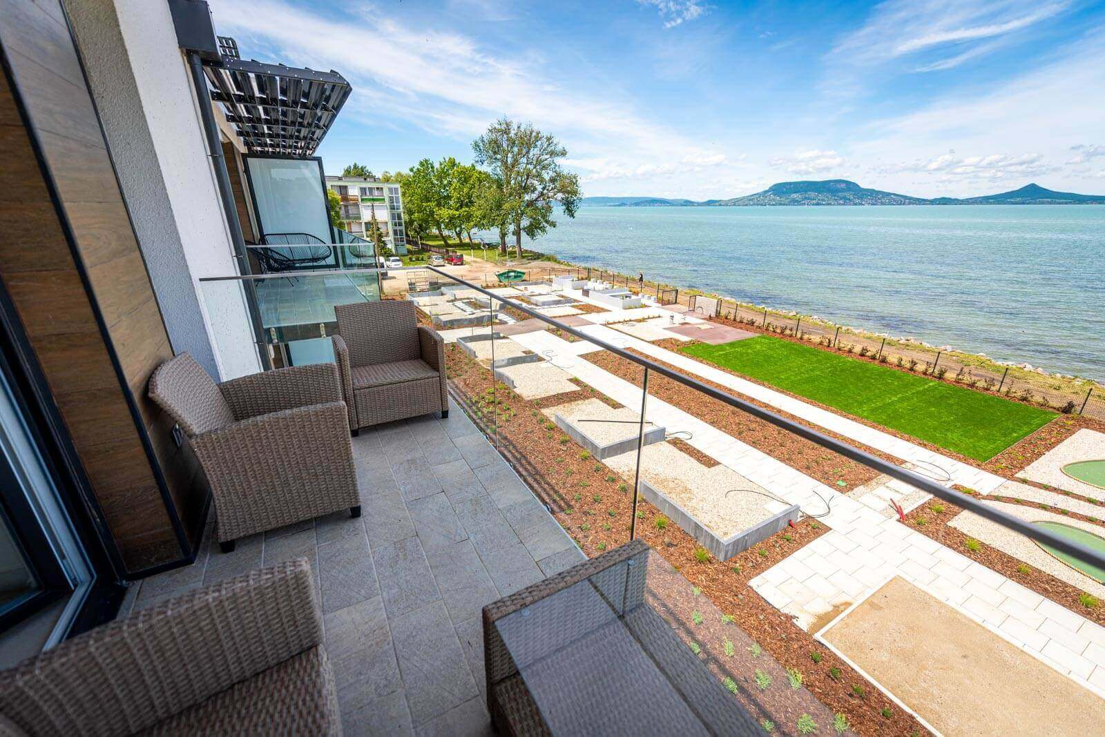 A háznak óriási előnye a Balaton-parti elhelyezkedése, a tervezésből adódó szinte minden lakásnak kijáró balatoni panoráma.
