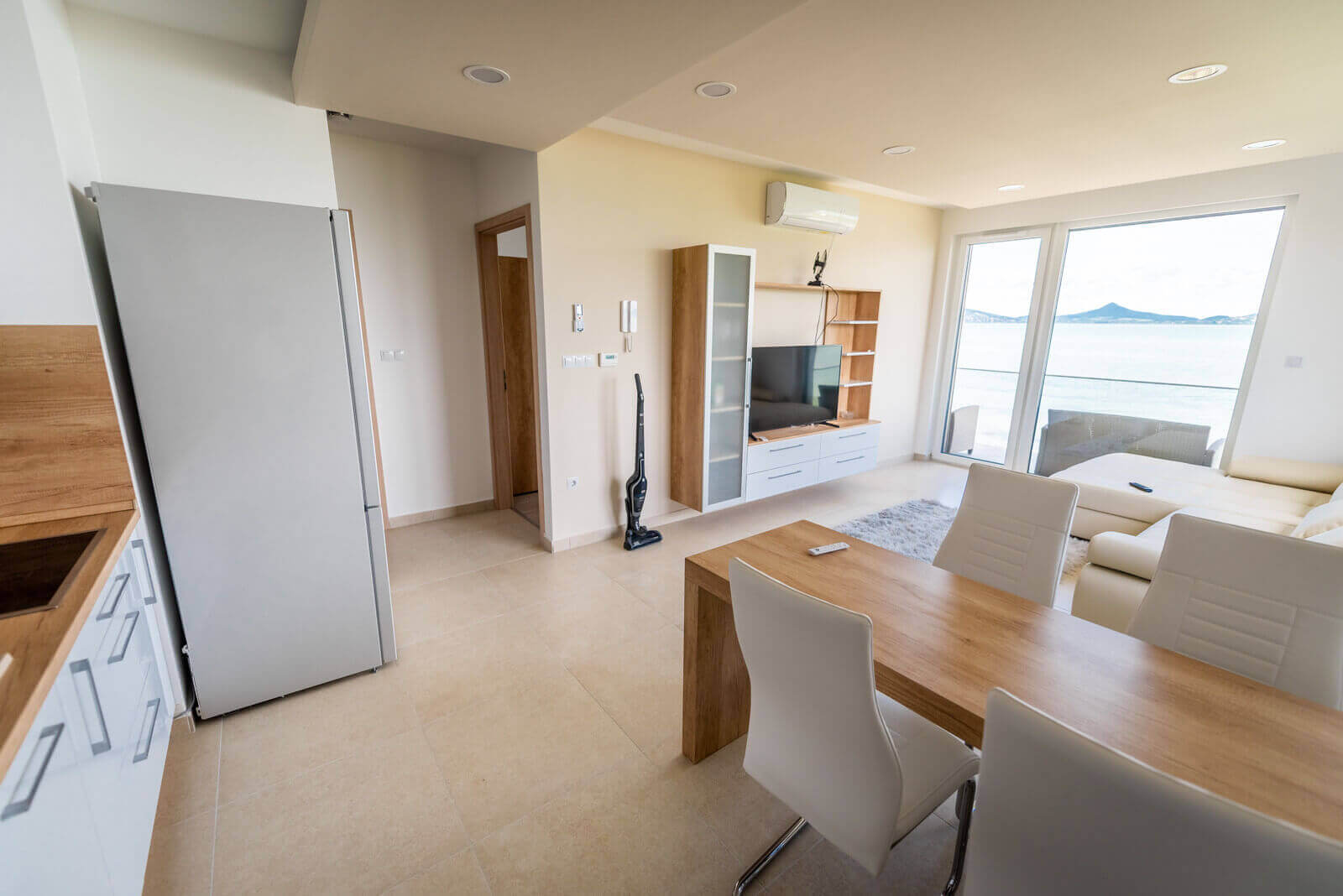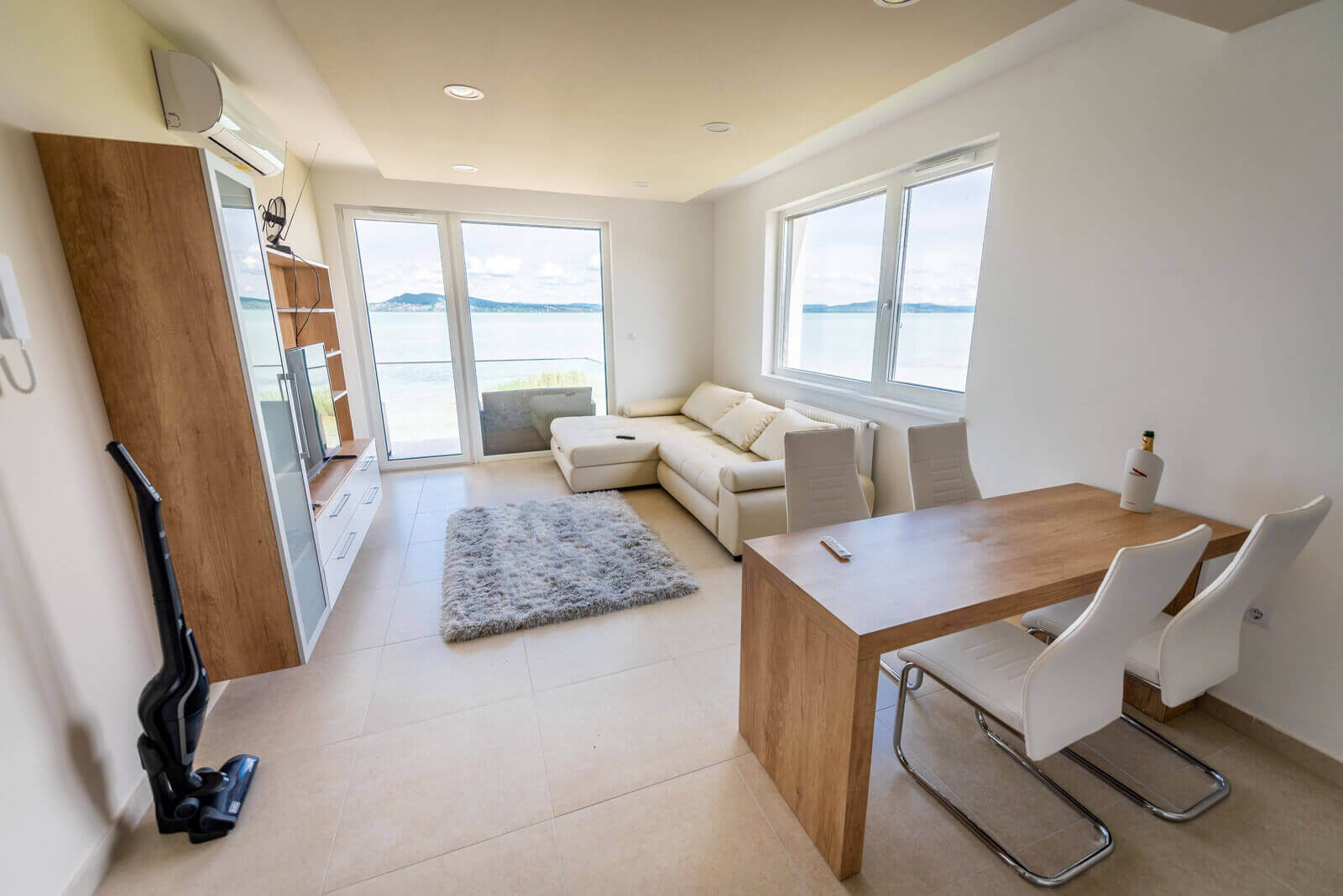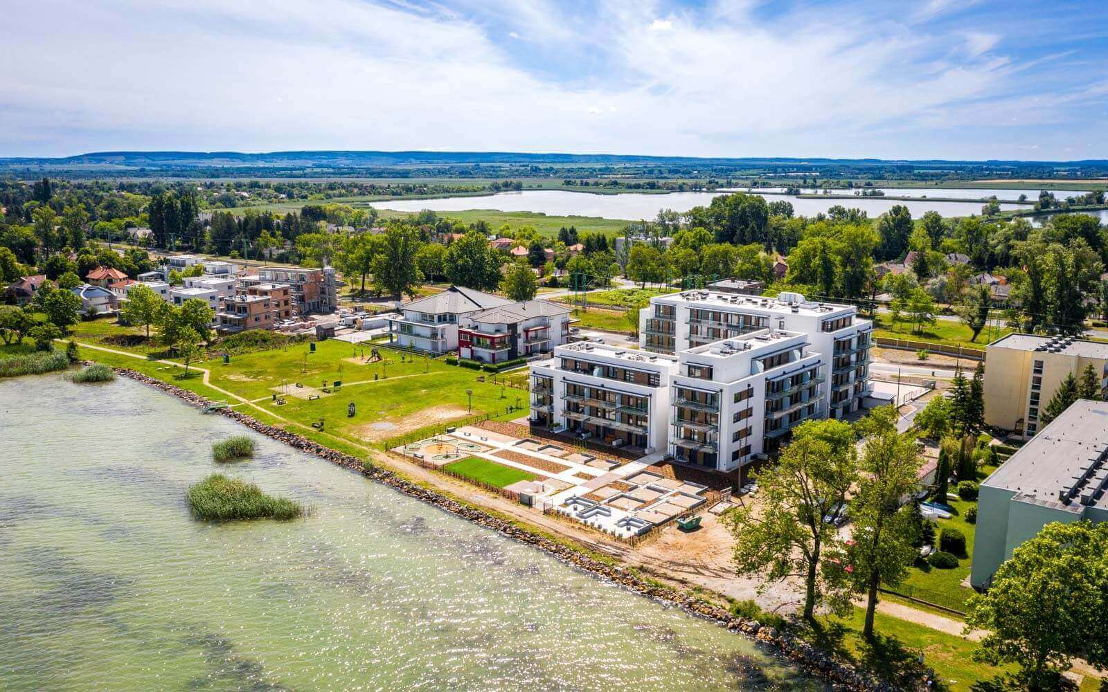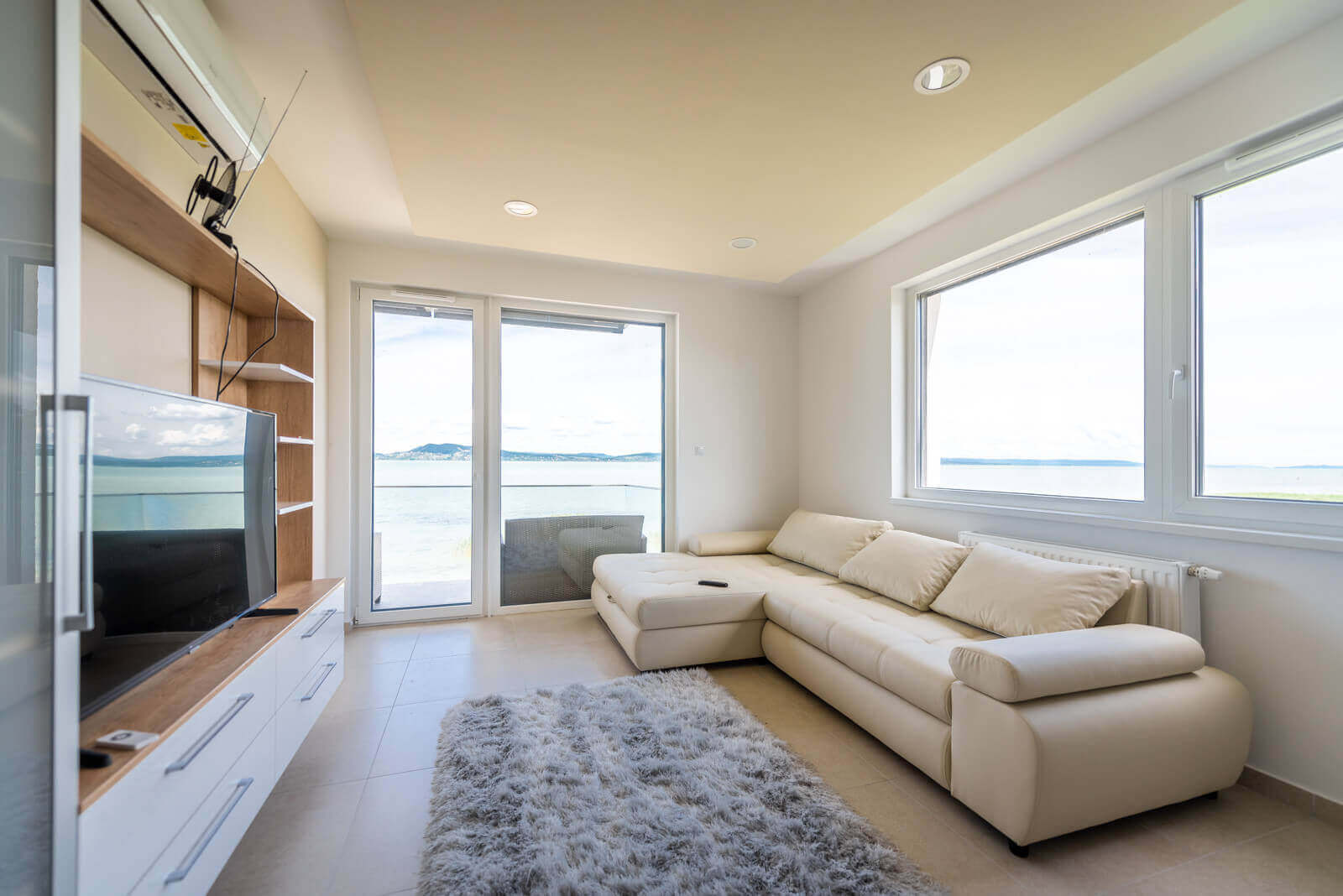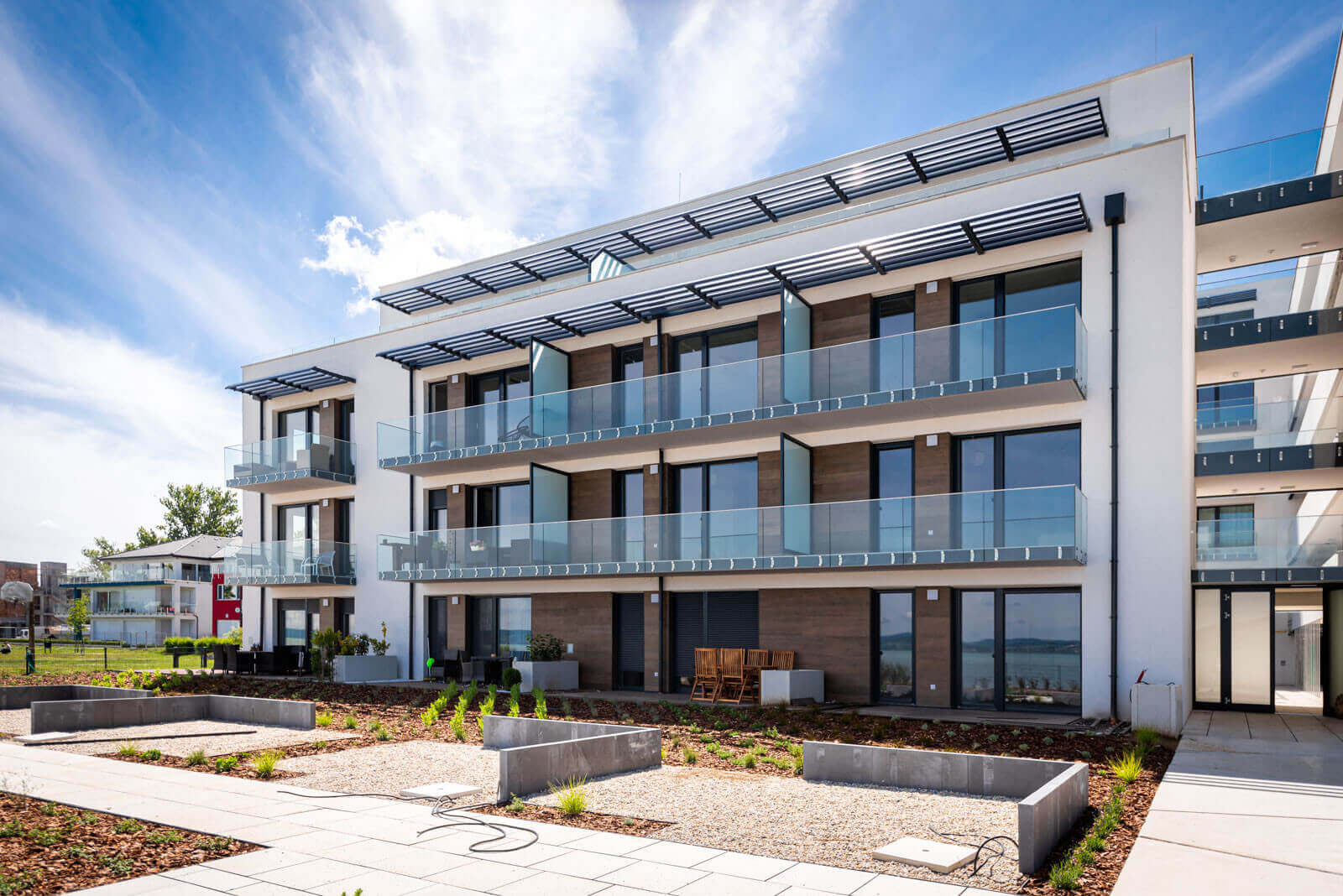 A háznak óriási előnye a Balaton-parti elhelyezkedése, a tervezésből adódó szinte minden lakásnak kijáró balatoni panoráma.