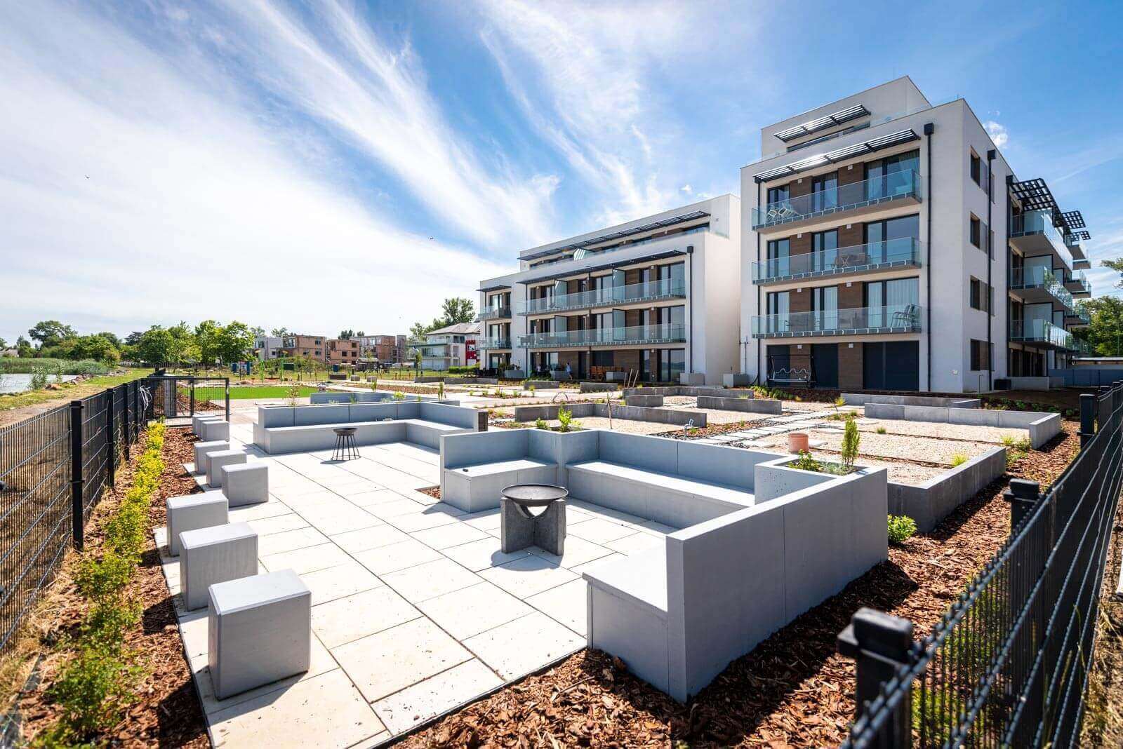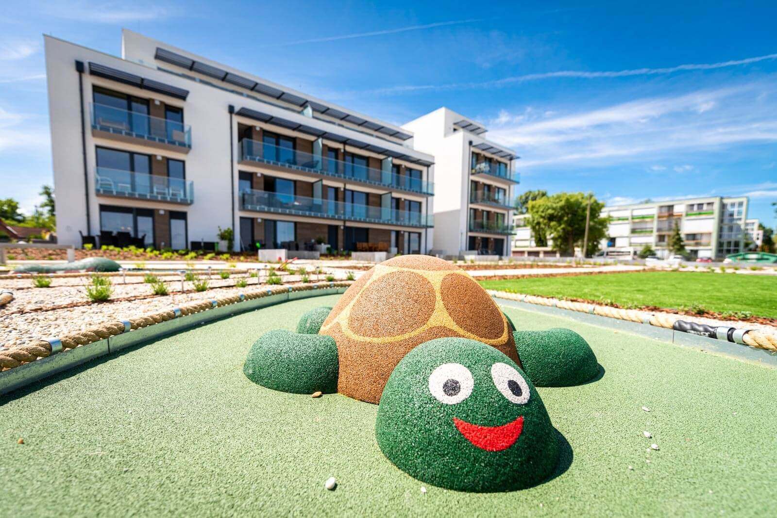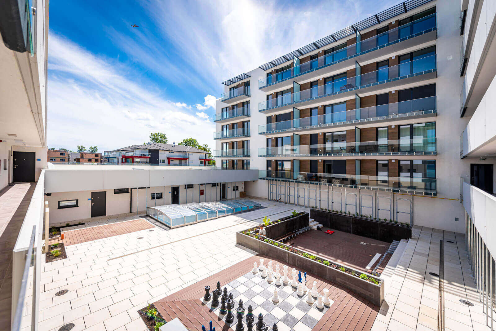 A kert kialakítása, sokszínűsége és többfunkciós használhatósága további élményt ad a lakóknak. A társasháznak önálló medencéje is épült, de kreatív módon a toronydaru alapja is sakktáblaként került hasznosításra.