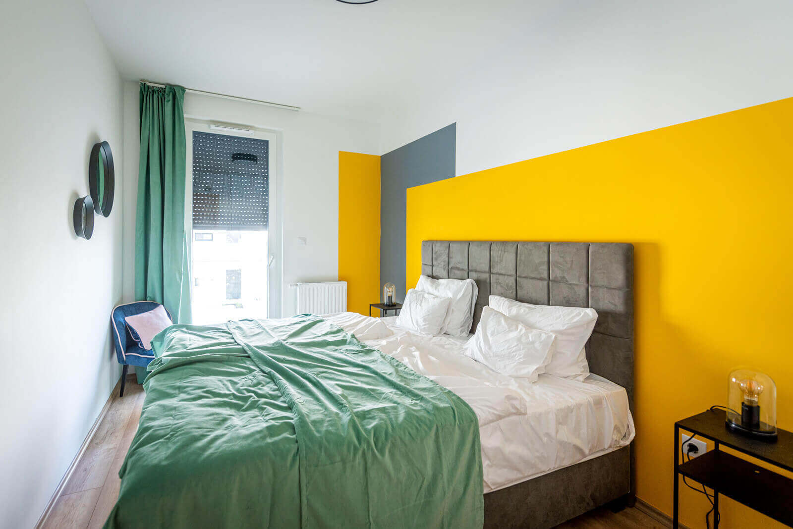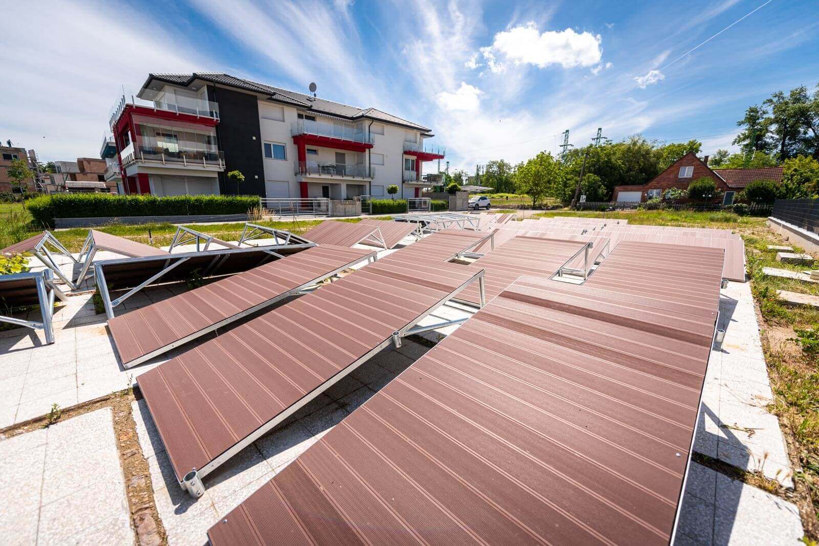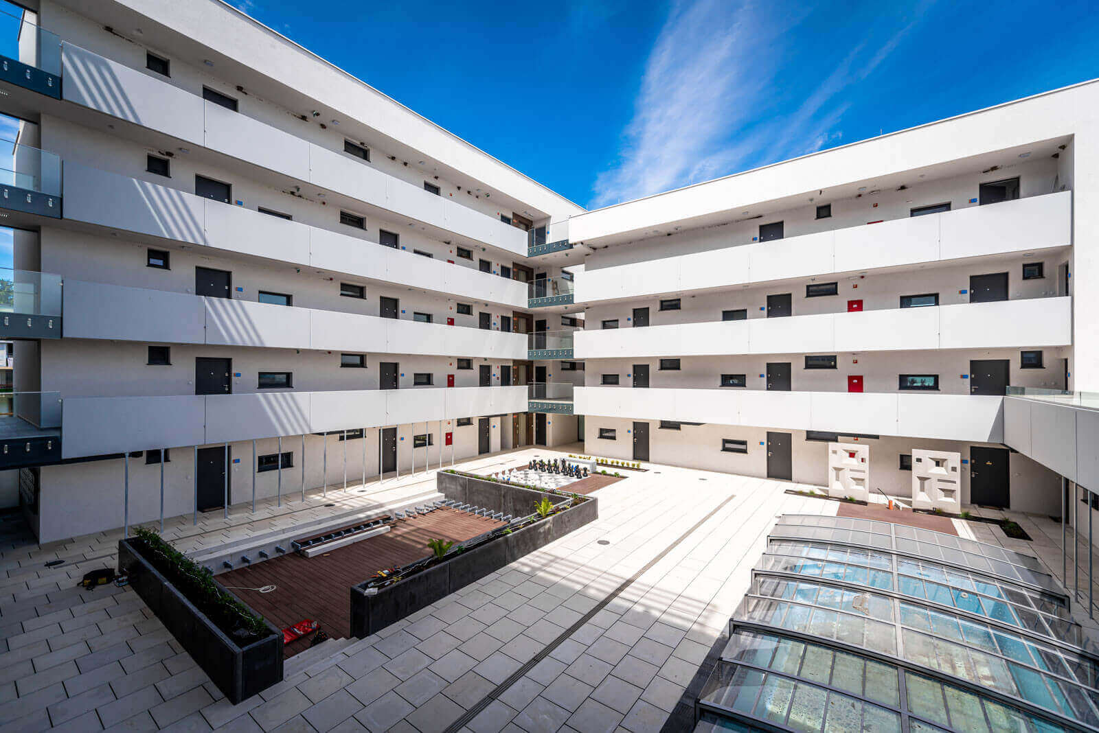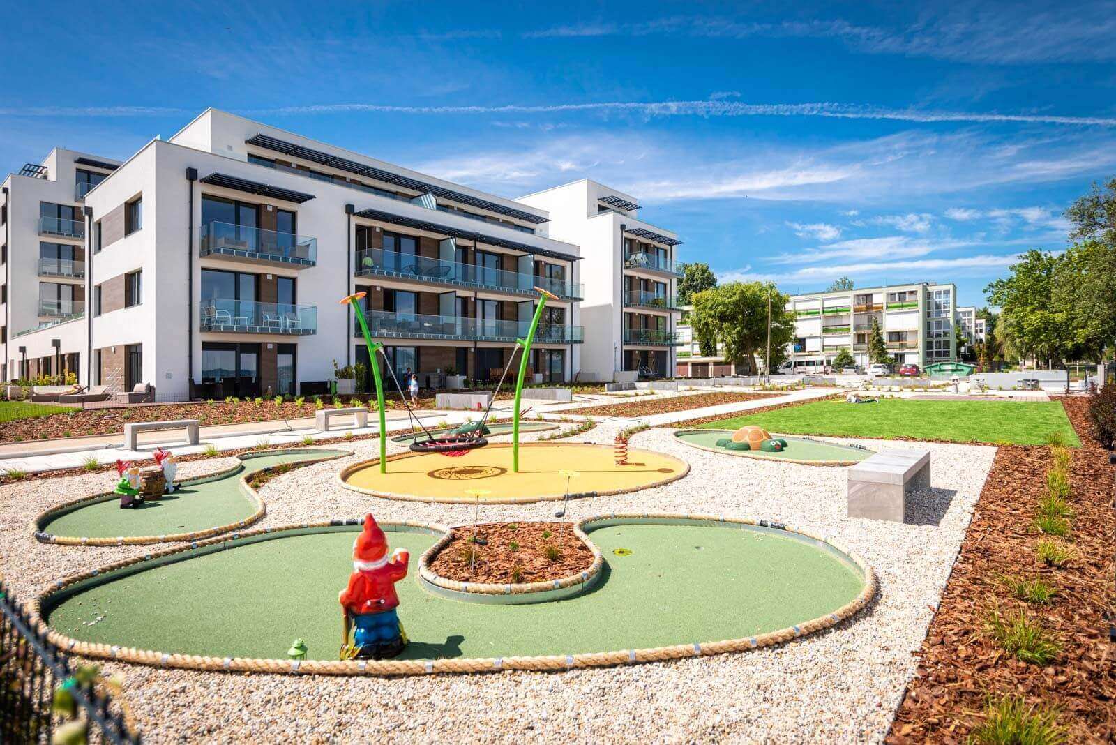 A kert kialakítása, sokszínűsége és többfunkciós használhatósága további élményt ad a lakóknak. A társasháznak önálló medencéje is épült, de kreatív módon a toronydaru alapja is sakktáblaként került hasznosításra.