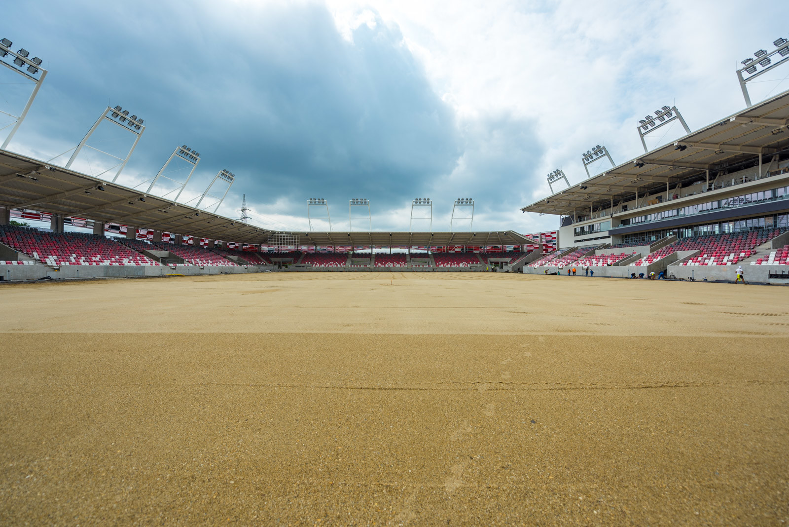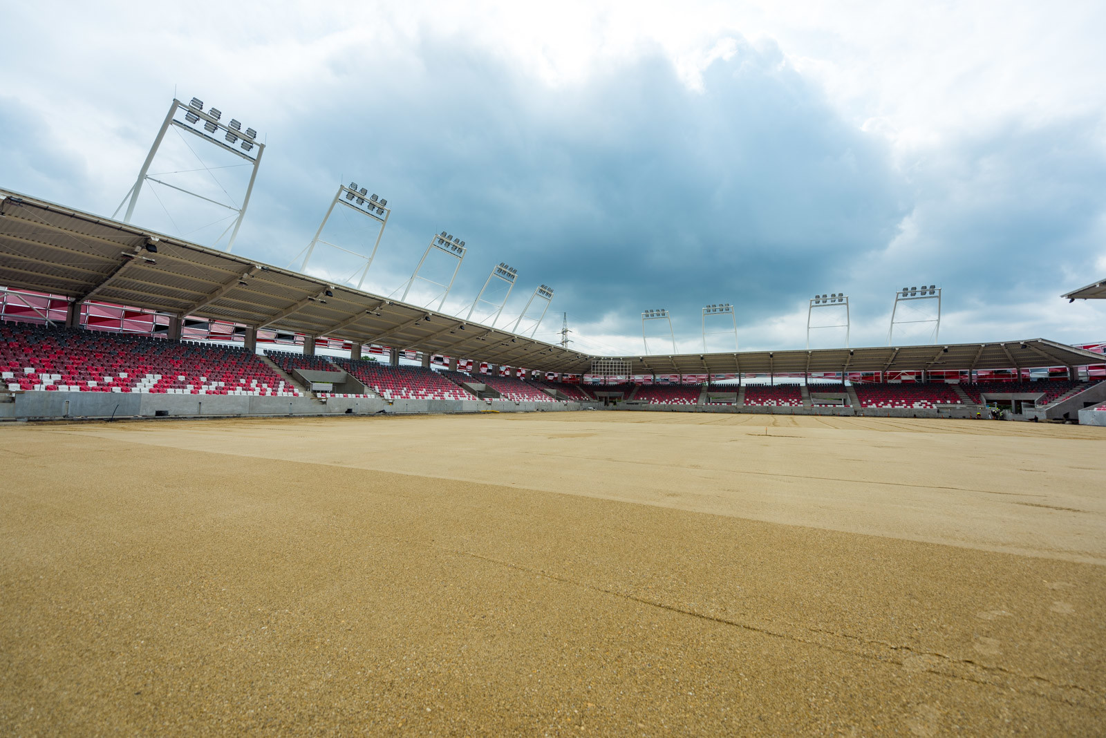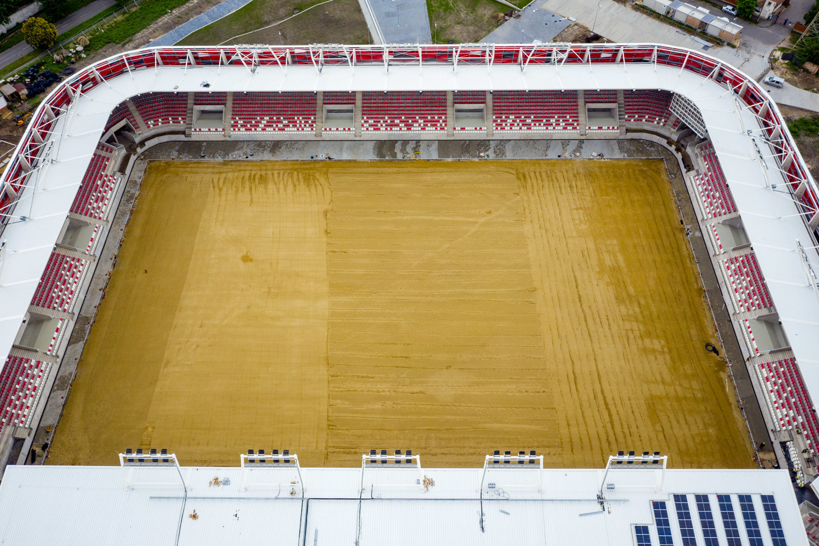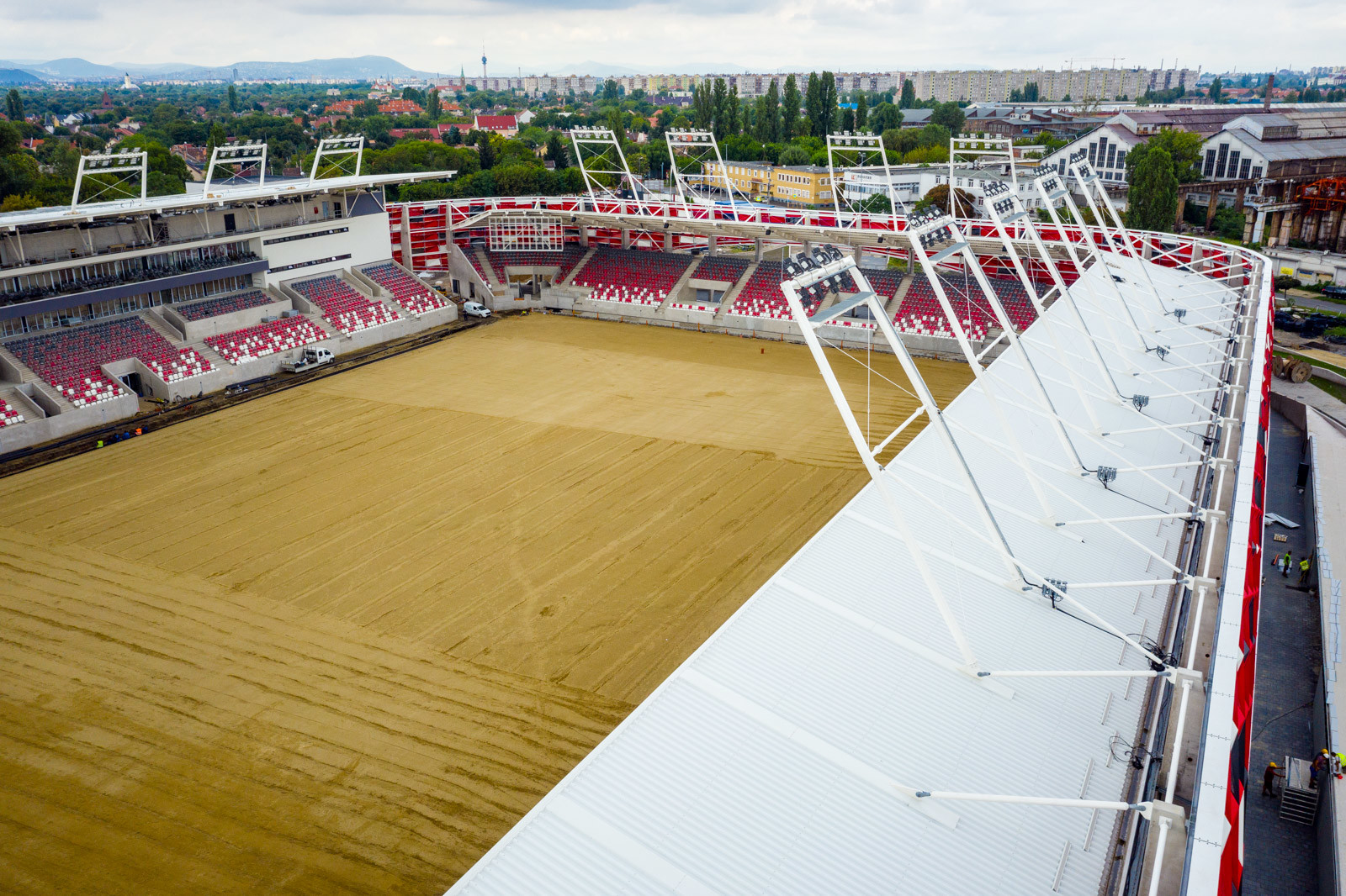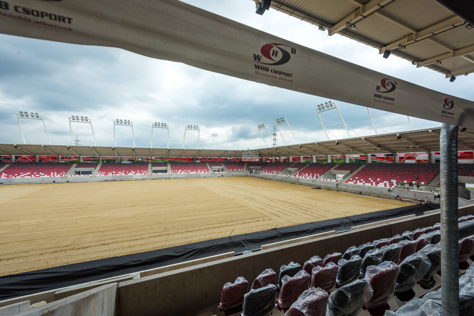 jöhetnek az üzempróbák és a gyepszőnyeg telepítése, valamint a lelátó grafikai kialakítása a klub színeivel.