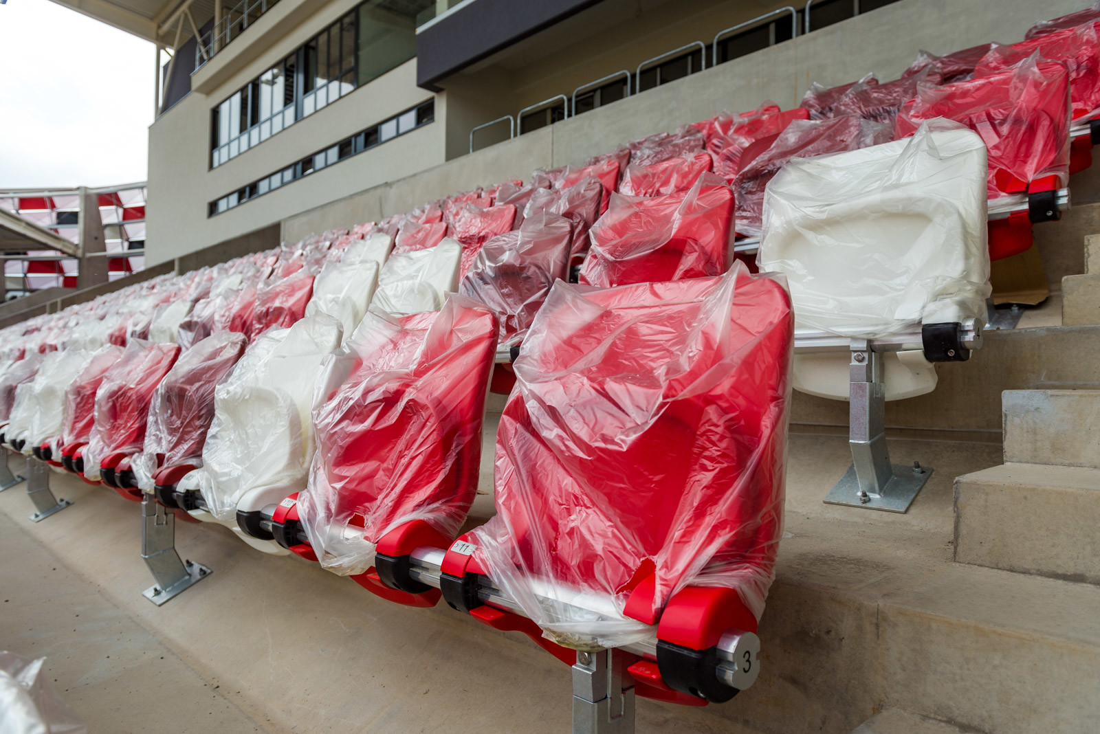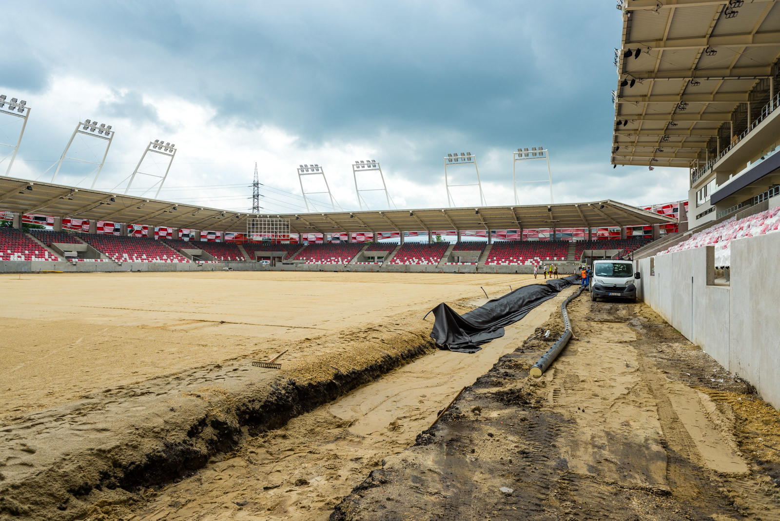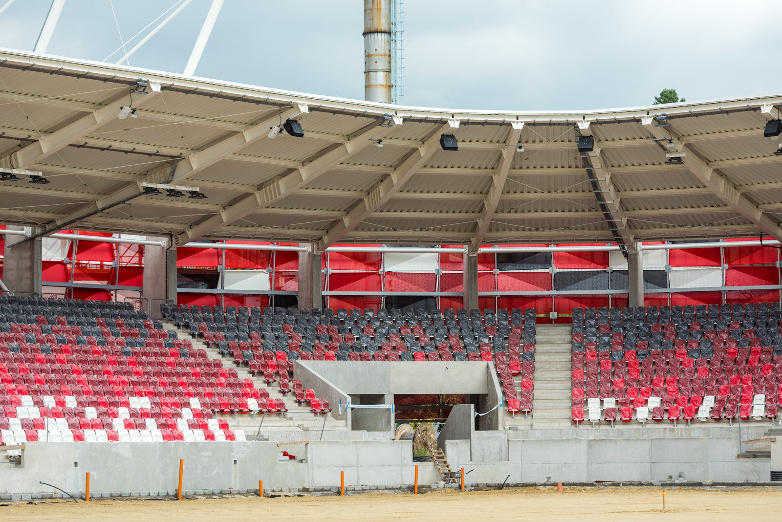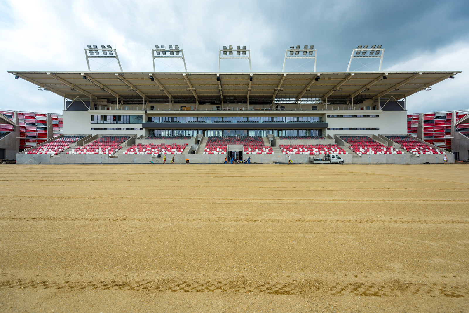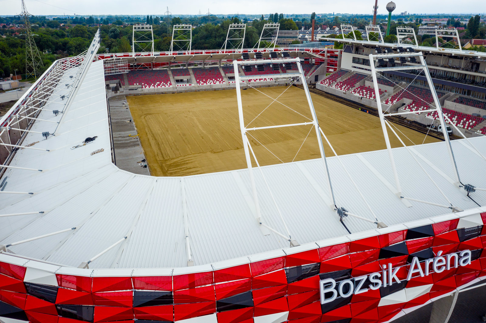 jöhetnek az üzempróbák és a gyepszőnyeg telepítése, valamint a lelátó grafikai kialakítása a klub színeivel.