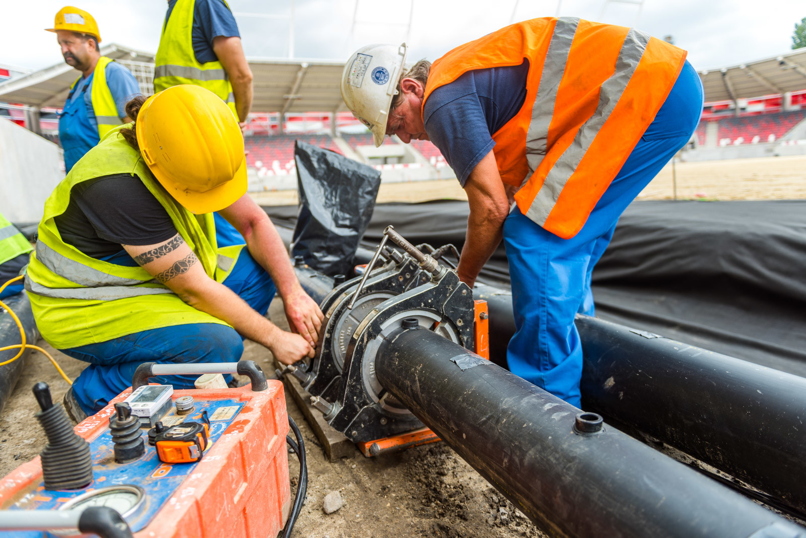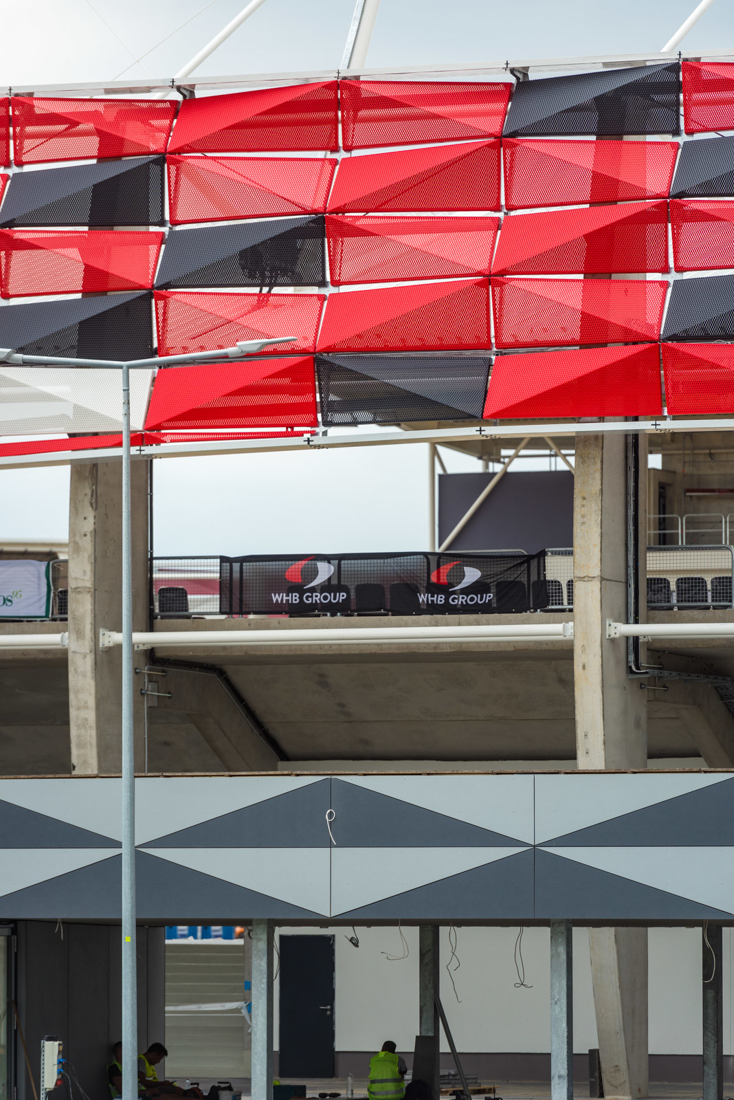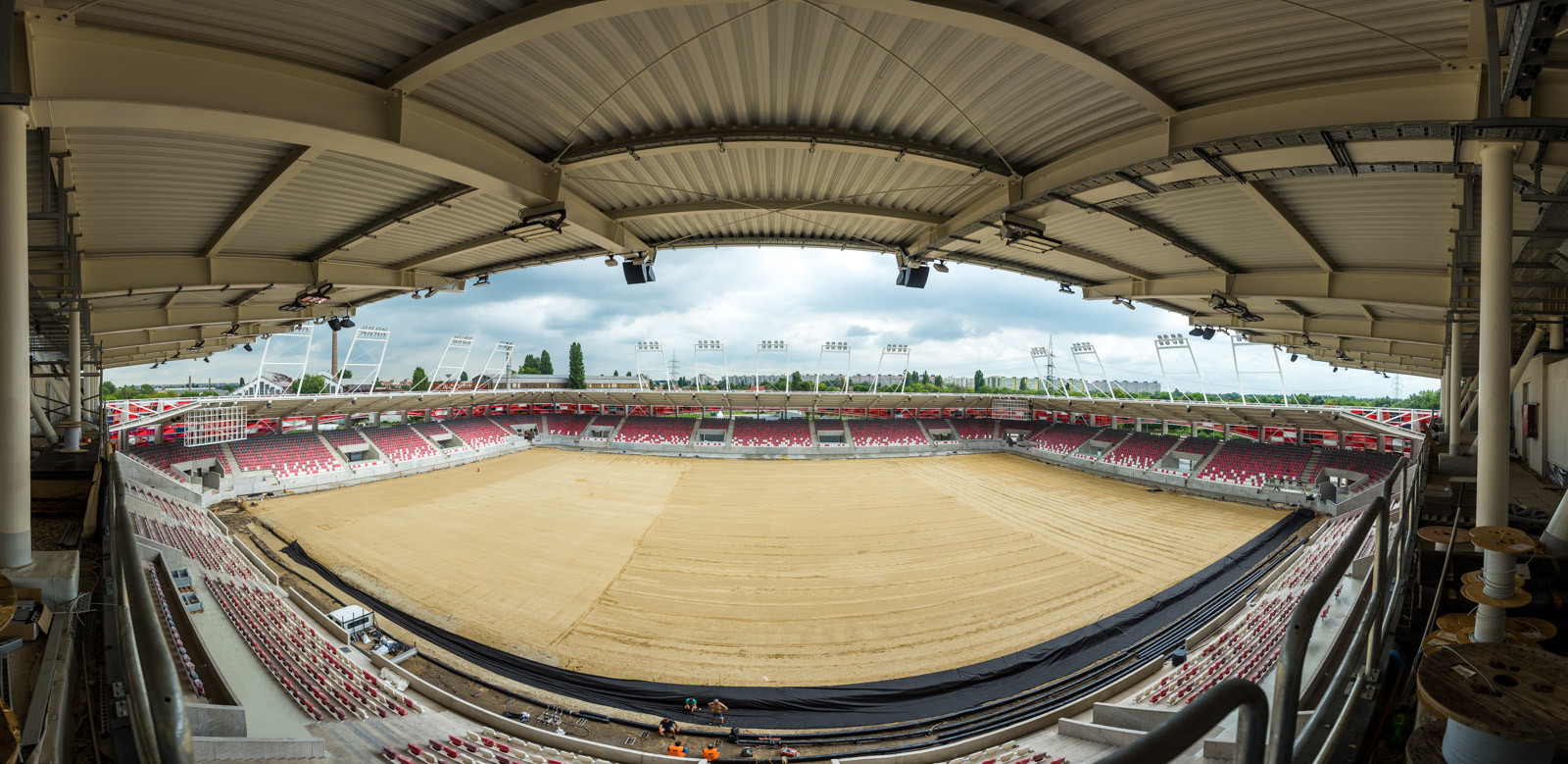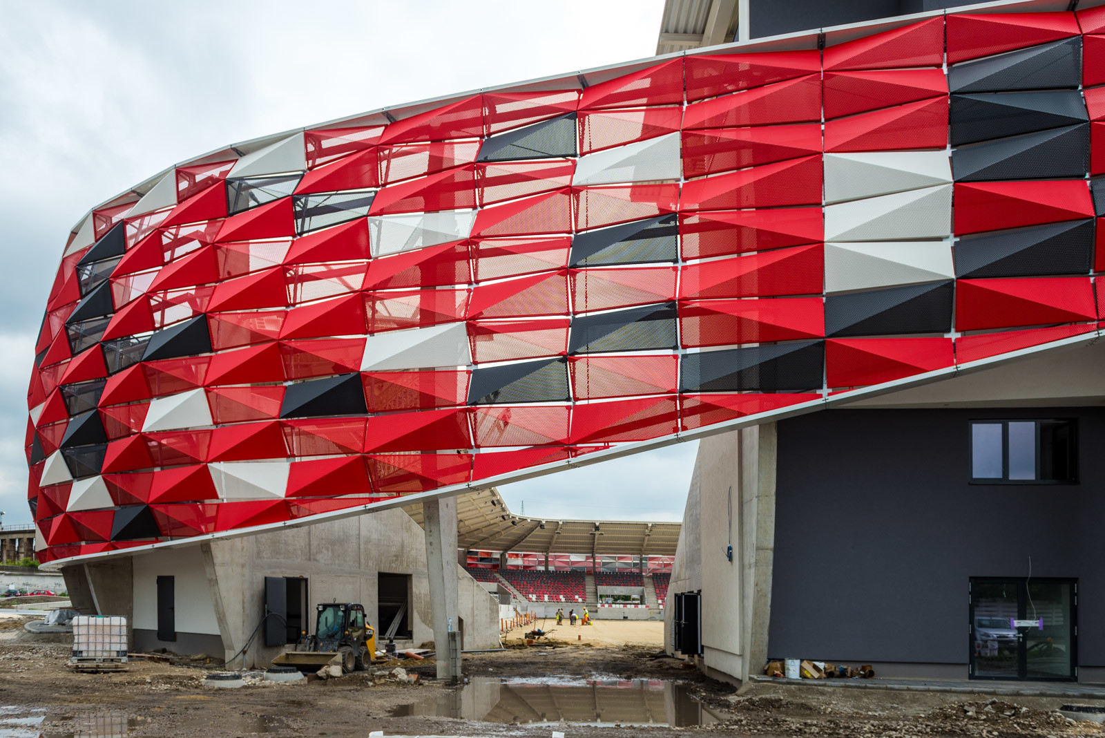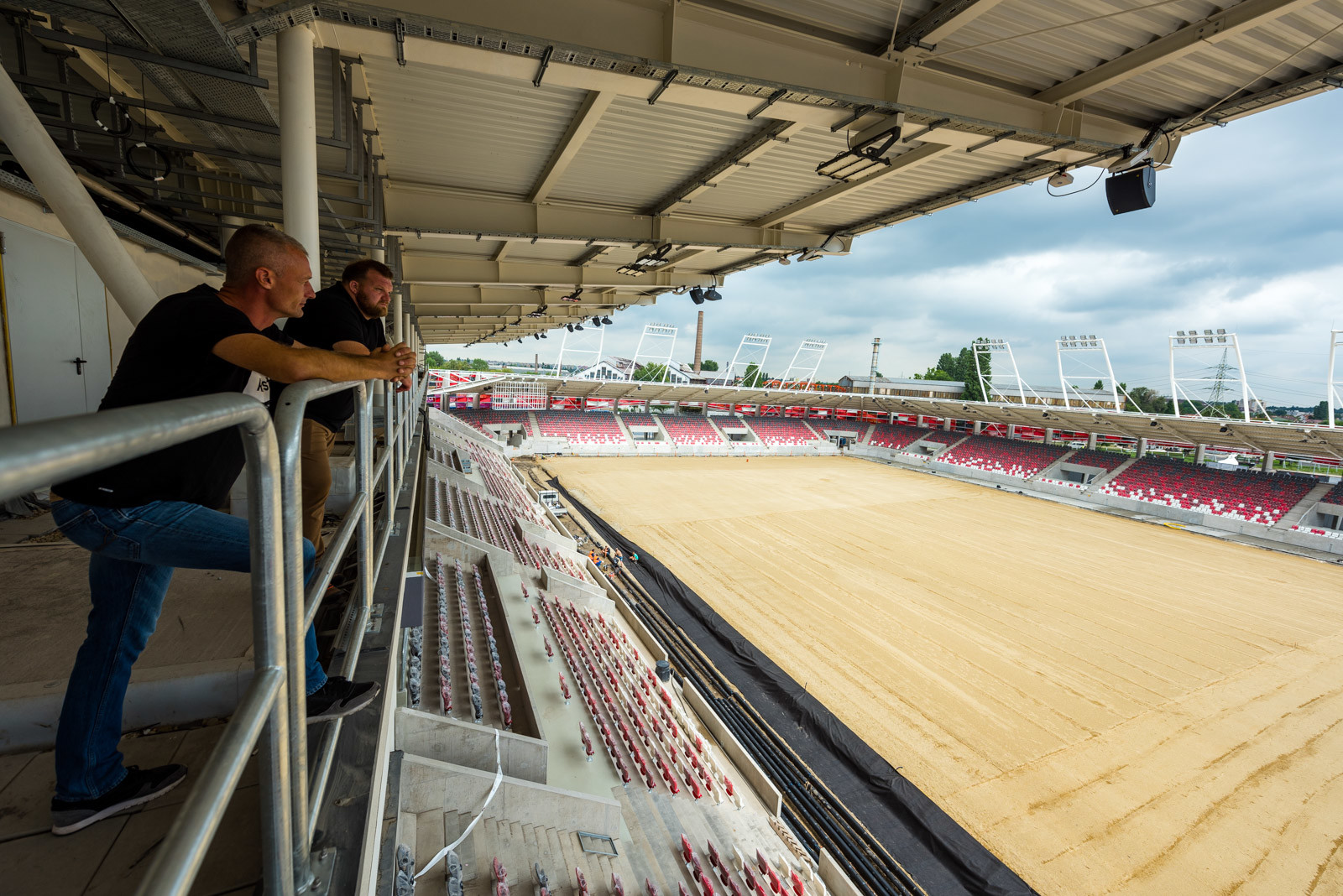jöhetnek az üzempróbák és a gyepszőnyeg telepítése, valamint a lelátó grafikai kialakítása a klub színeivel.