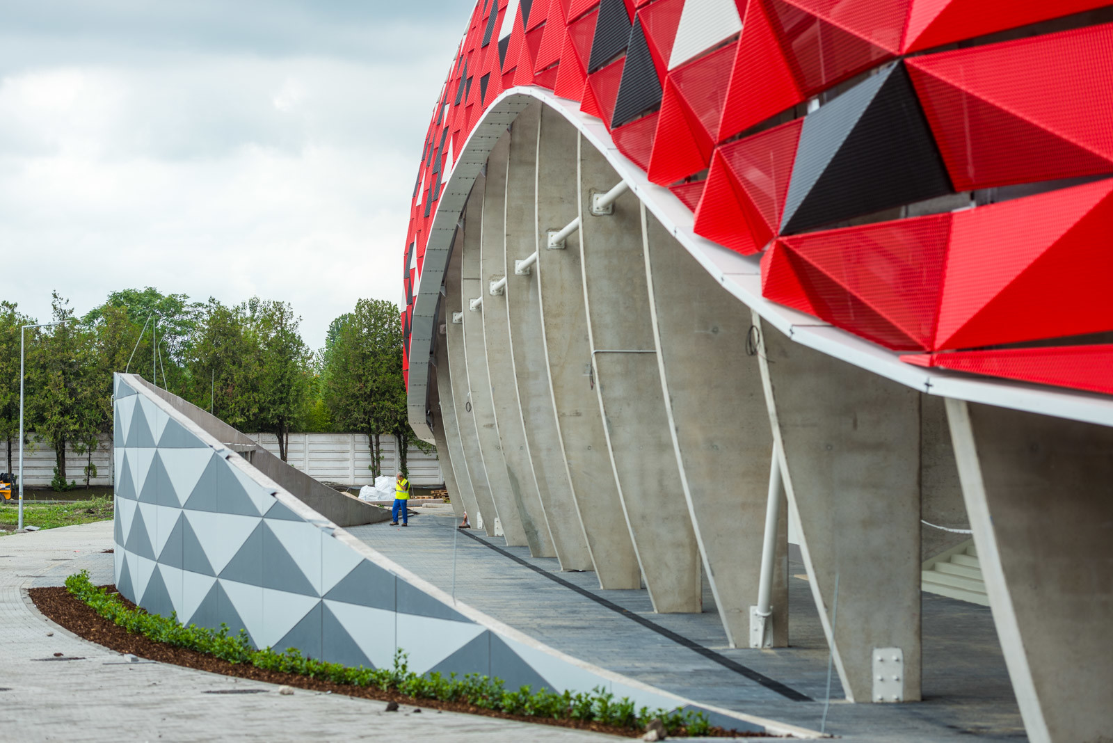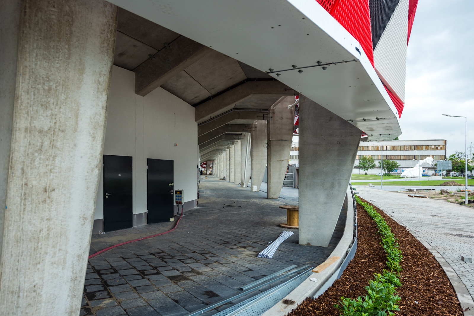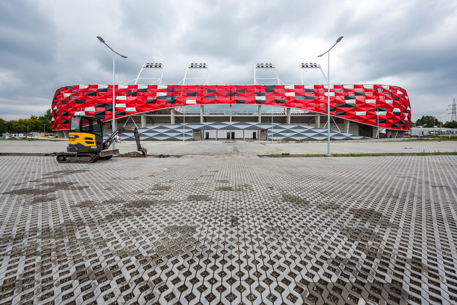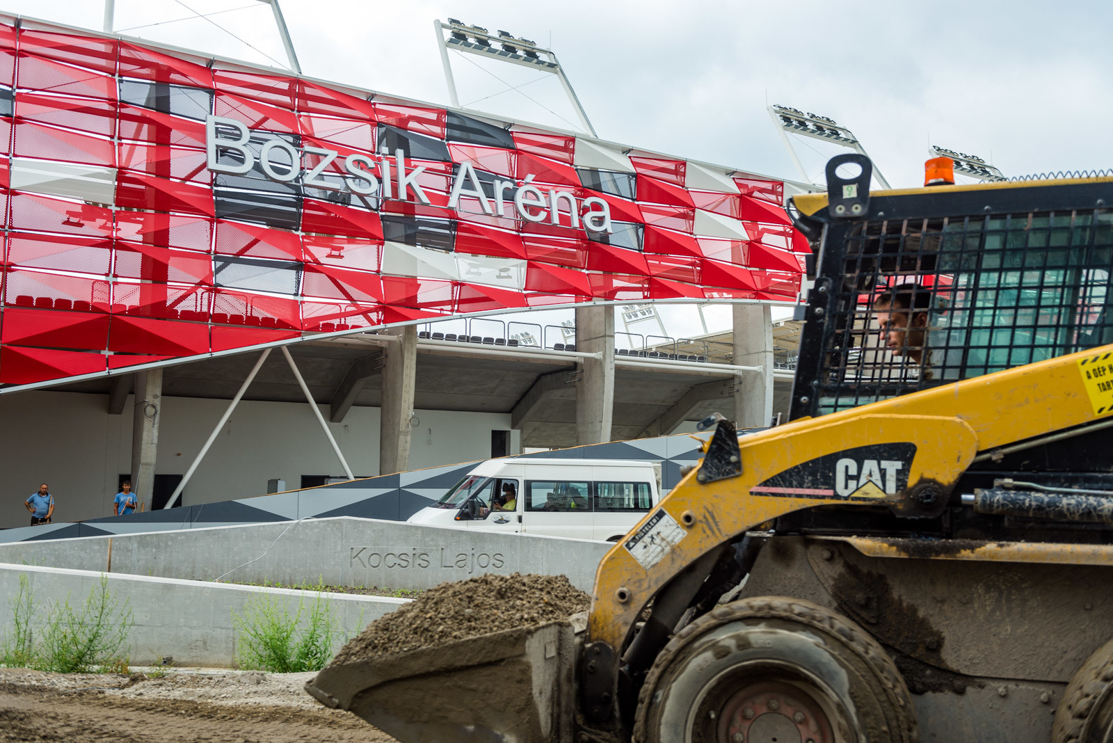 A külső területen a parkolók építése mellett folyamatosan halad a füvesítés és a növénytelepítés is, a küzdőtéren pedig már a sportpálya alépítményeit építik. Ezt követően egyre látványosabb lépések következnek: