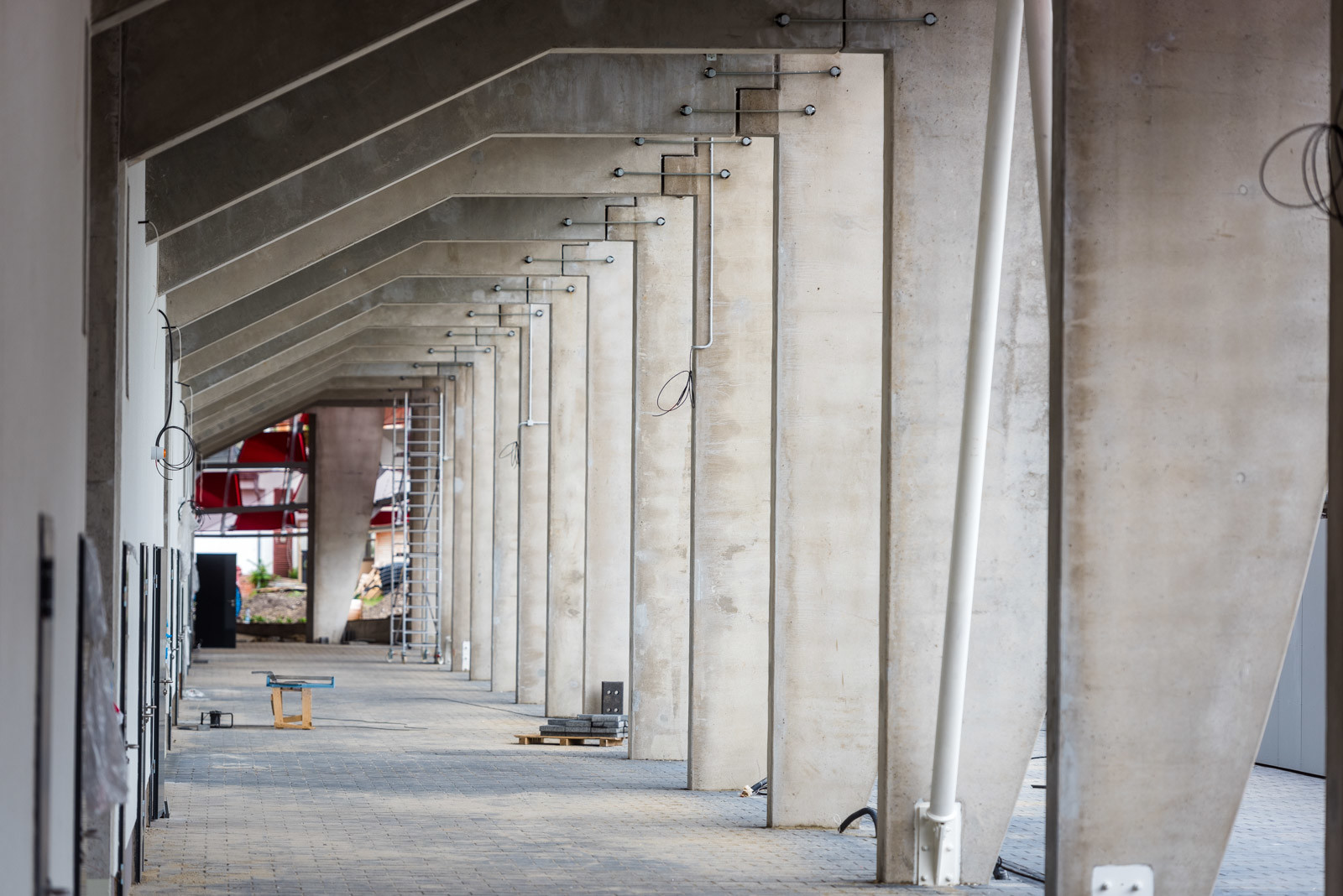 Az ívelt homlokzat és a vasúti híd egyaránt különleges kihívást jelentett a West Hungária Bau és a Pharos '95 alkotta konzorciumnak, amely már a gépészeti és melegburkolási munkáknál tart.