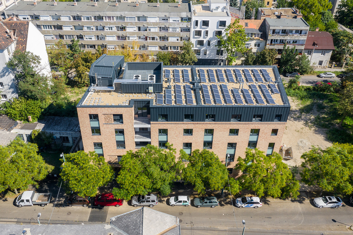 A tetőn elhelyezett napelemek közel teljes mértékben fedezik az energiafogyasztást, az épület az elkészült energetikai tanúsítvány szerint: AA++ besorolású.