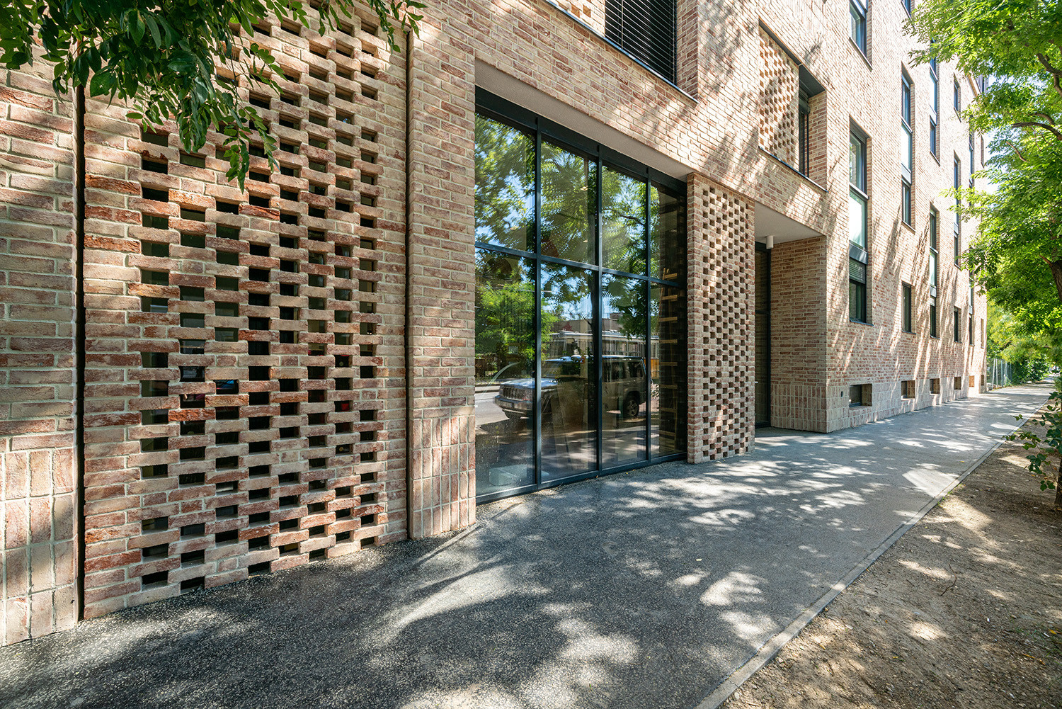 homlokzata a harmadik emeletig ragasztott rusztikus klinkertégla lapburkolatot kapott, míg a negyedik emeleten állókorcos fémlemez burkolatot.