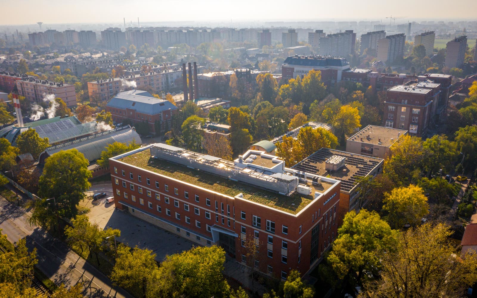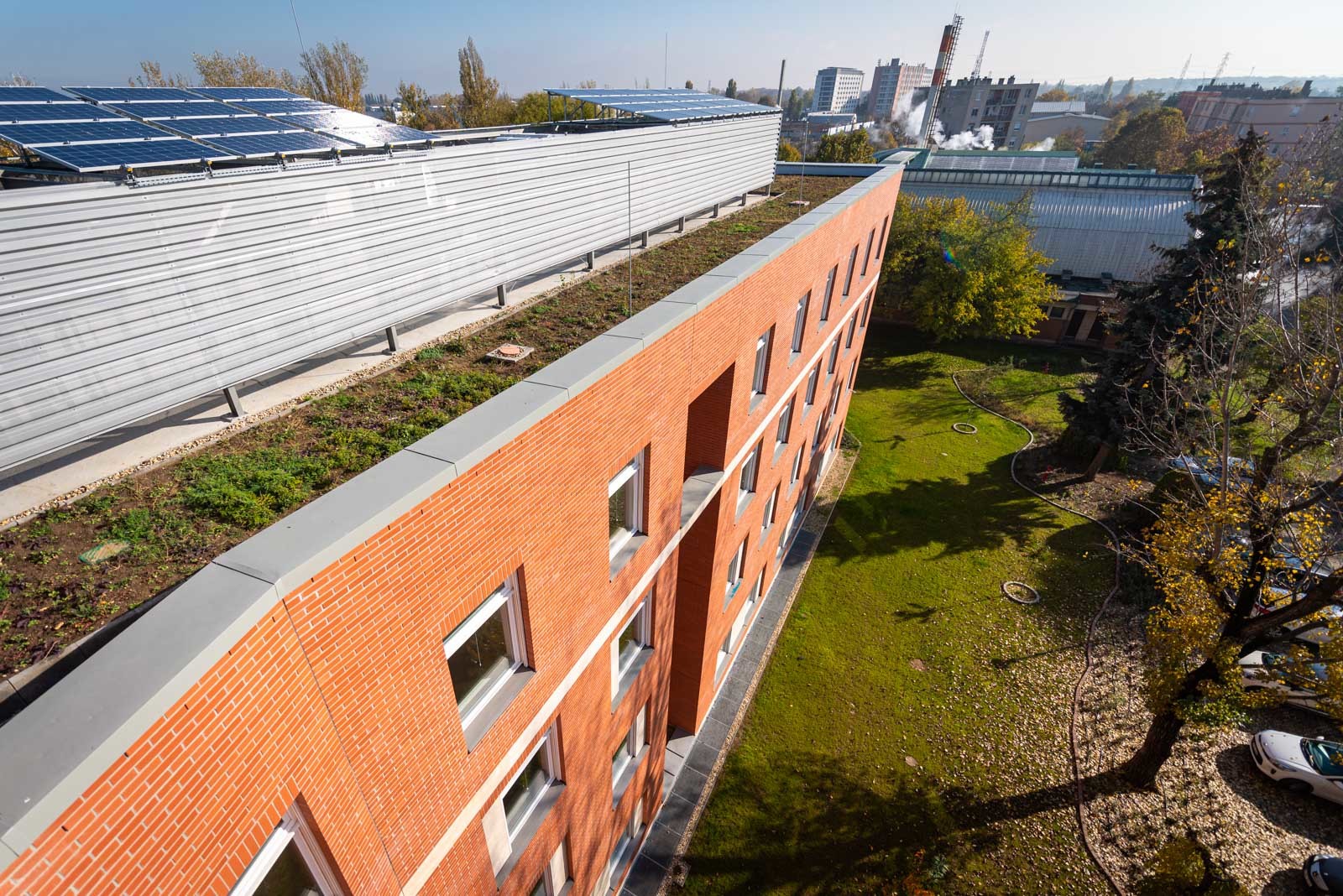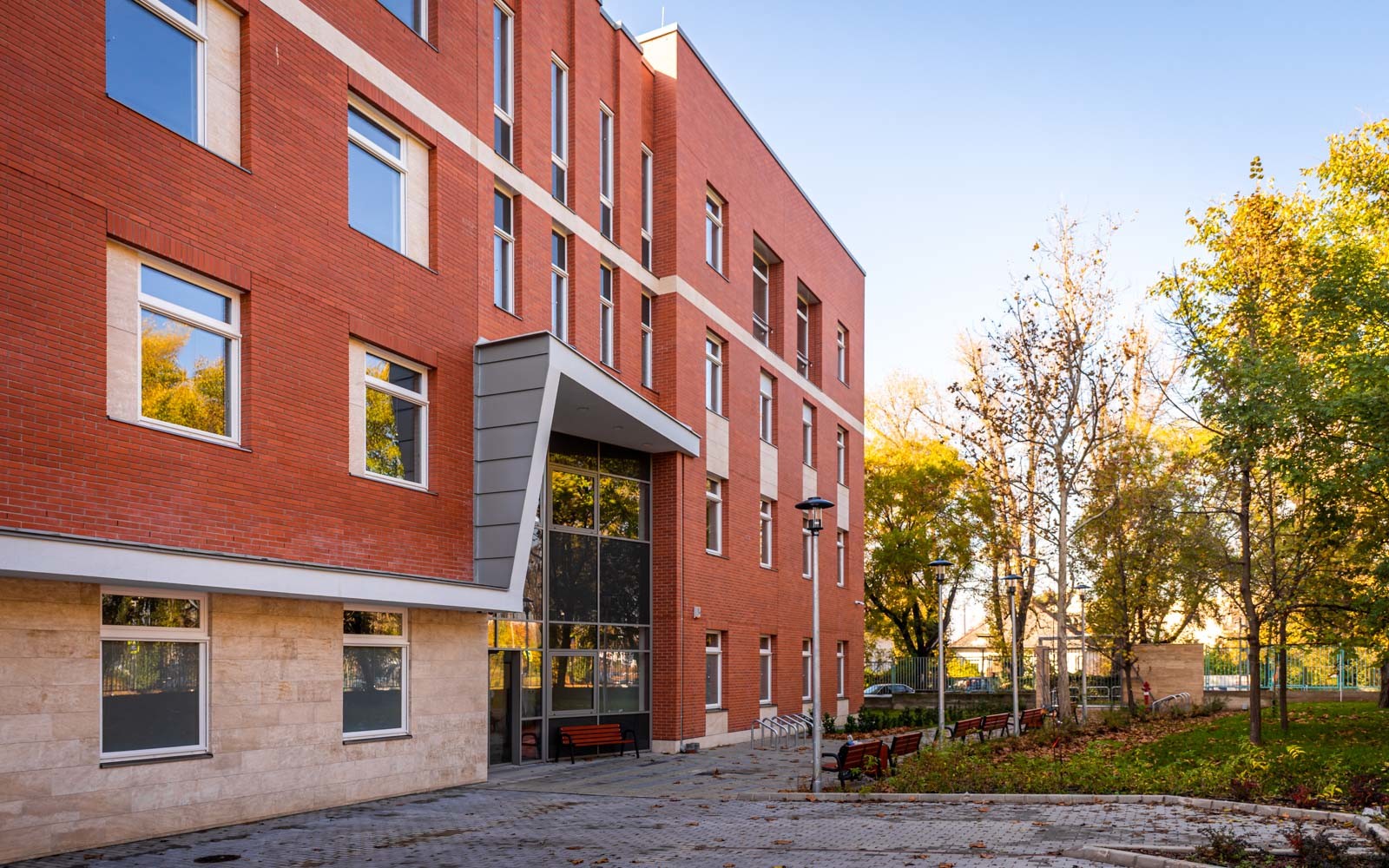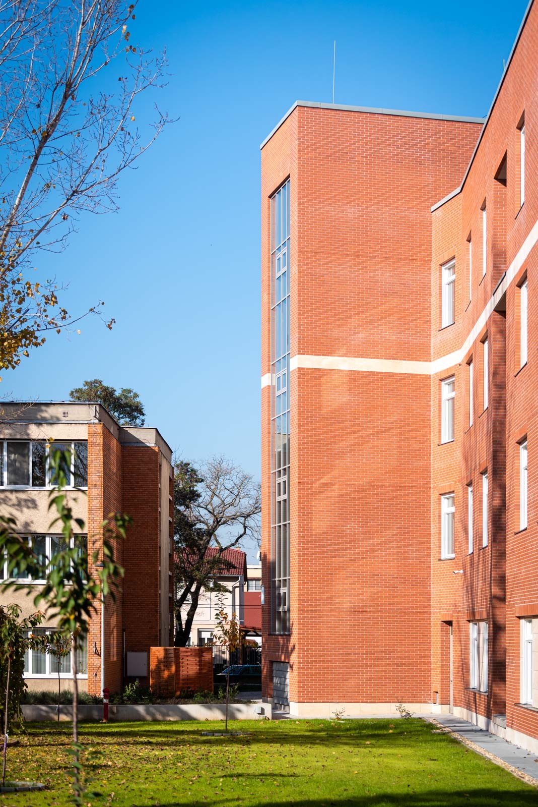 Az L alakot formáló épületet a Bajcsy Zsilinszky Kórház- és Rendelőintézet Maglódi úti központjában építették fel.