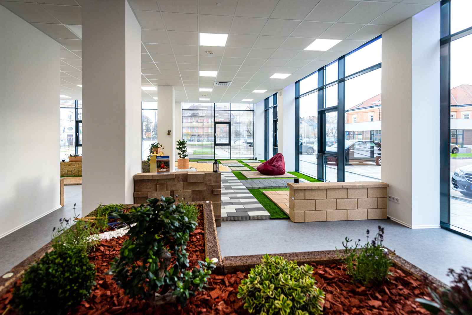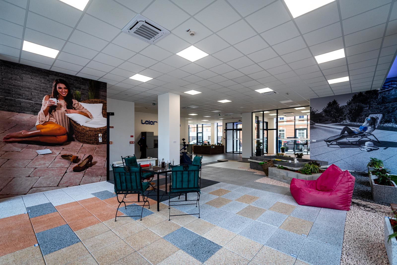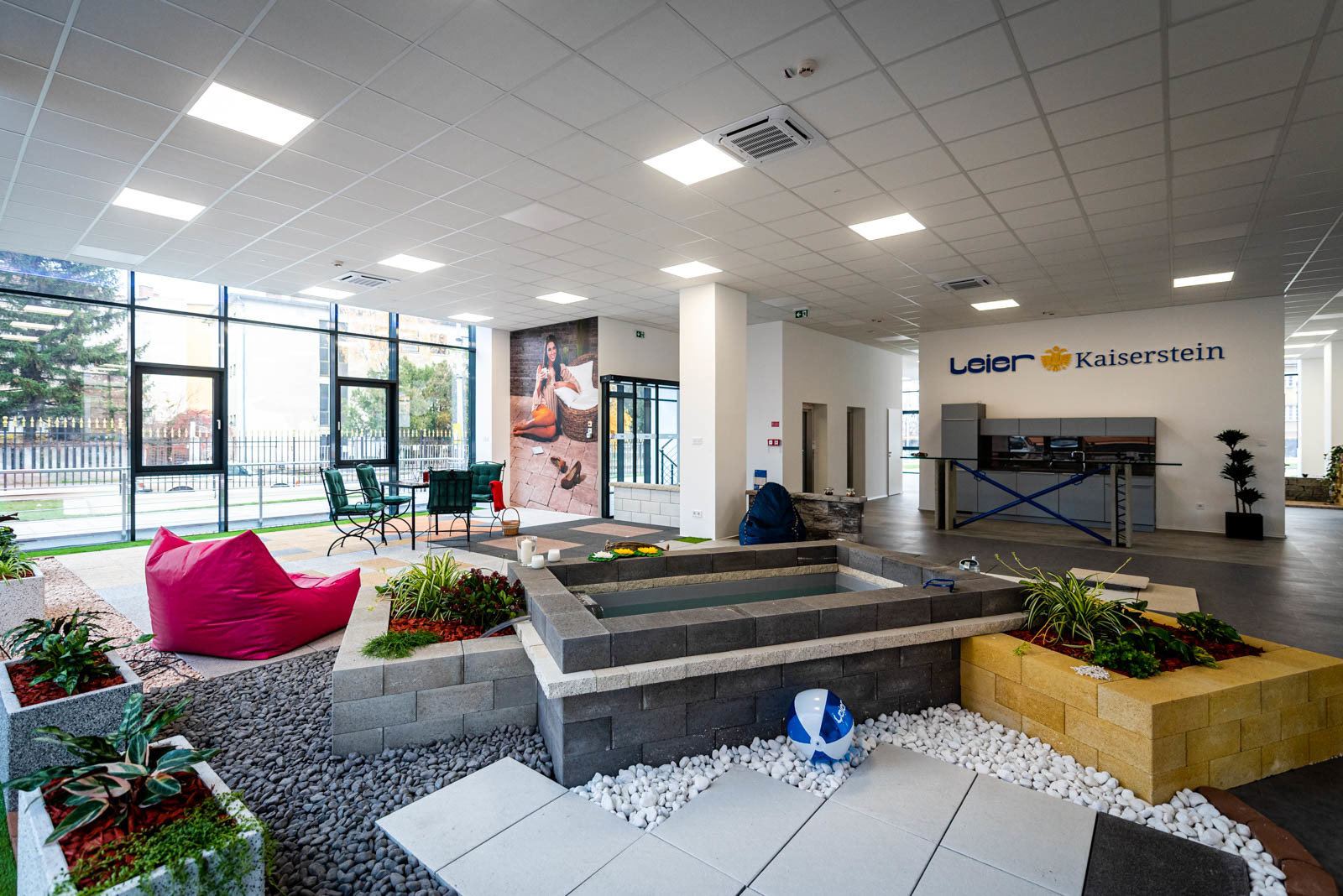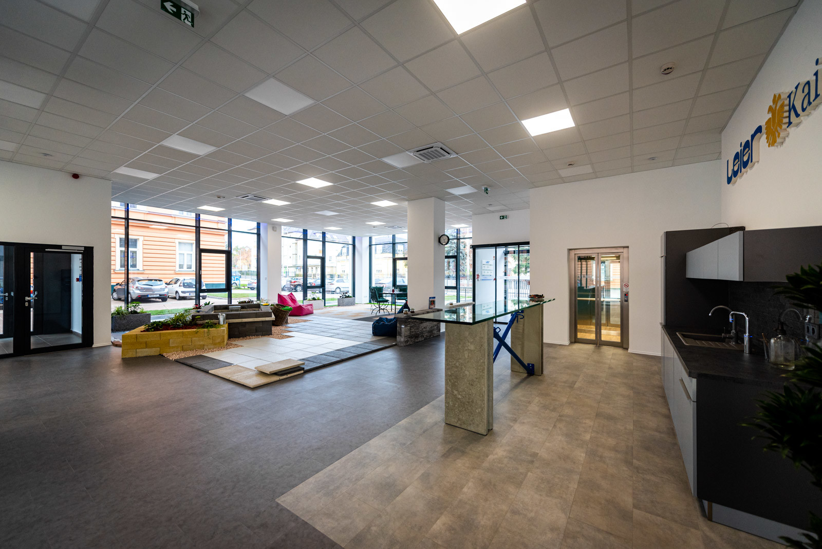 A földszinti részen található a Leier Kaiserstein Galéria, ahol prémium kertépítési termékek színesítik a teret. A Galéria megnyitásával lehetőség nyílik az ügyfeleket nem csupán irodai környezetben, hanem egy kellemes hangulatú, színes mintakertben fogadni.