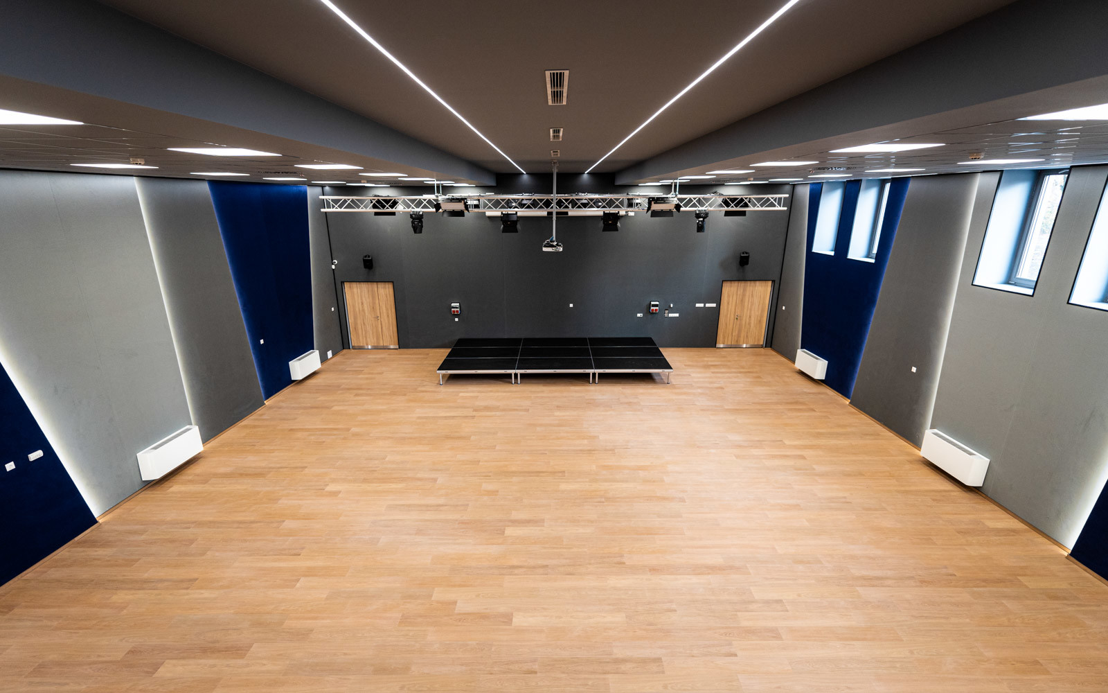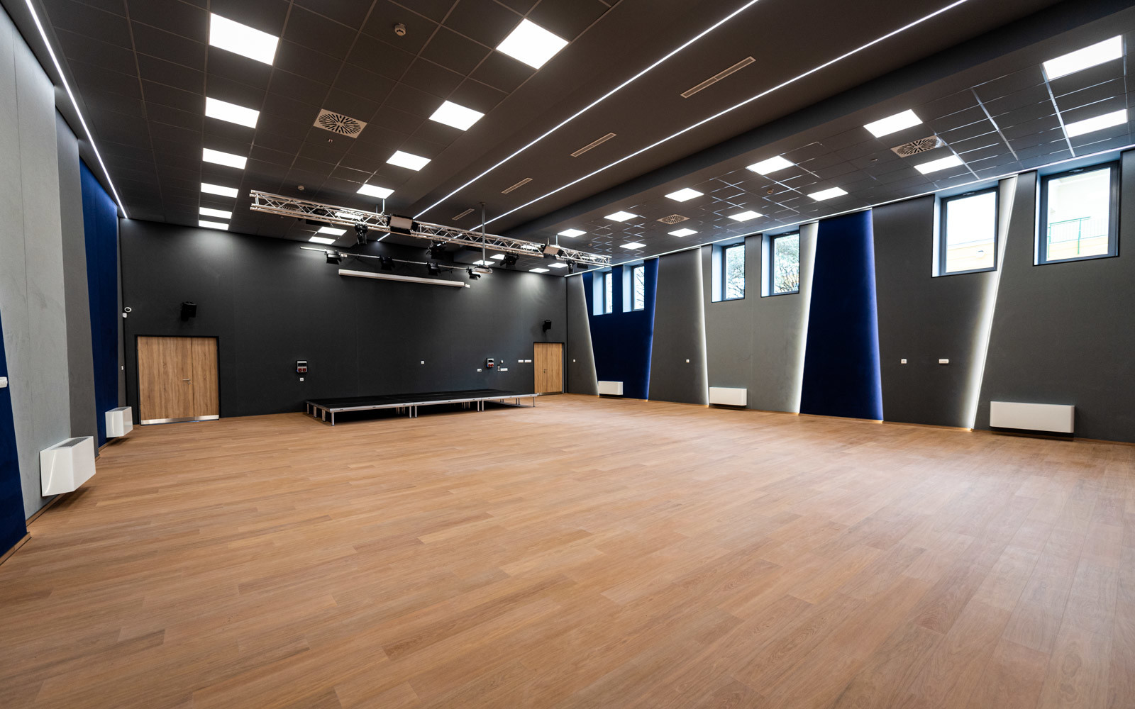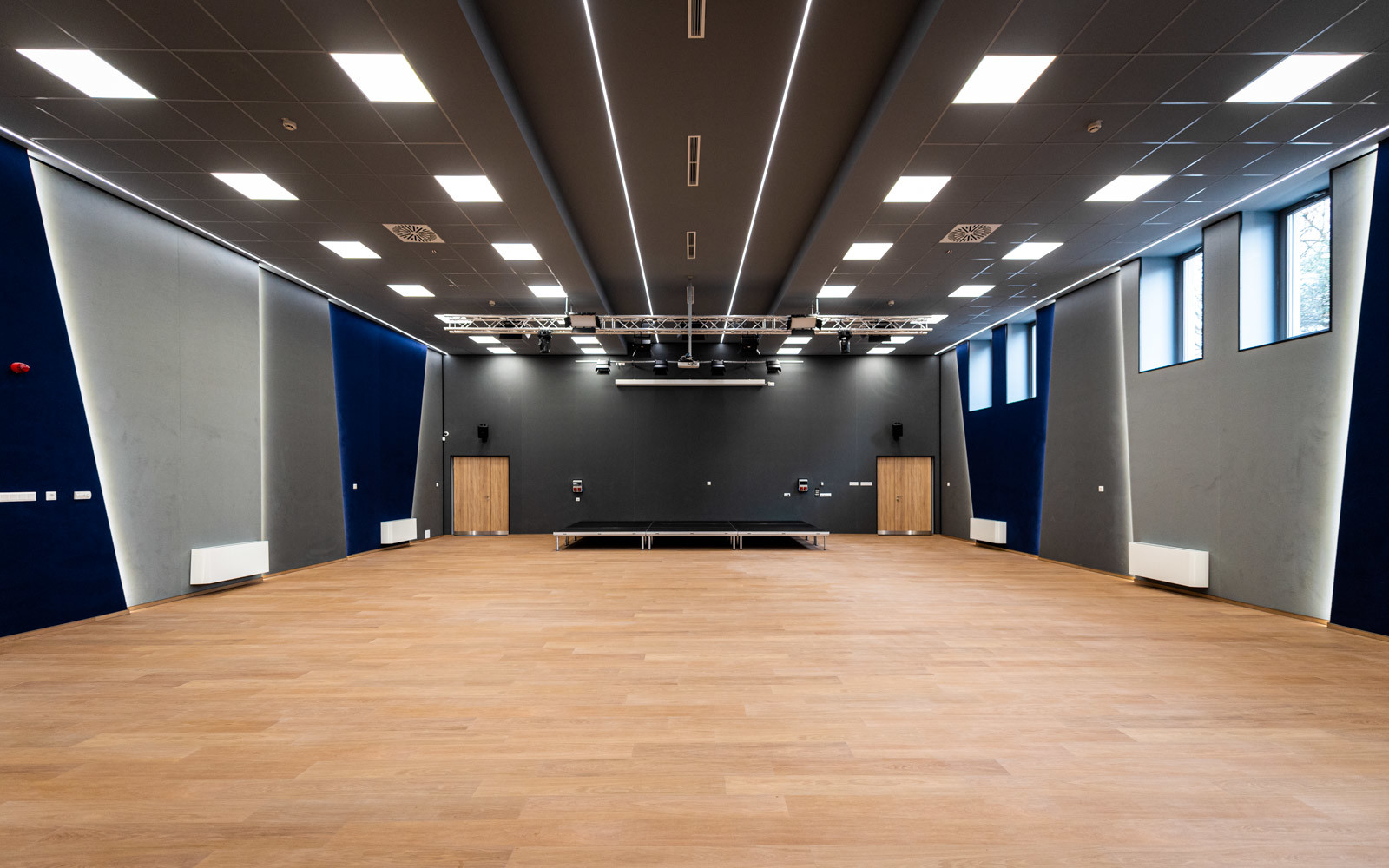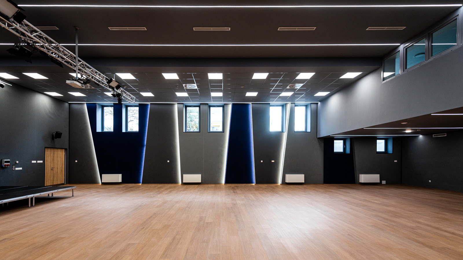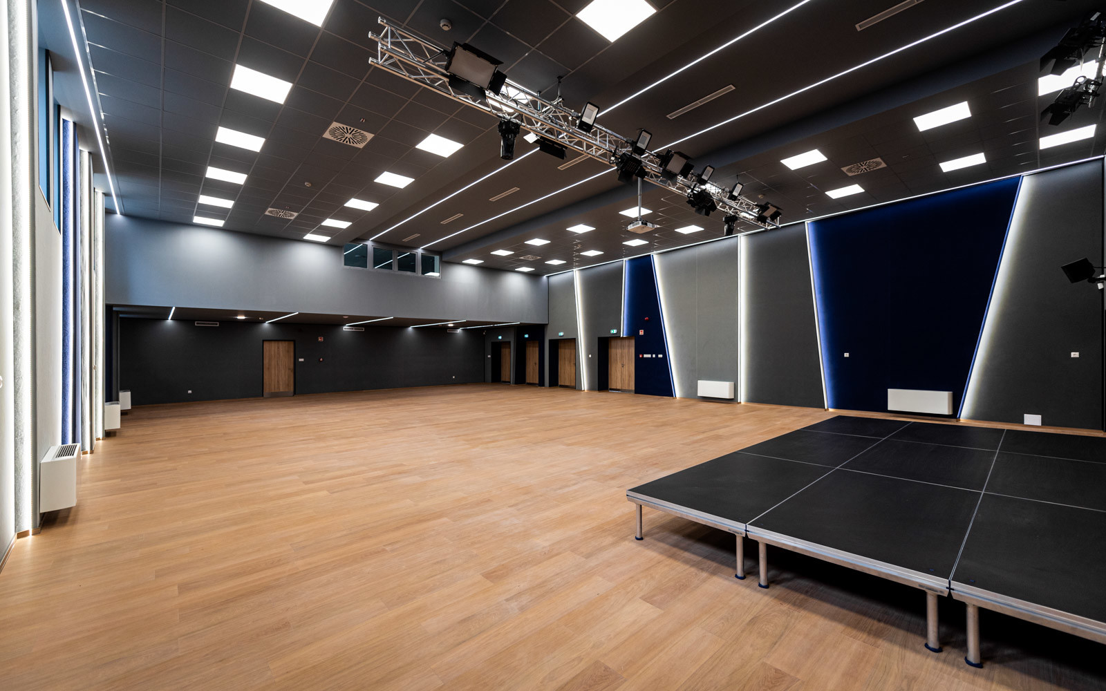 A szakember szerint a rendezvényhelyiség belső kialakítása mindeneképp említést érdemel. „Ez egy akusztikus oldalfalakkal határolt tér lett, ahol az akusztikus falat különböző dőlésszögű síkokkal bontottuk meg függőleges, díszítő LED világítással megbolondítva, kárpit borítással fedve a falakat.”
