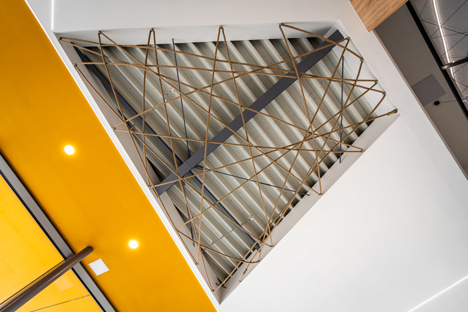 „A látogatóközpont előcsarnokában, amely egy több mint 30 méter hosszú üvegfallal van határolva, a főlépcső és a galéria korlátján, illetve az álmennyezeten is díszítő kötél álmennyezetet alakítottunk ki. Ezek közül a mennyezeten elhelyezett jurta kötél rendszer a természetességet idézi elő.”