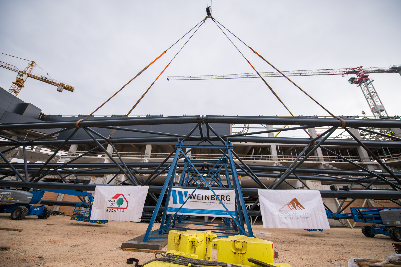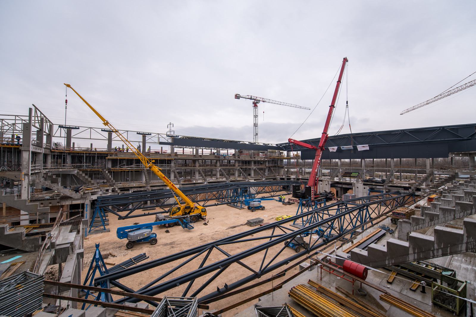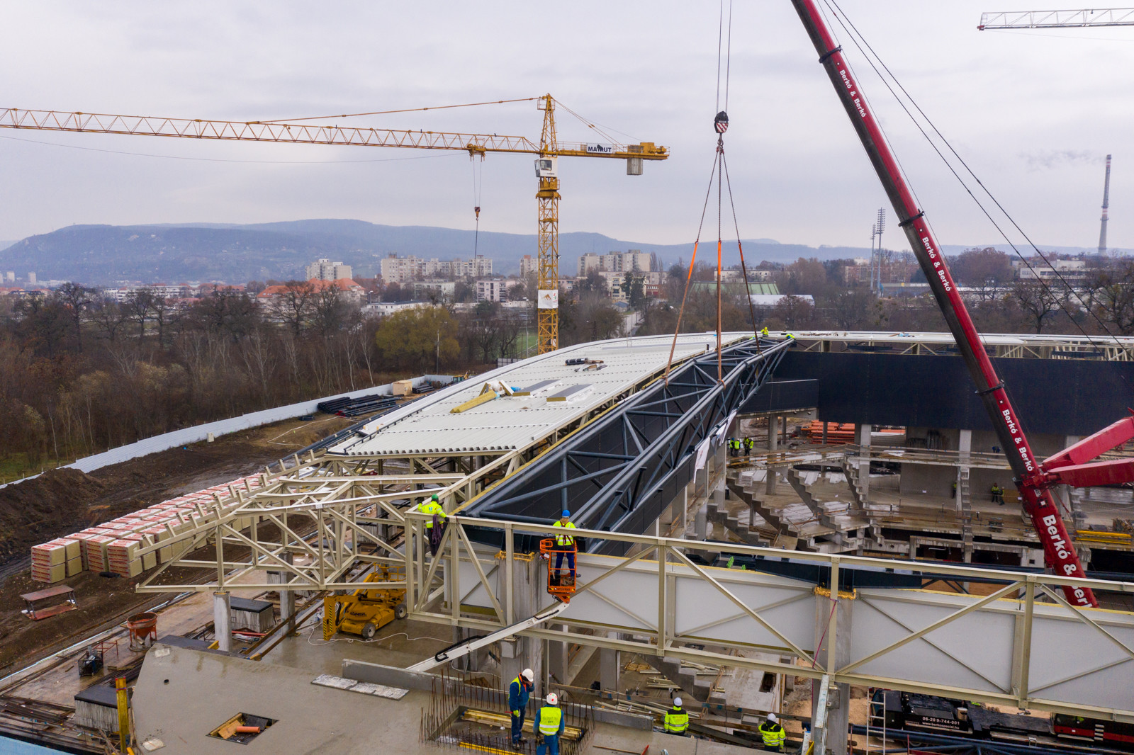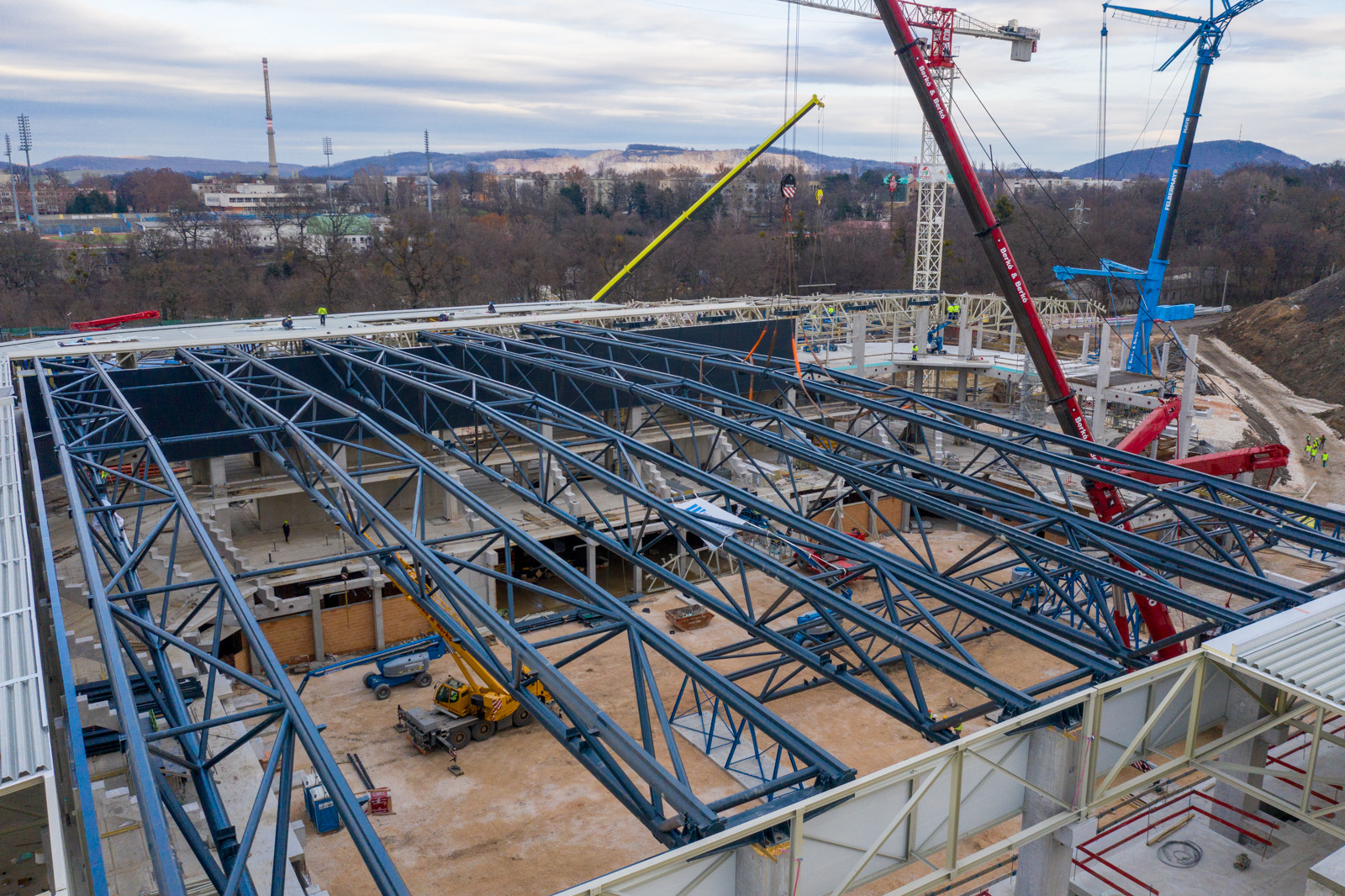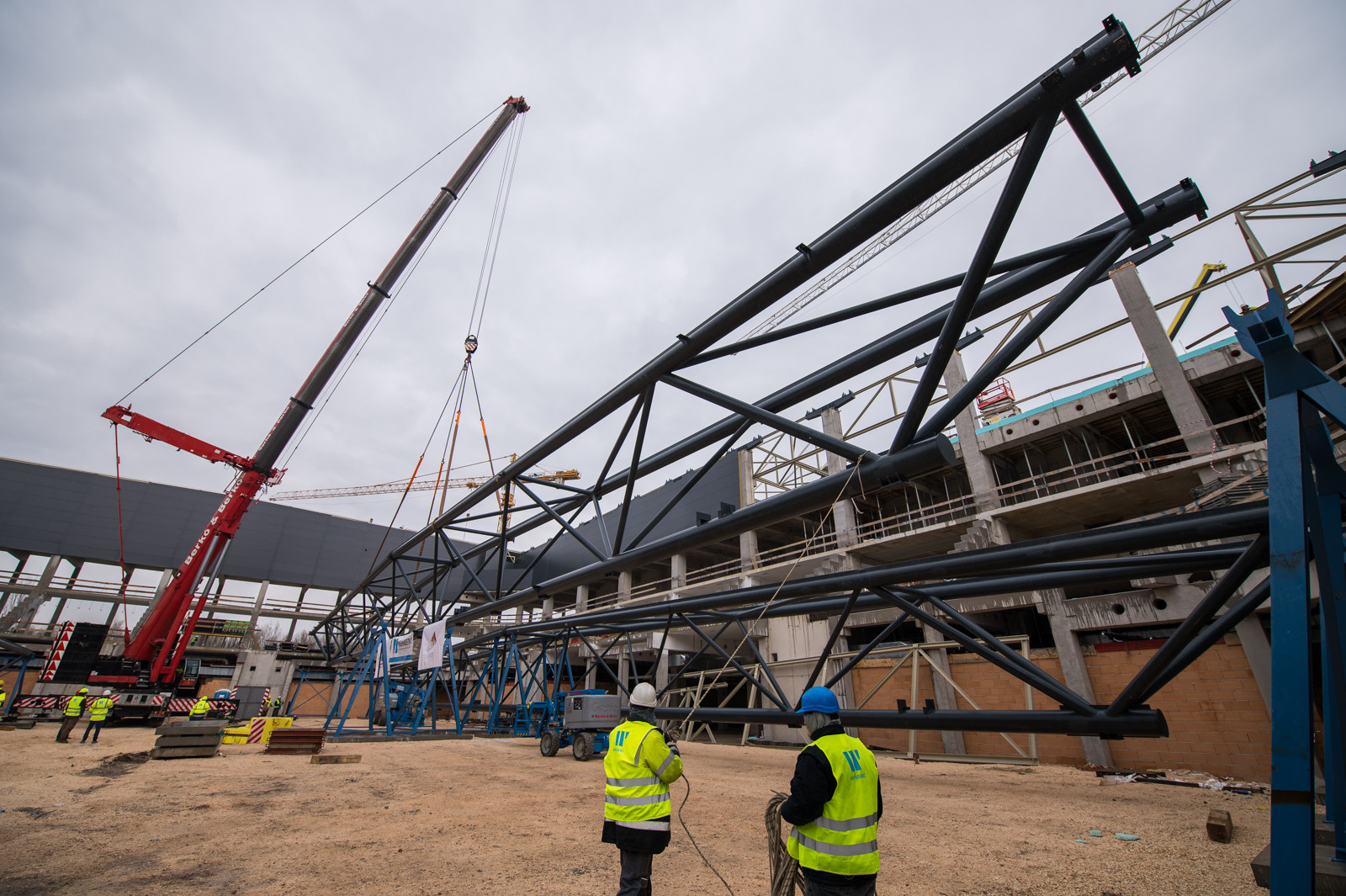 „Jelenleg az épület küzdőtere felett elhelyezkedő tíz darab, egyenként 63 méter hosszú és 43,8 tonnás főtartó beemelése zajlik”