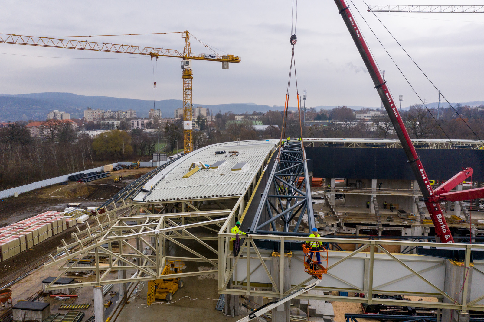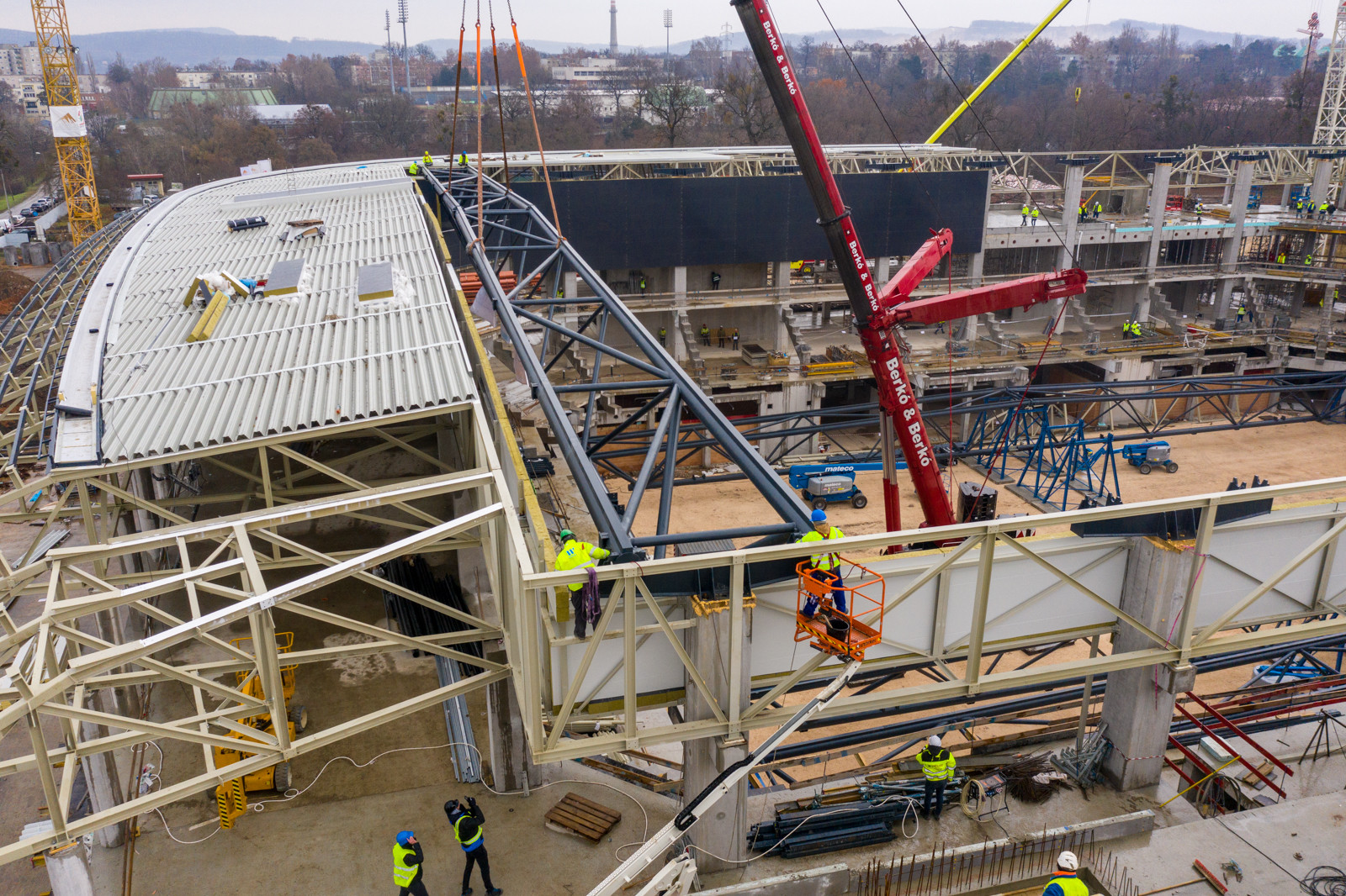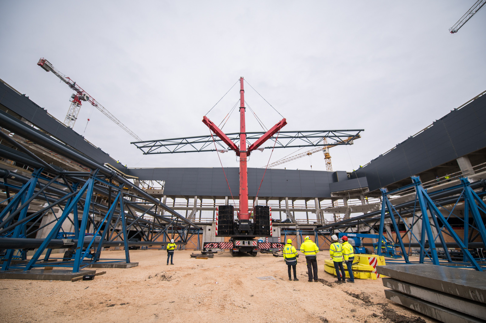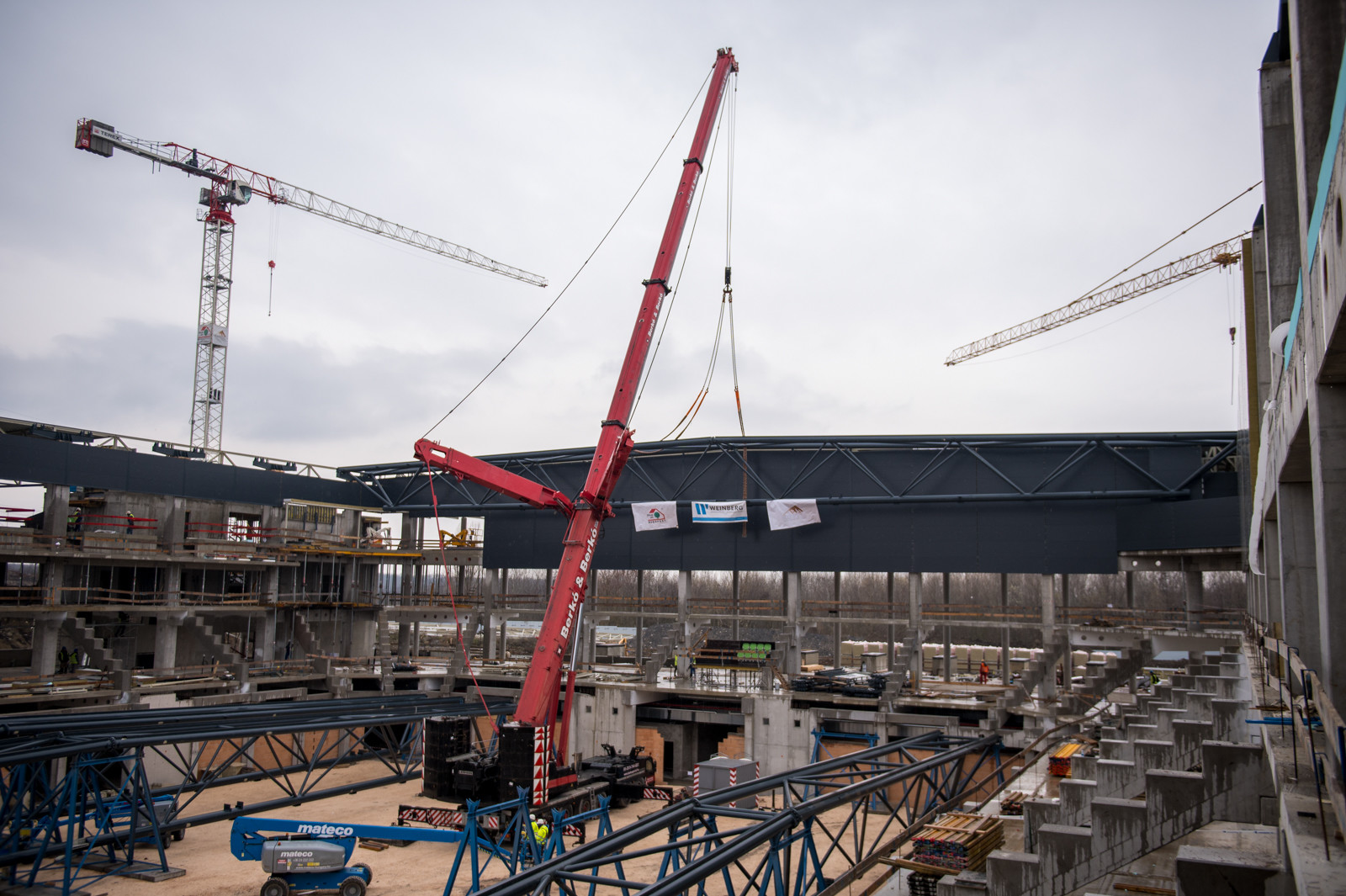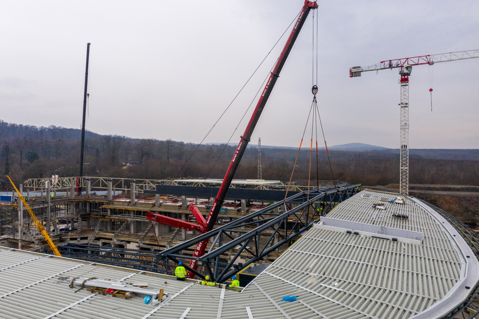 „Jelenleg az épület küzdőtere felett elhelyezkedő tíz darab, egyenként 63 méter hosszú és 43,8 tonnás főtartó beemelése zajlik”