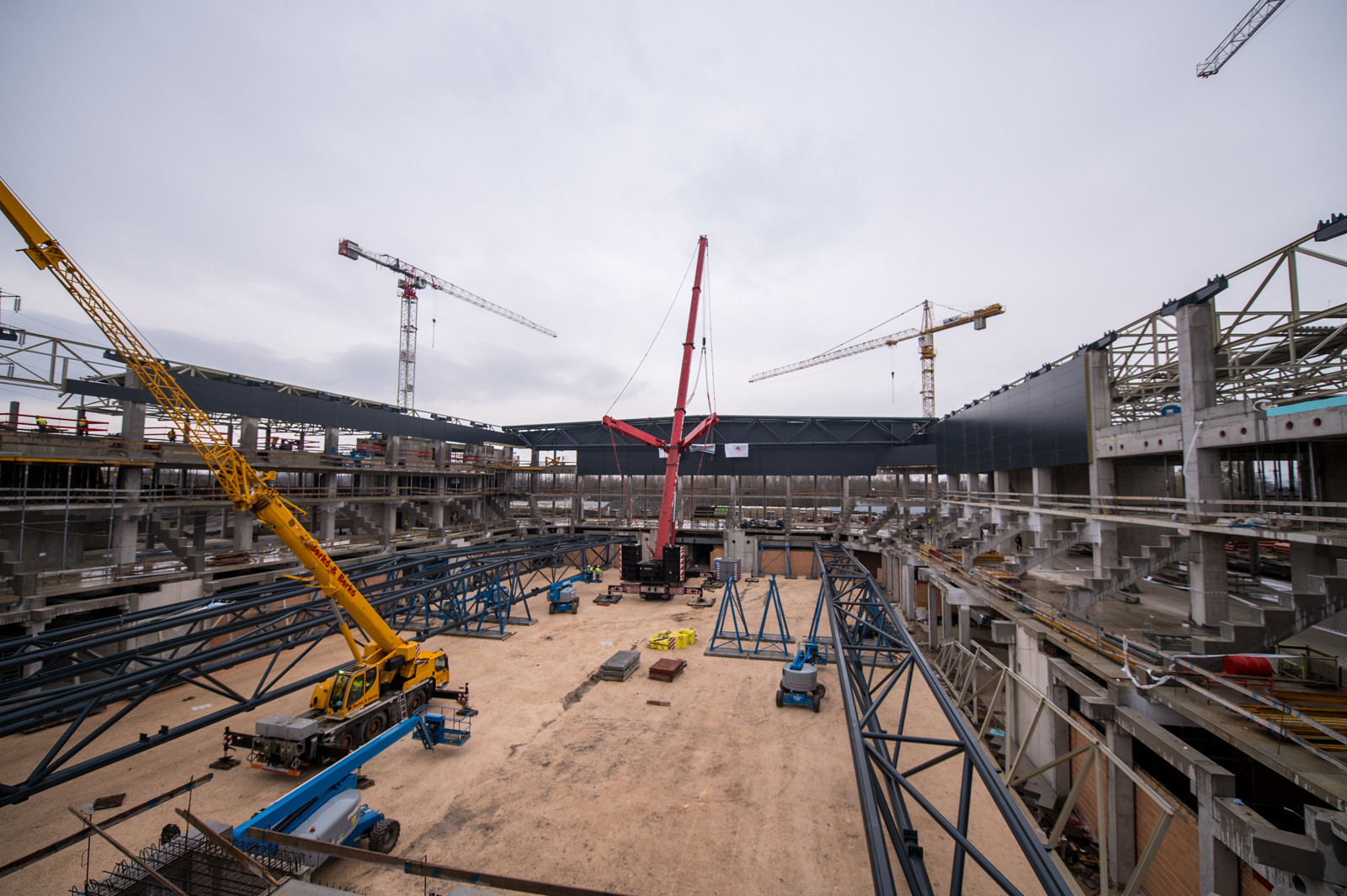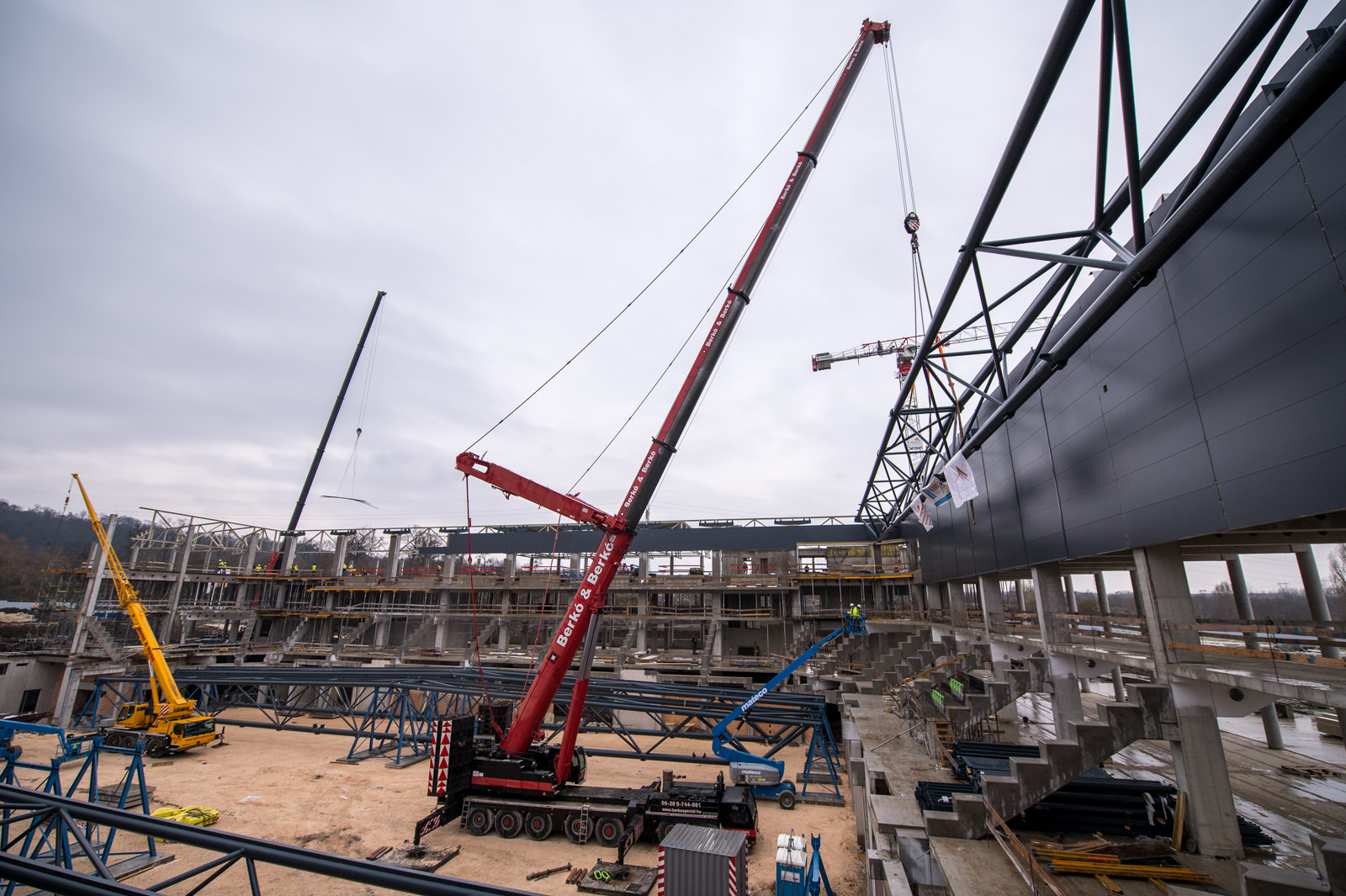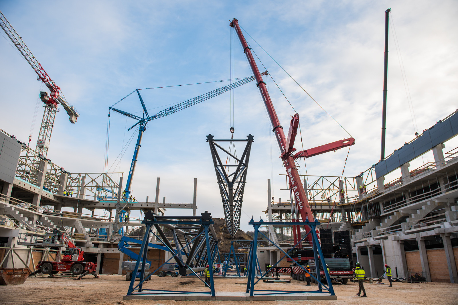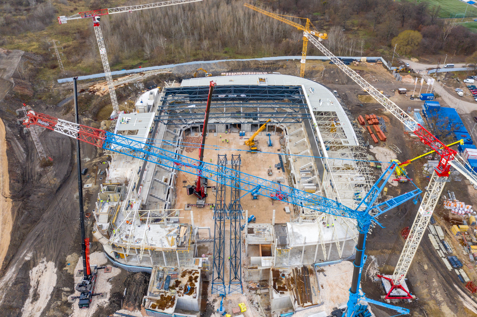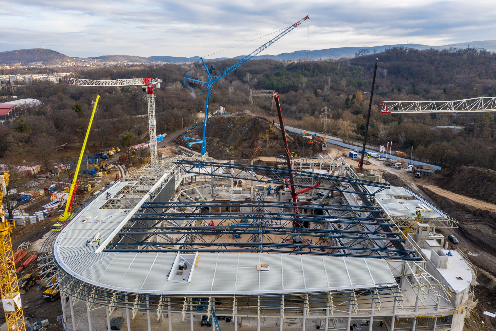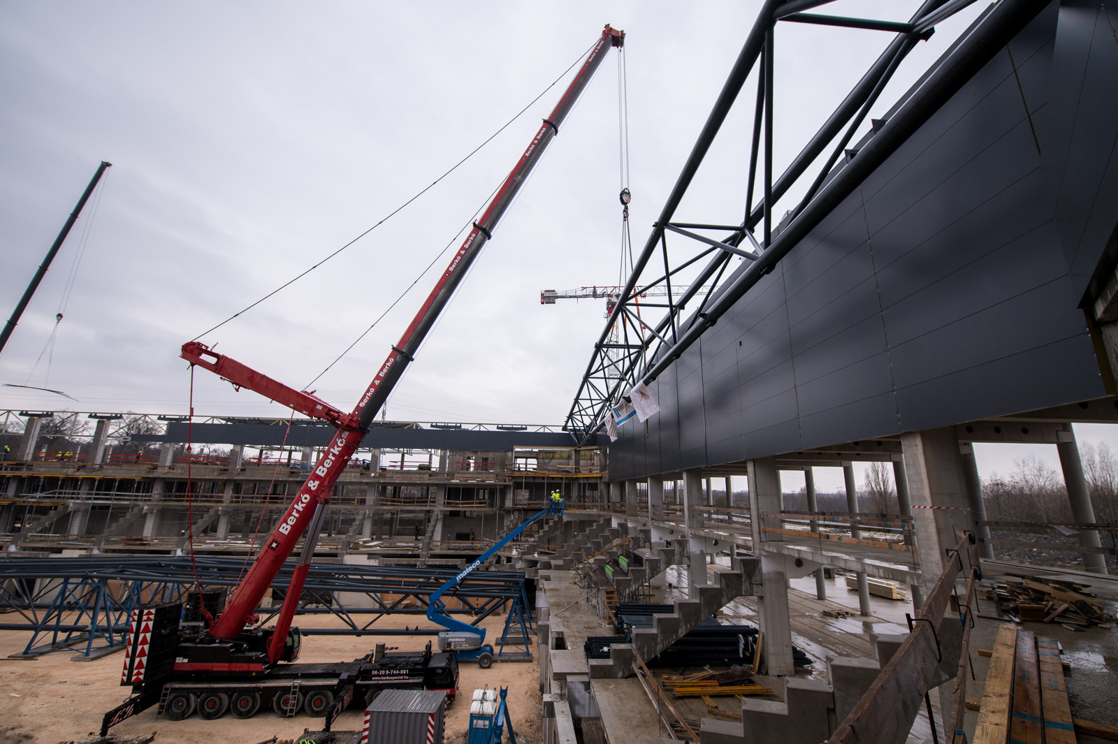 „Jelenleg az épület küzdőtere felett elhelyezkedő tíz darab, egyenként 63 méter hosszú és 43,8 tonnás főtartó beemelése zajlik”