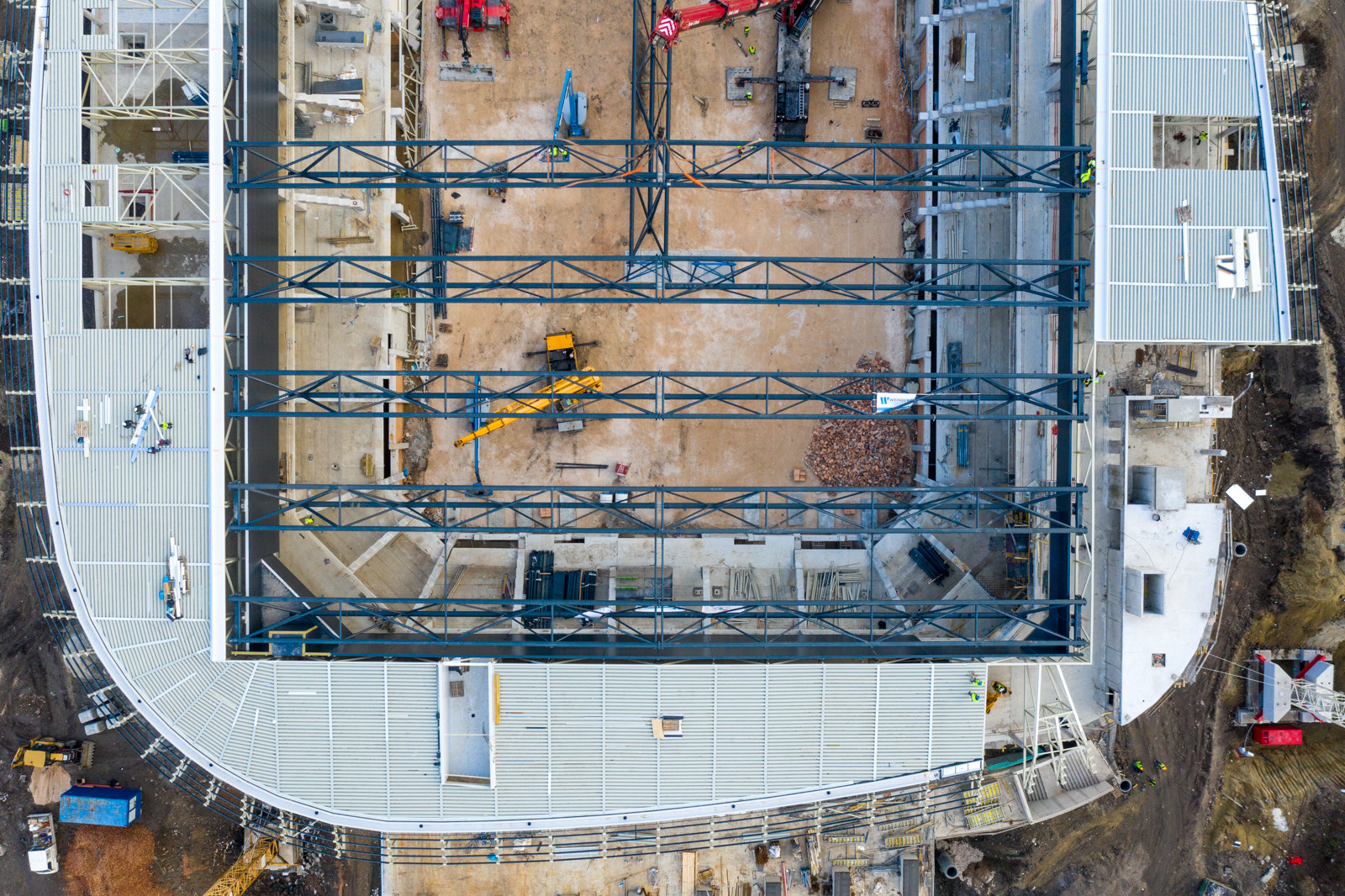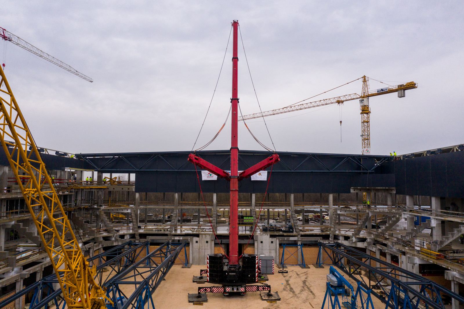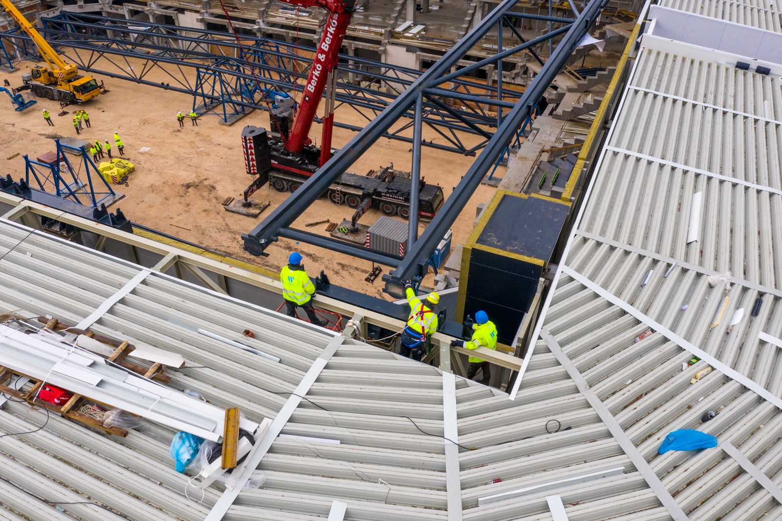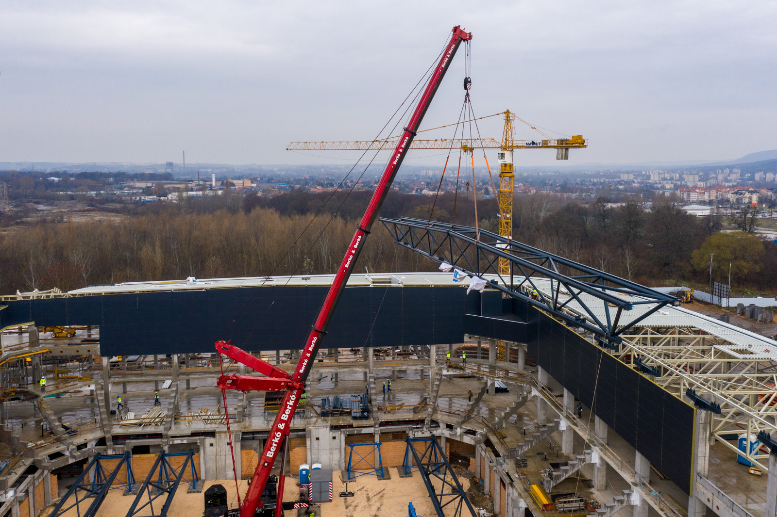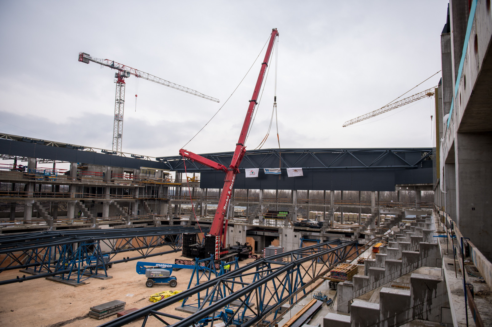 „Jelenleg az épület küzdőtere felett elhelyezkedő tíz darab, egyenként 63 méter hosszú és 43,8 tonnás főtartó beemelése zajlik”