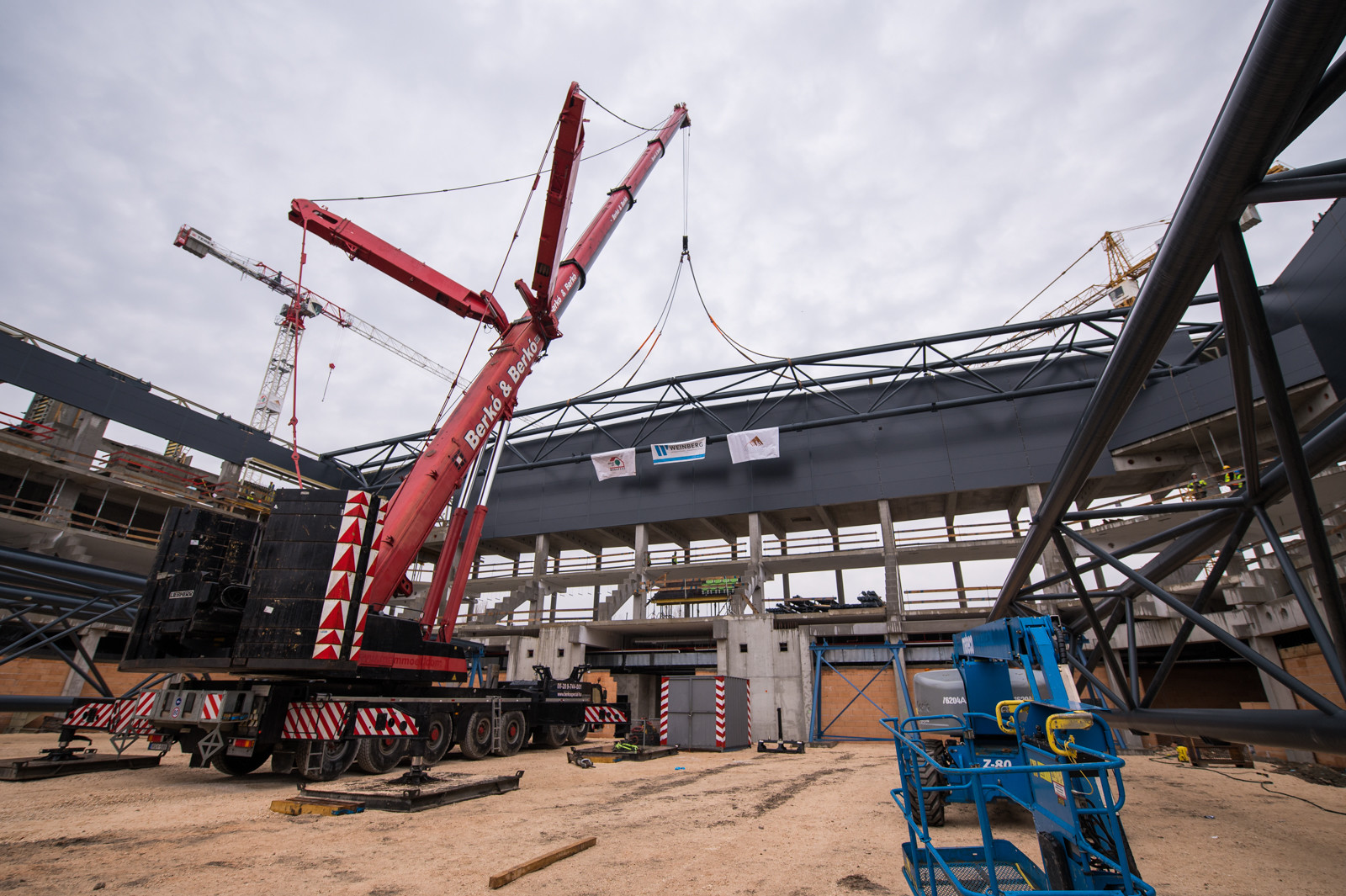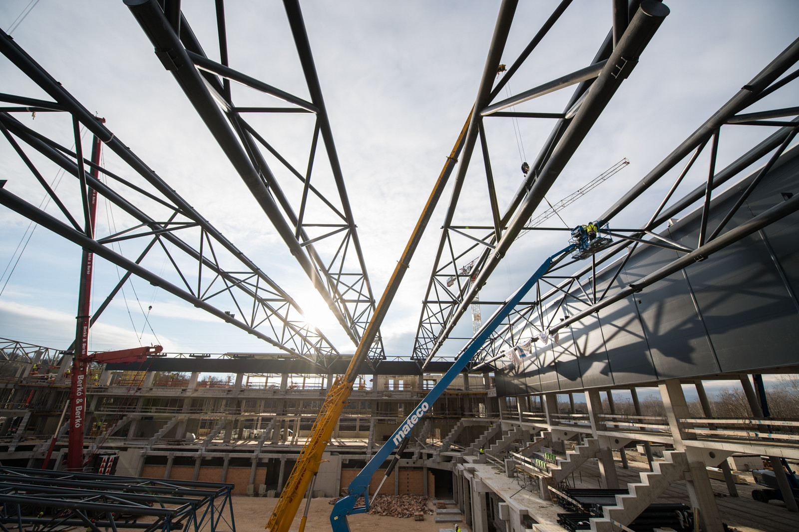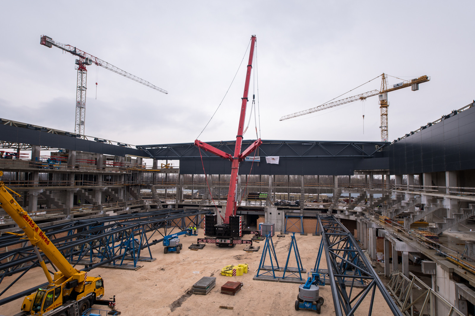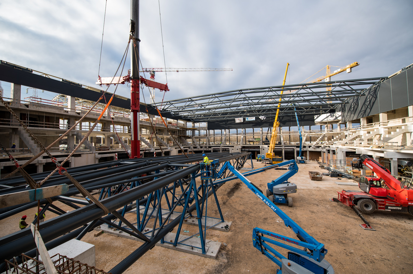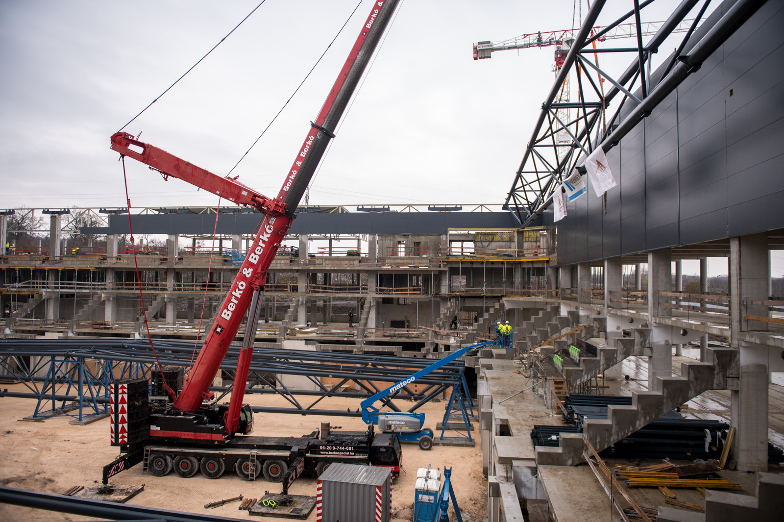 „Jelenleg az épület küzdőtere felett elhelyezkedő tíz darab, egyenként 63 méter hosszú és 43,8 tonnás főtartó beemelése zajlik”