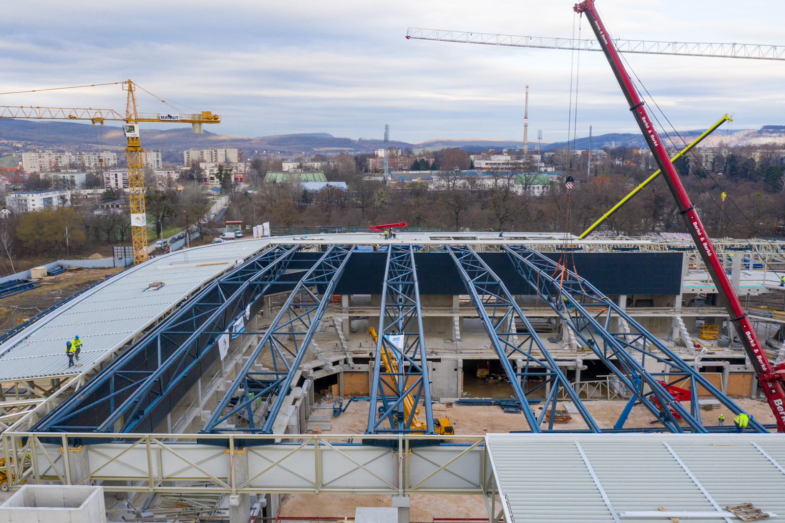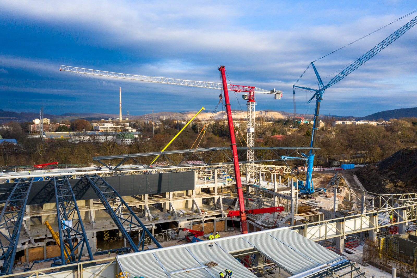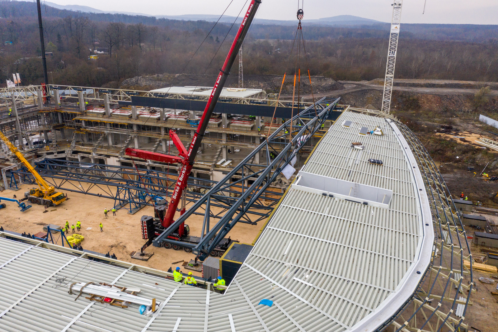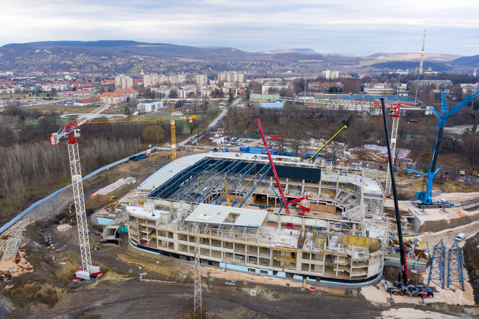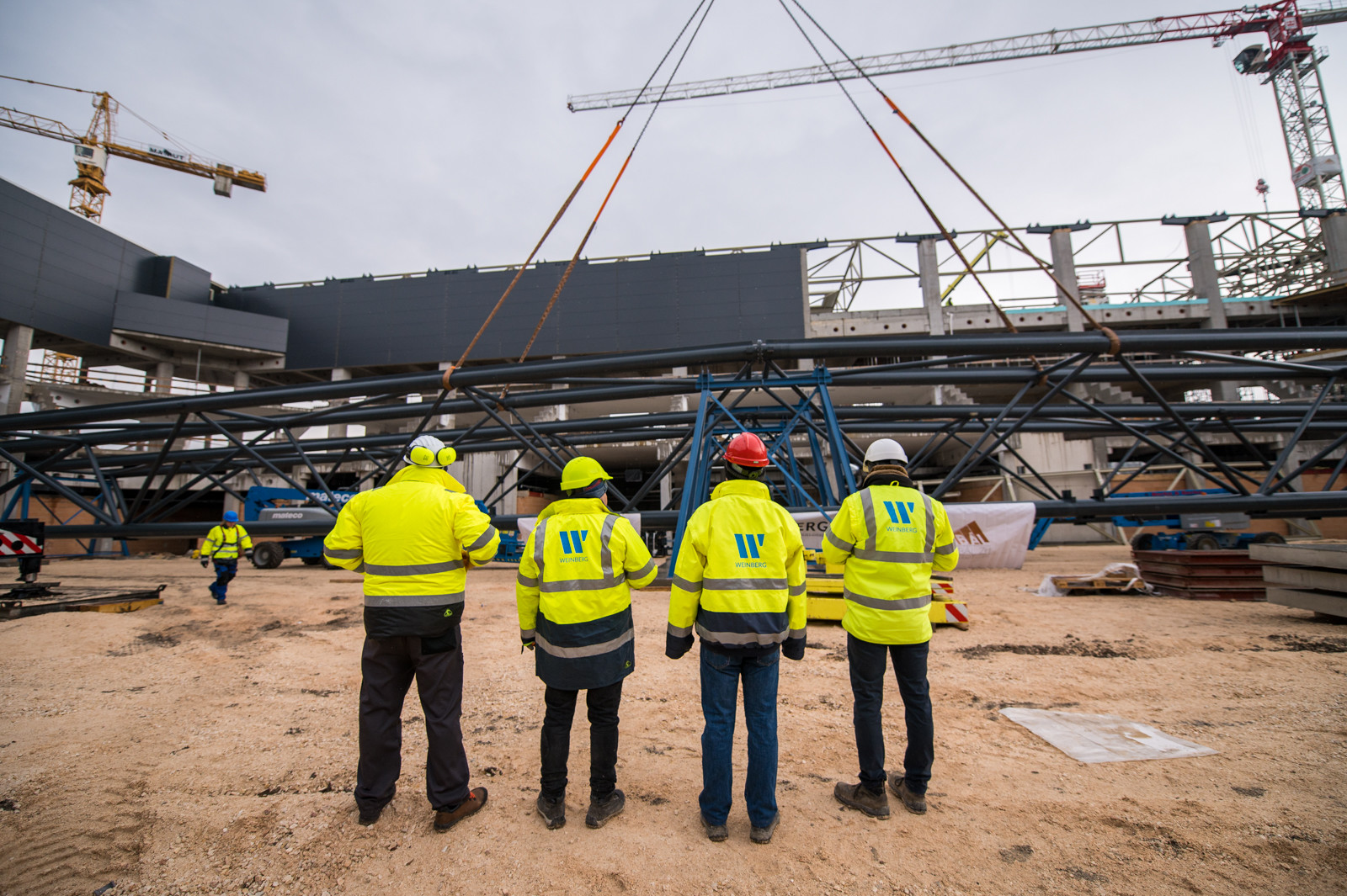 „Jelenleg az épület küzdőtere felett elhelyezkedő tíz darab, egyenként 63 méter hosszú és 43,8 tonnás főtartó beemelése zajlik”