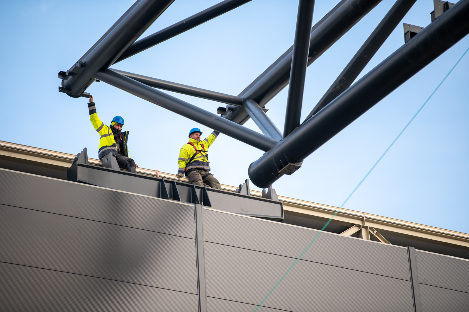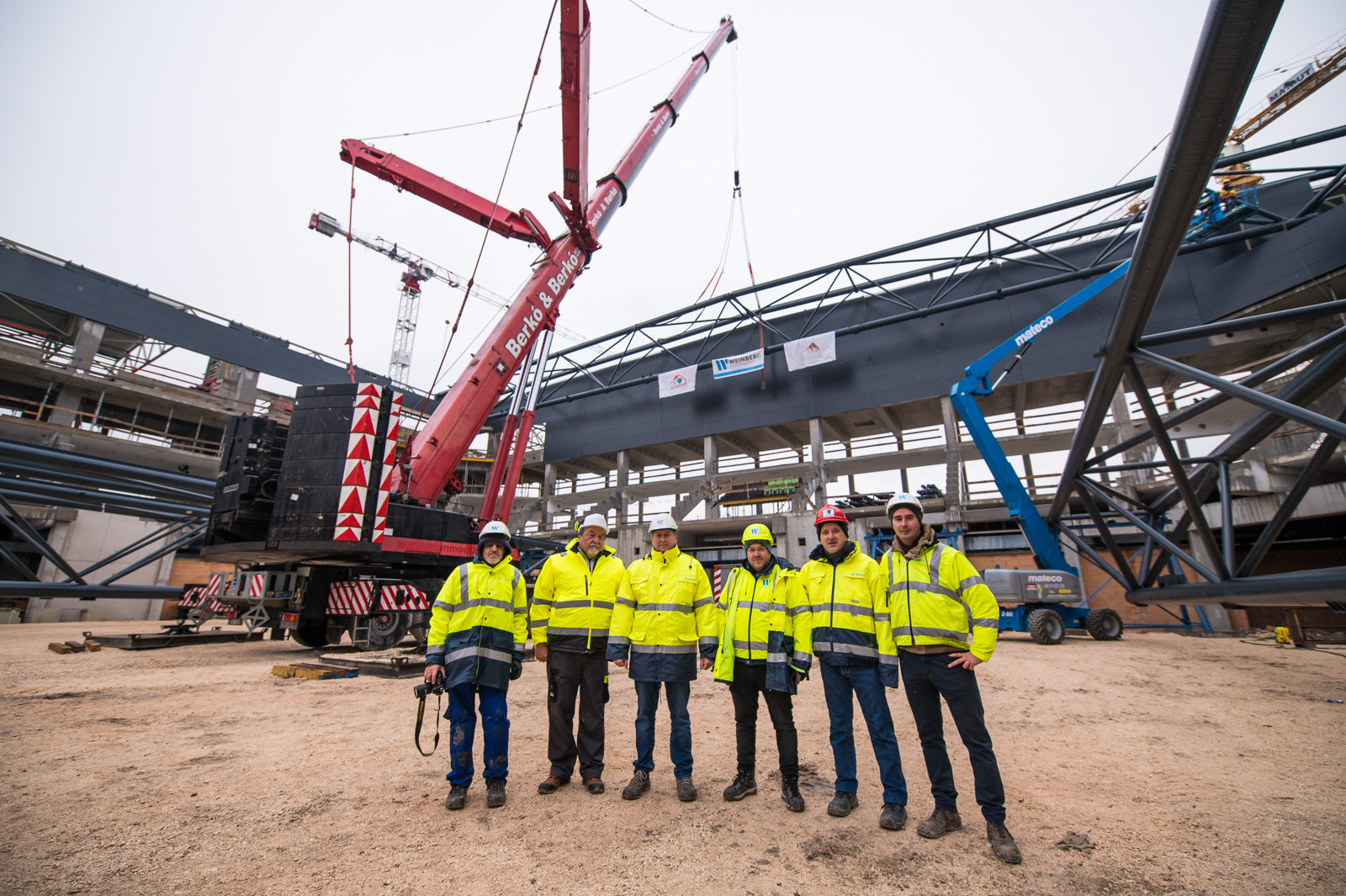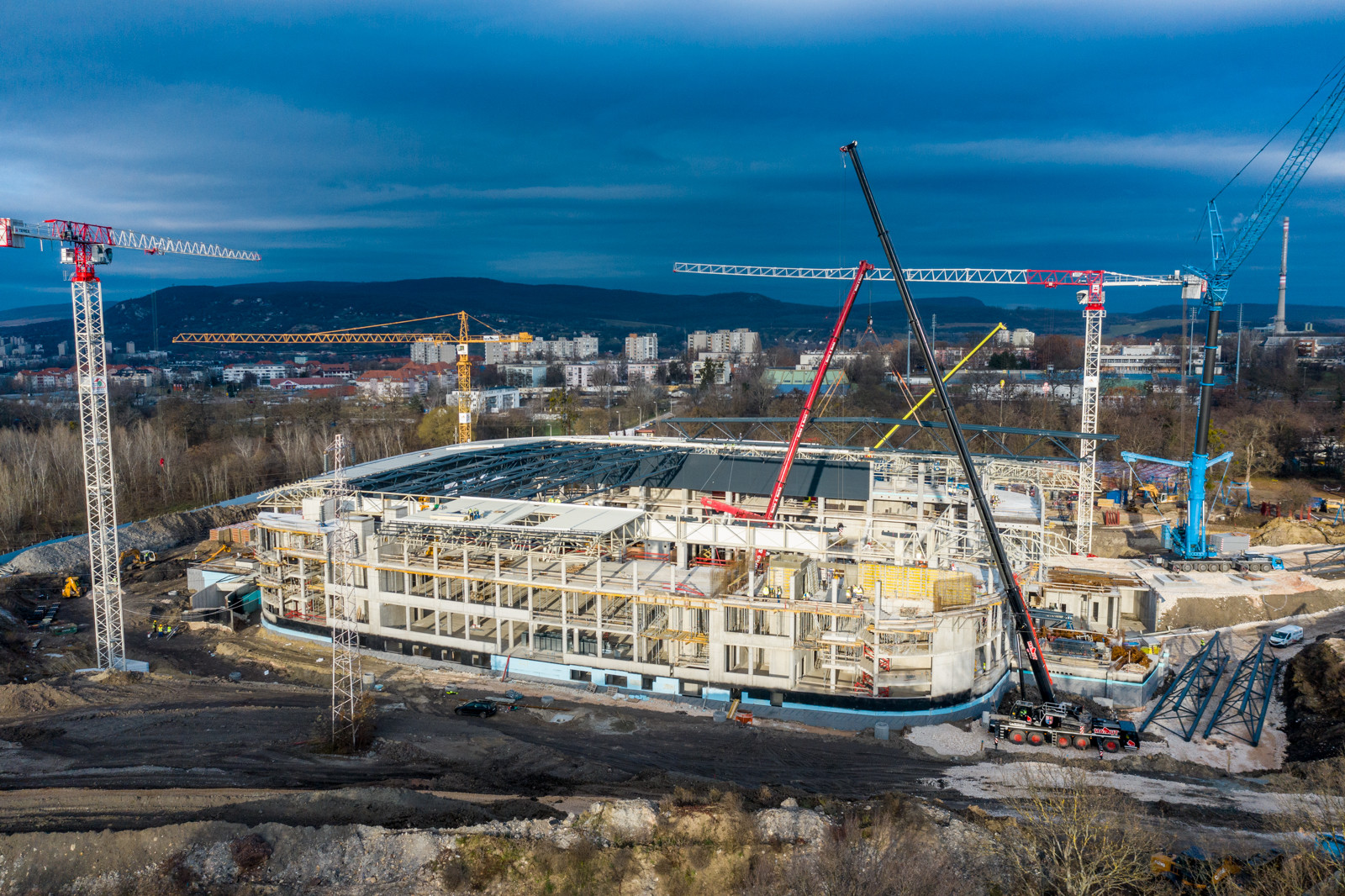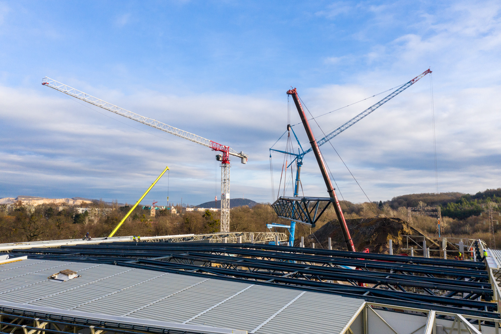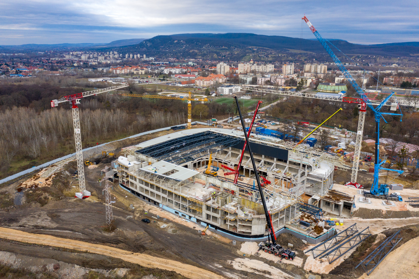 „Jelenleg az épület küzdőtere felett elhelyezkedő tíz darab, egyenként 63 méter hosszú és 43,8 tonnás főtartó beemelése zajlik”
