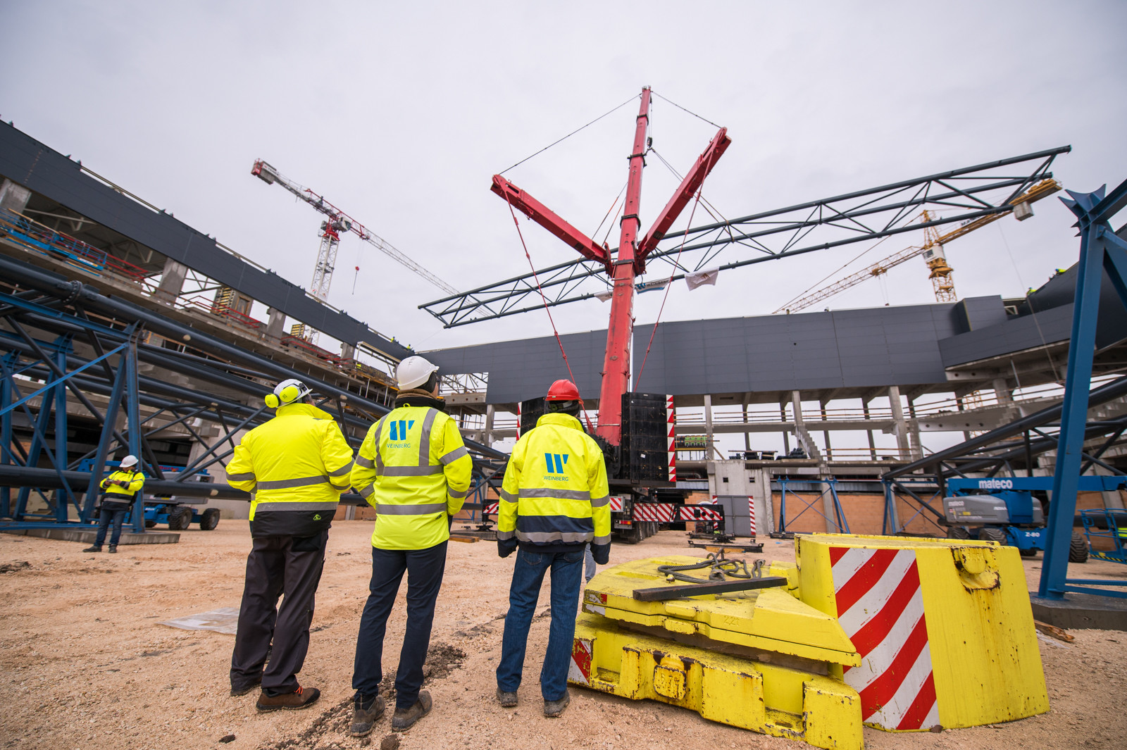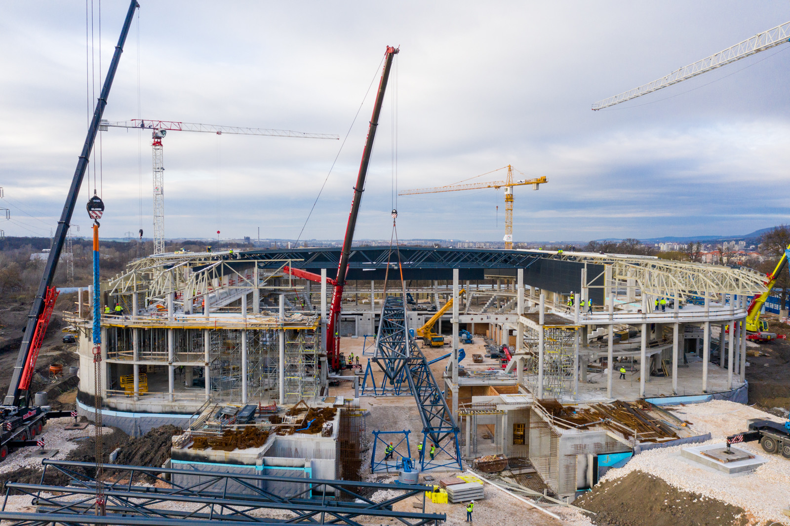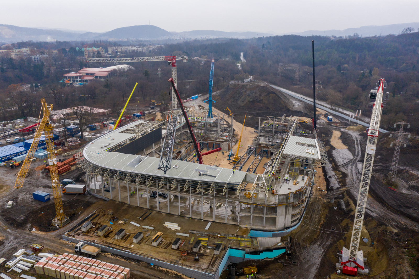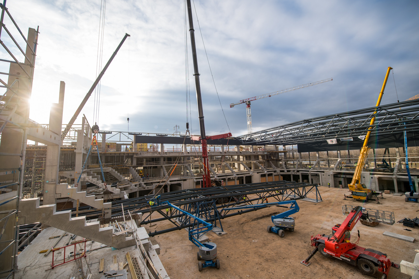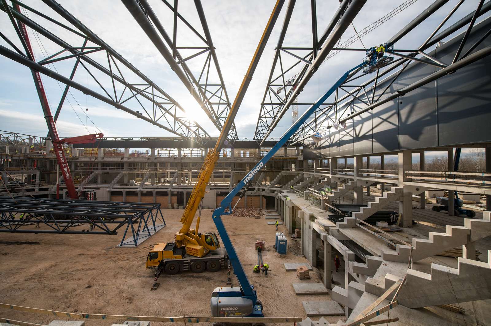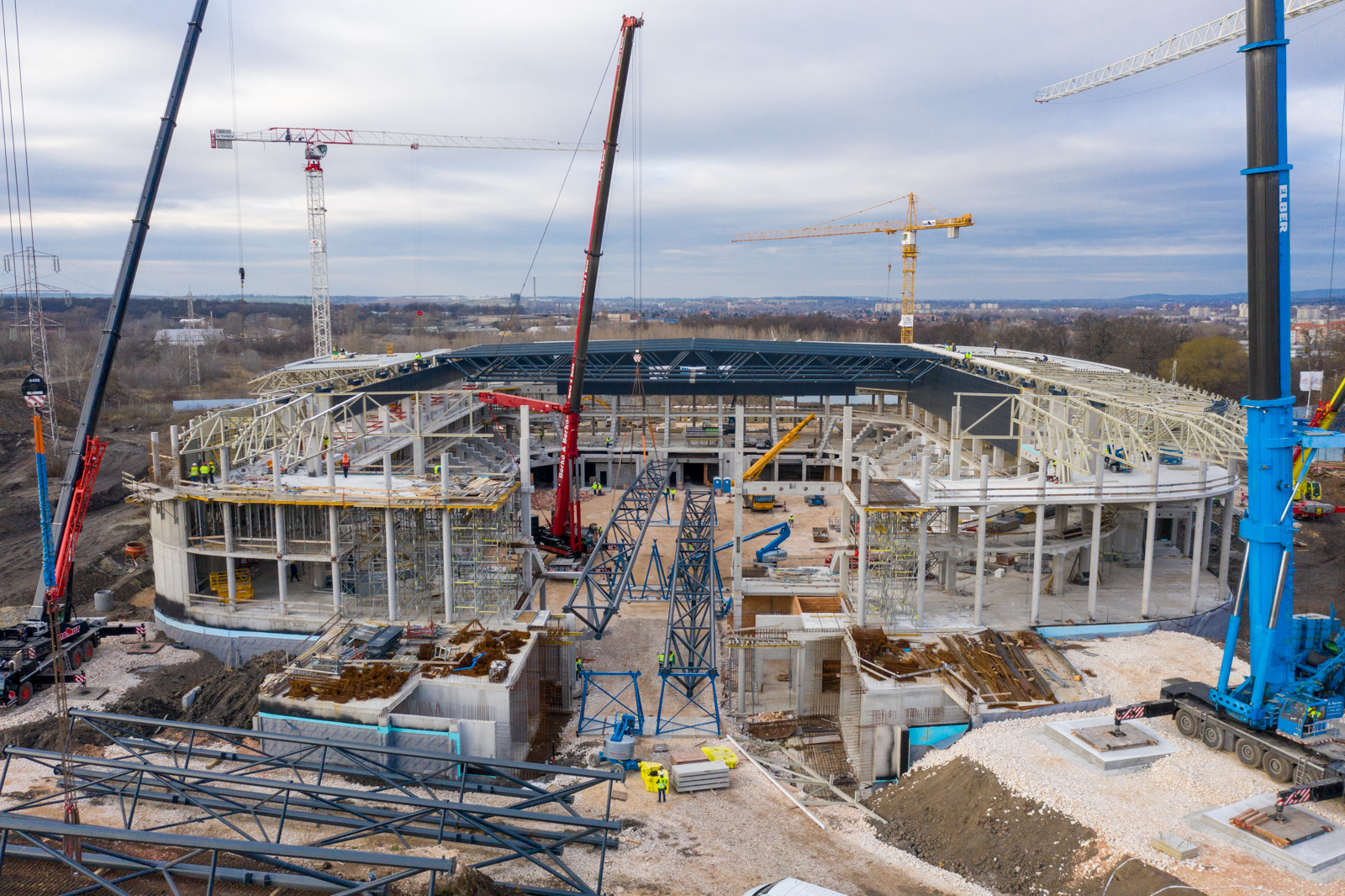„Jelenleg az épület küzdőtere felett elhelyezkedő tíz darab, egyenként 63 méter hosszú és 43,8 tonnás főtartó beemelése zajlik”