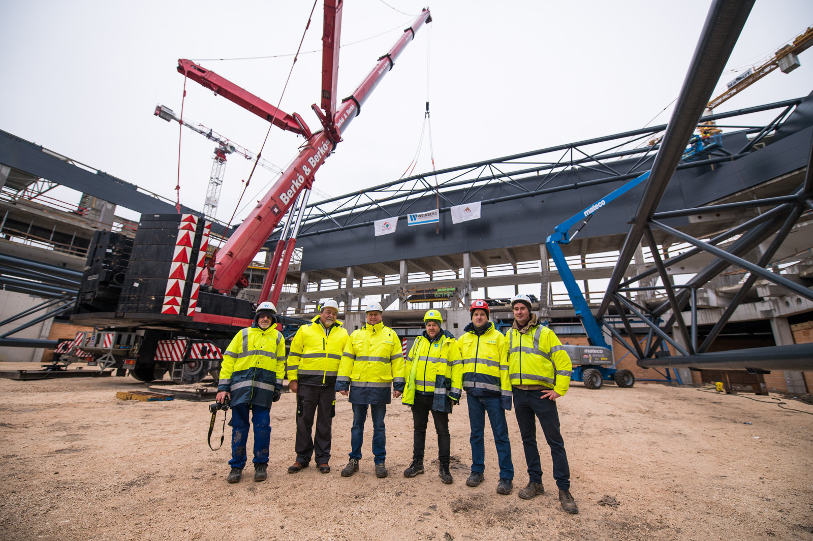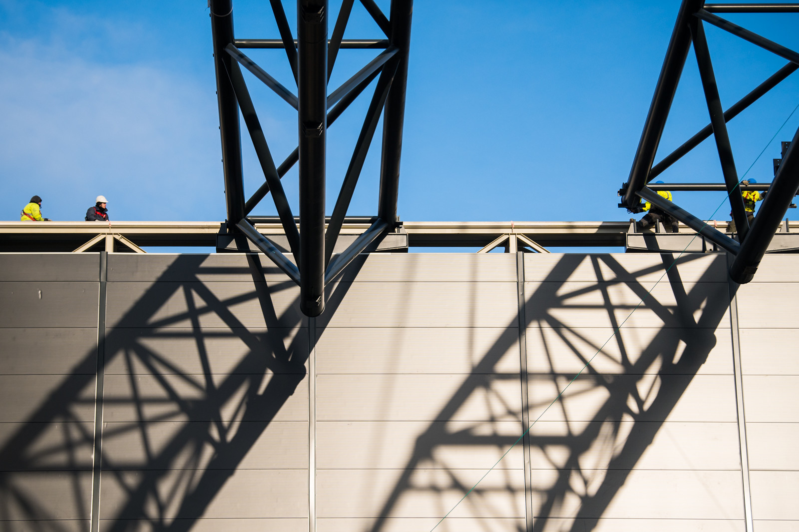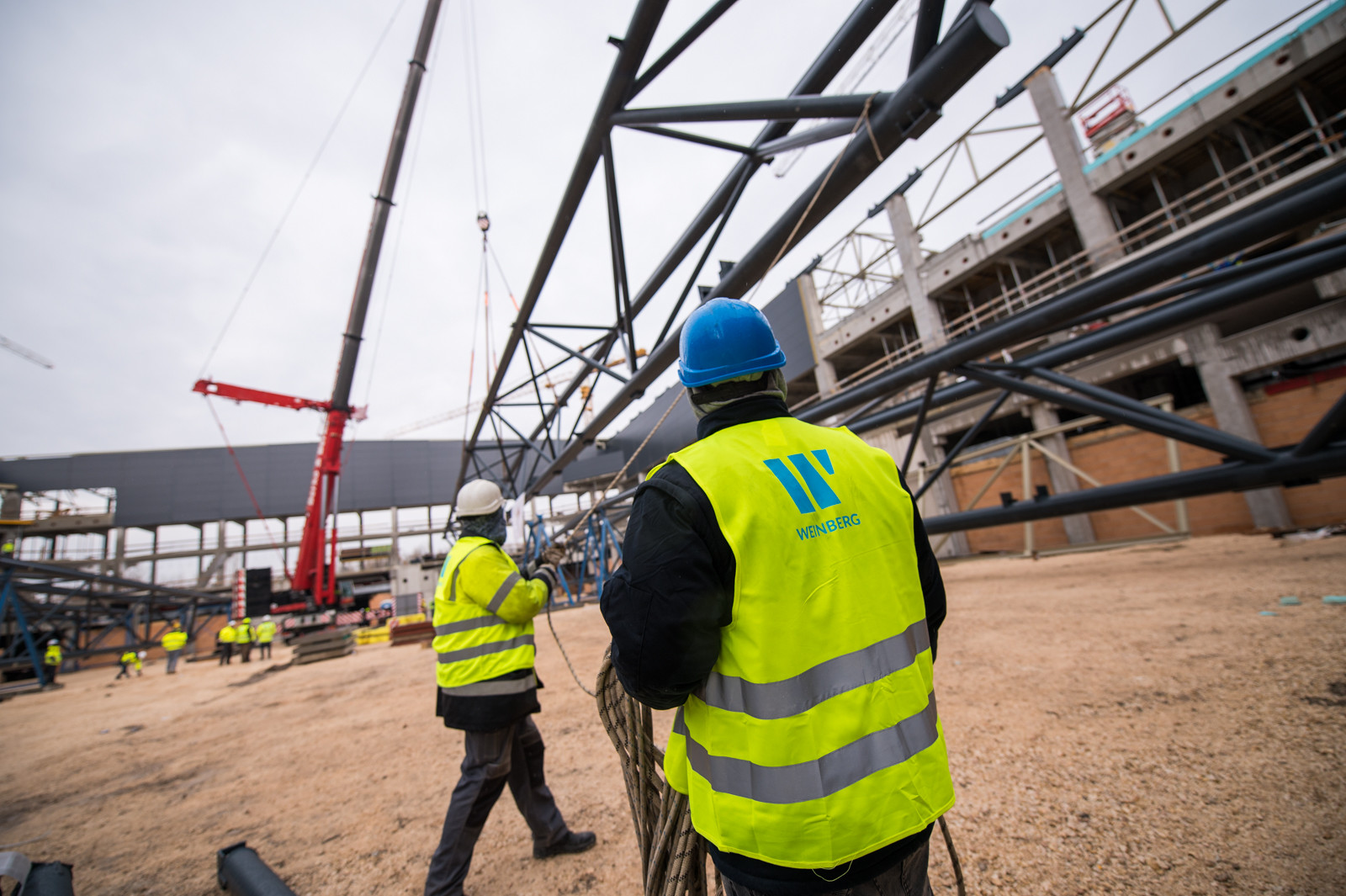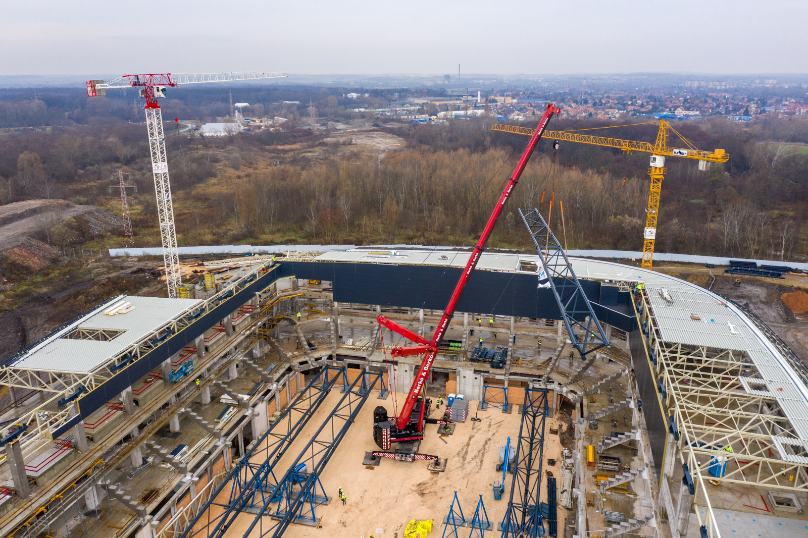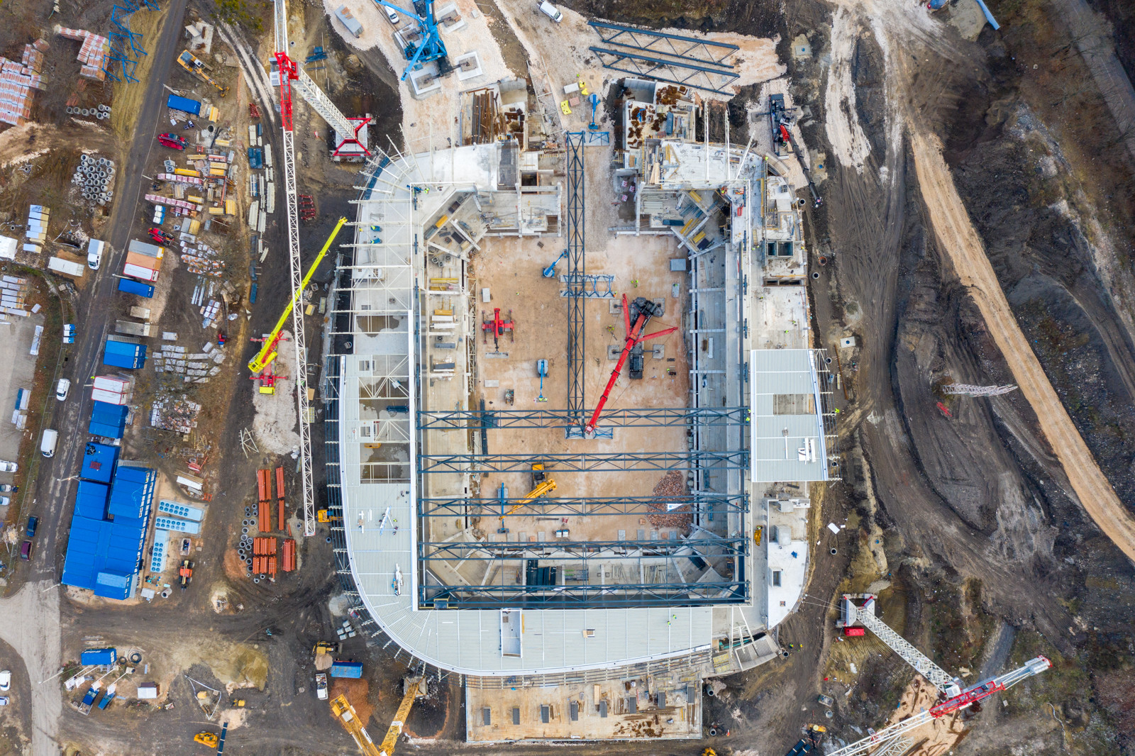 „Jelenleg az épület küzdőtere felett elhelyezkedő tíz darab, egyenként 63 méter hosszú és 43,8 tonnás főtartó beemelése zajlik”