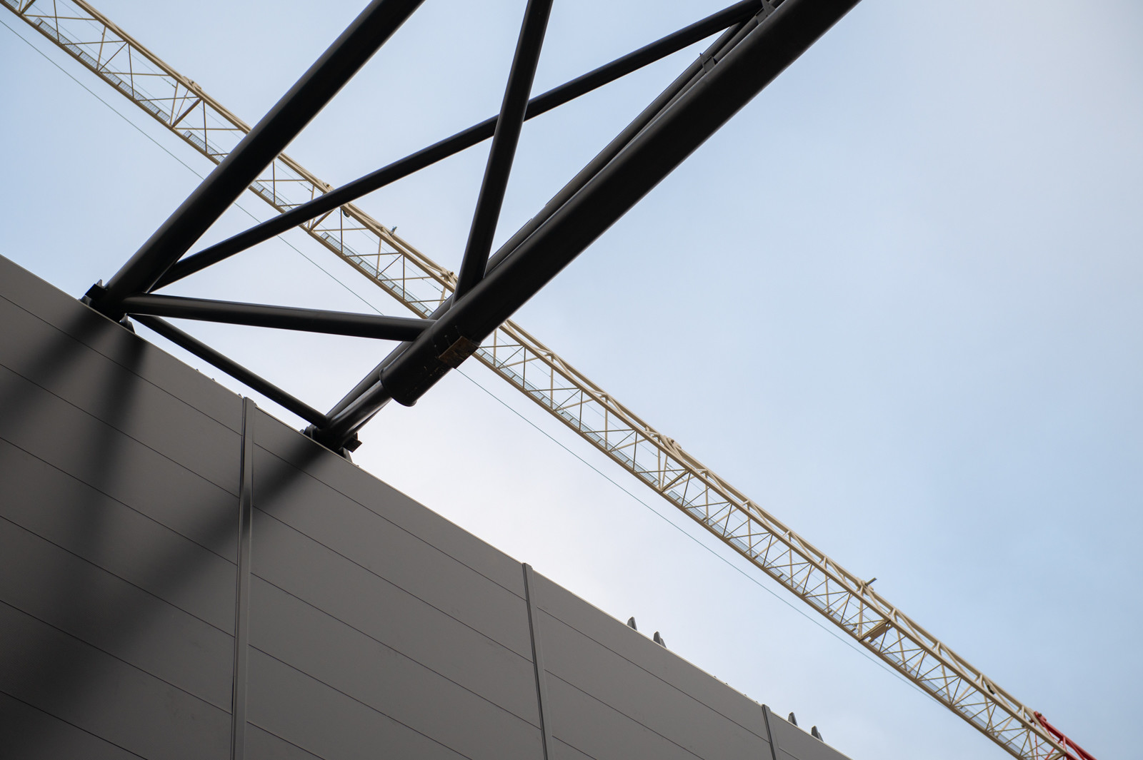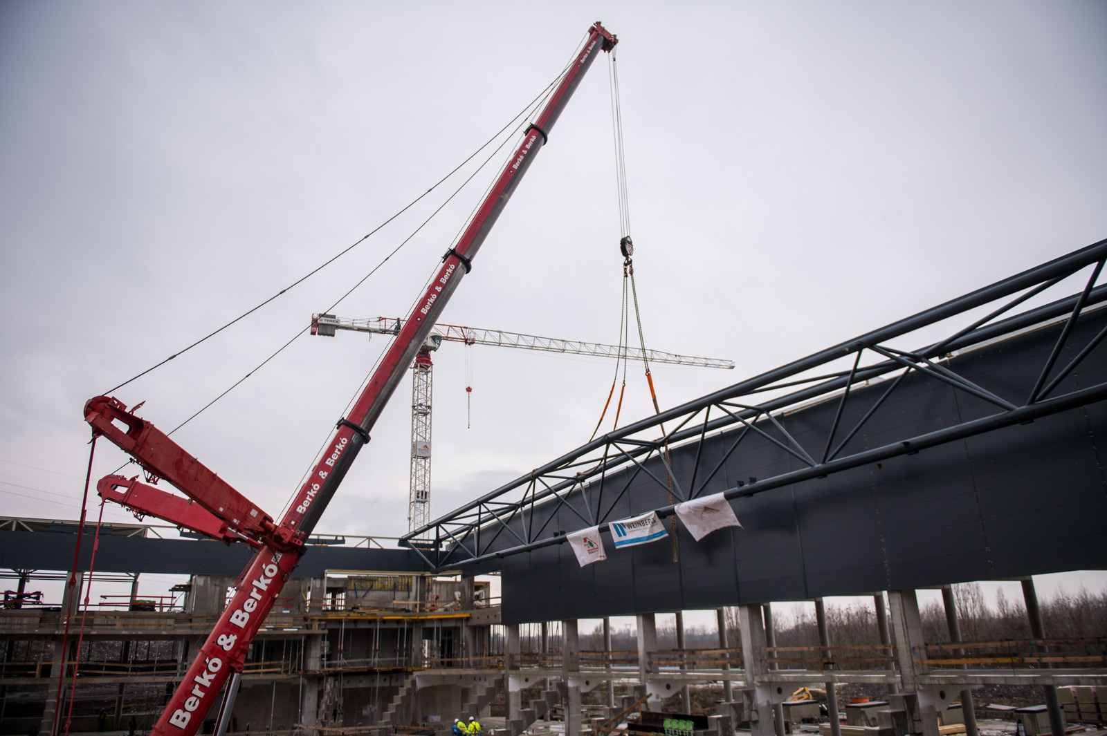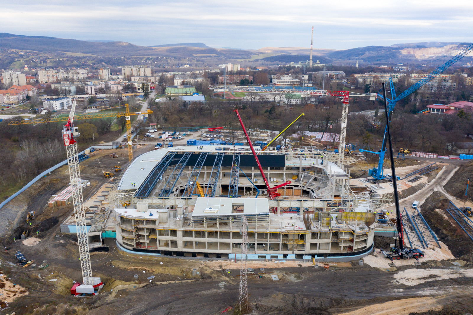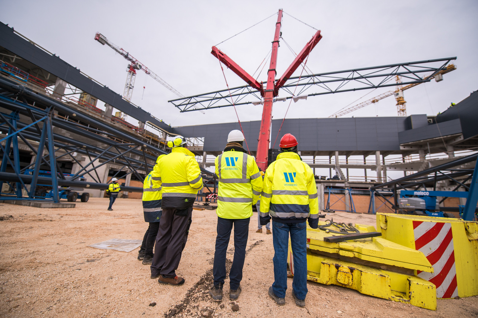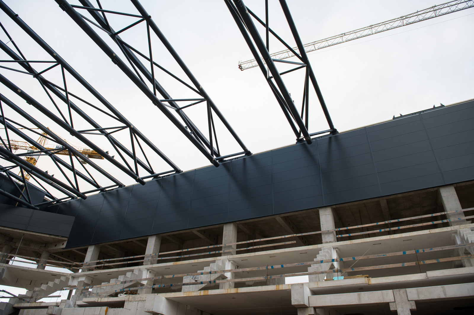 „Jelenleg az épület küzdőtere felett elhelyezkedő tíz darab, egyenként 63 méter hosszú és 43,8 tonnás főtartó beemelése zajlik”
