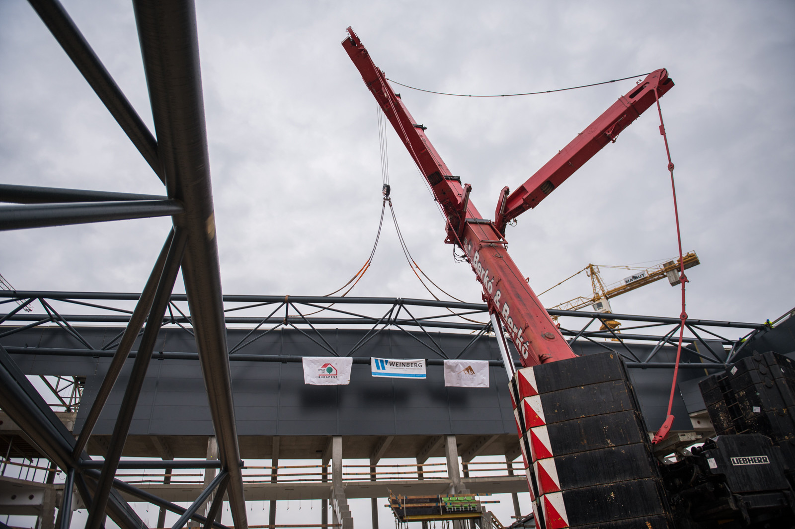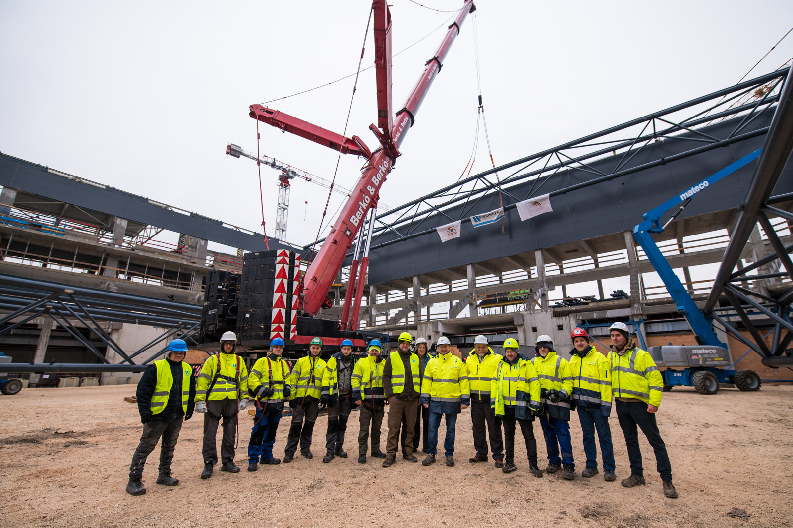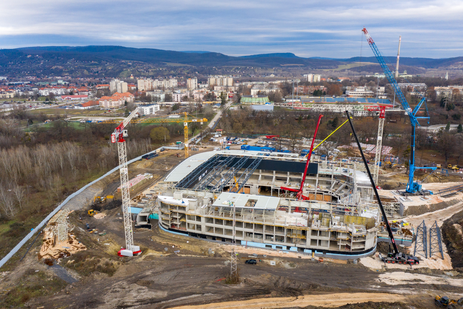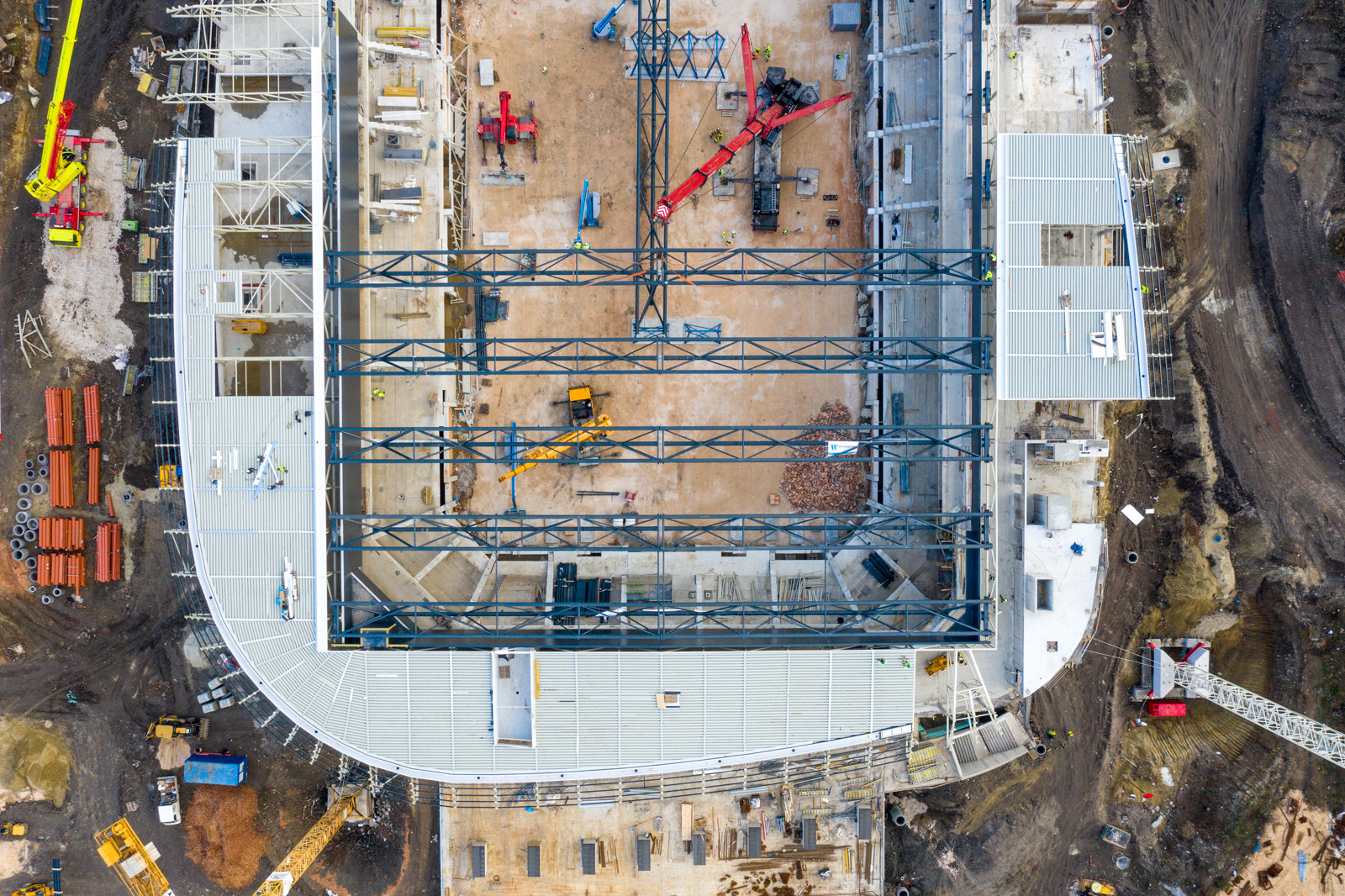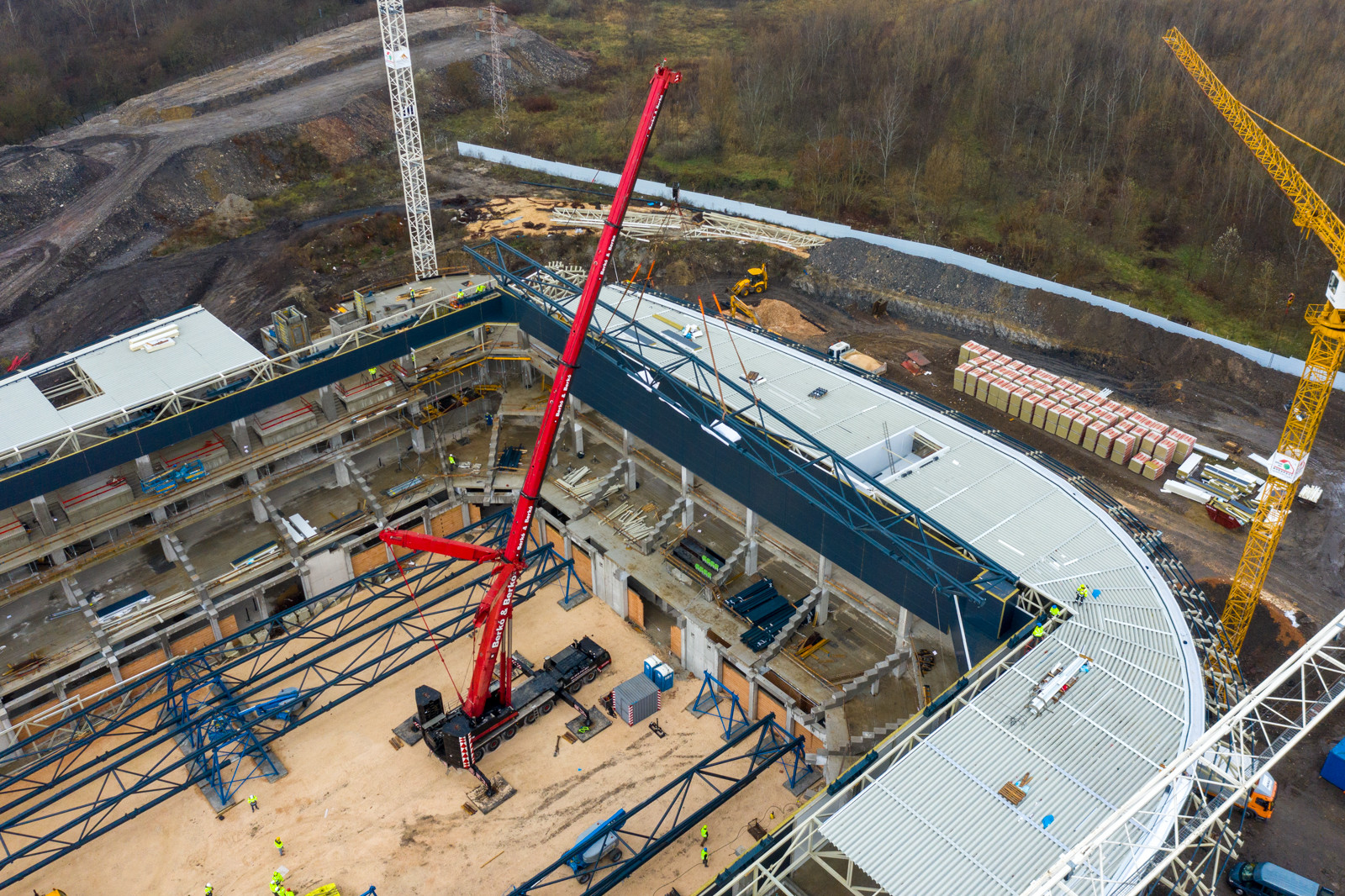 „Jelenleg az épület küzdőtere felett elhelyezkedő tíz darab, egyenként 63 méter hosszú és 43,8 tonnás főtartó beemelése zajlik”