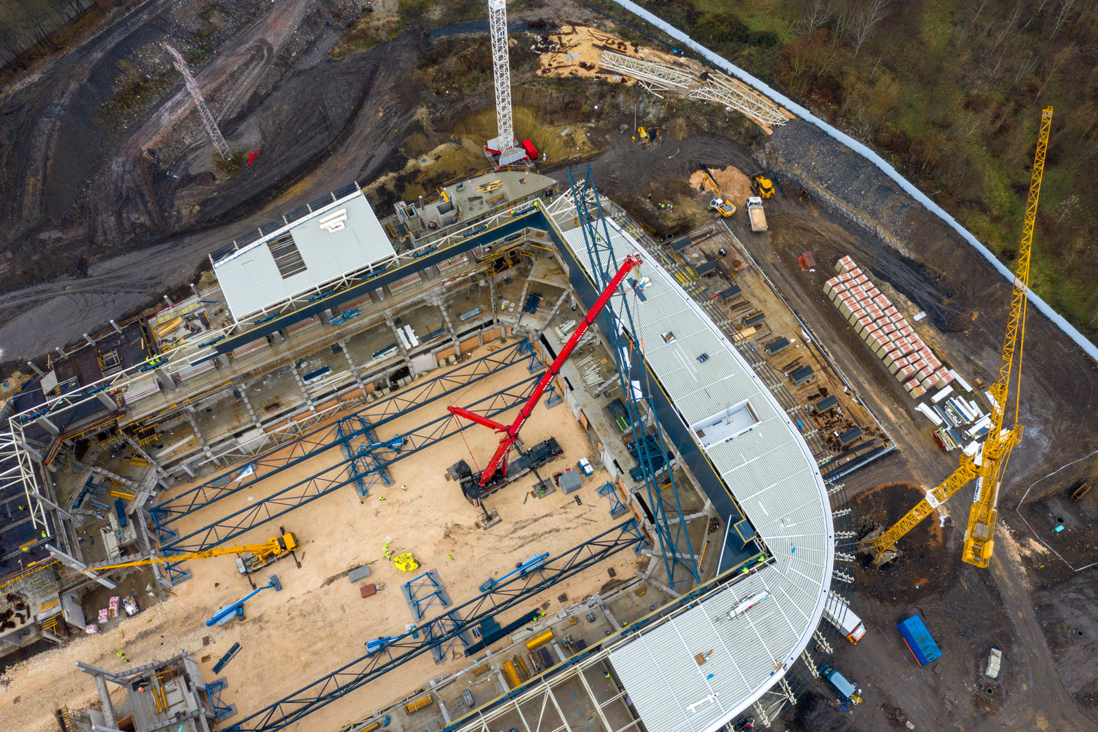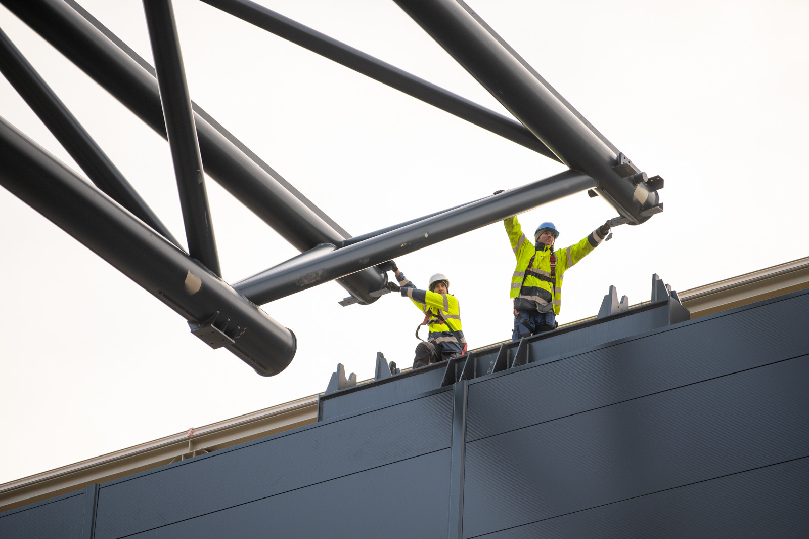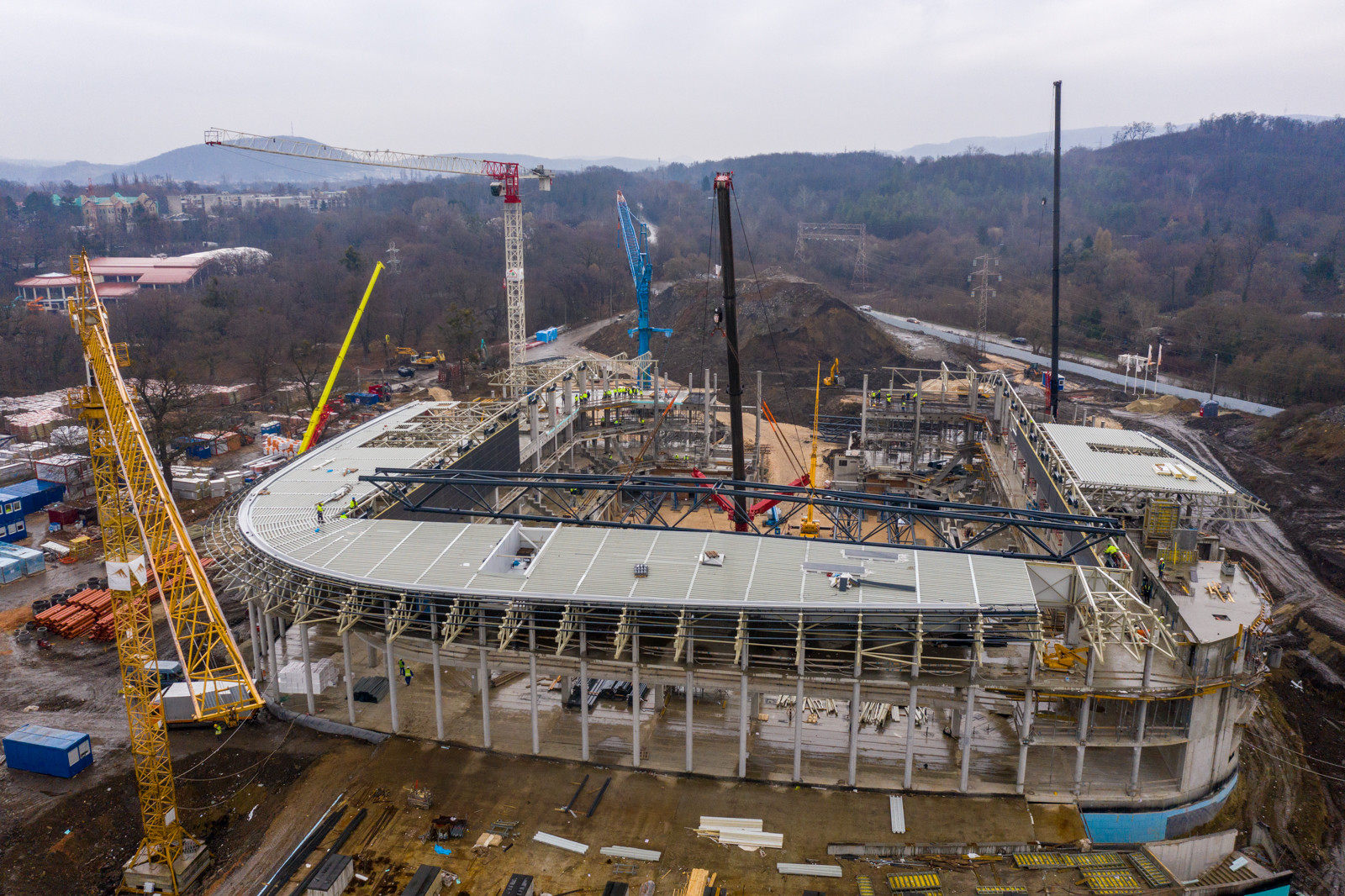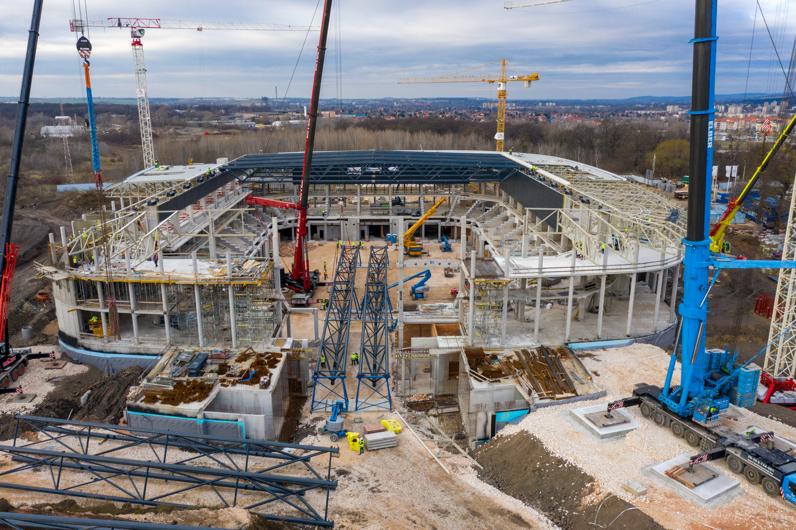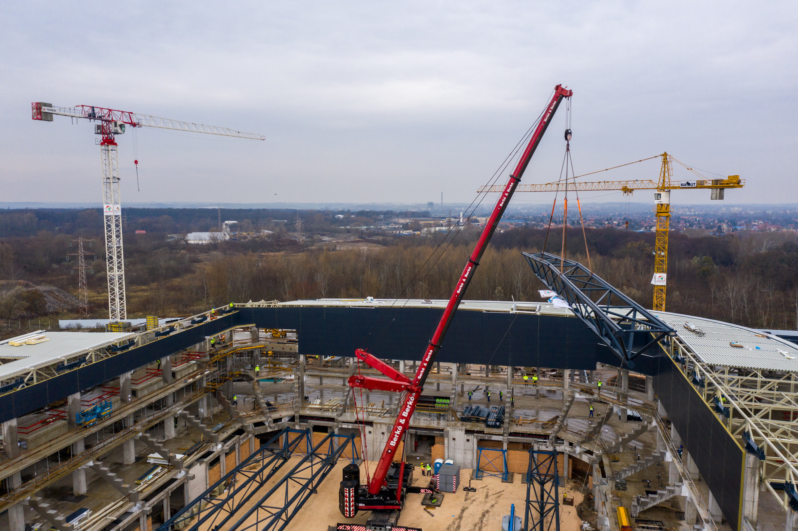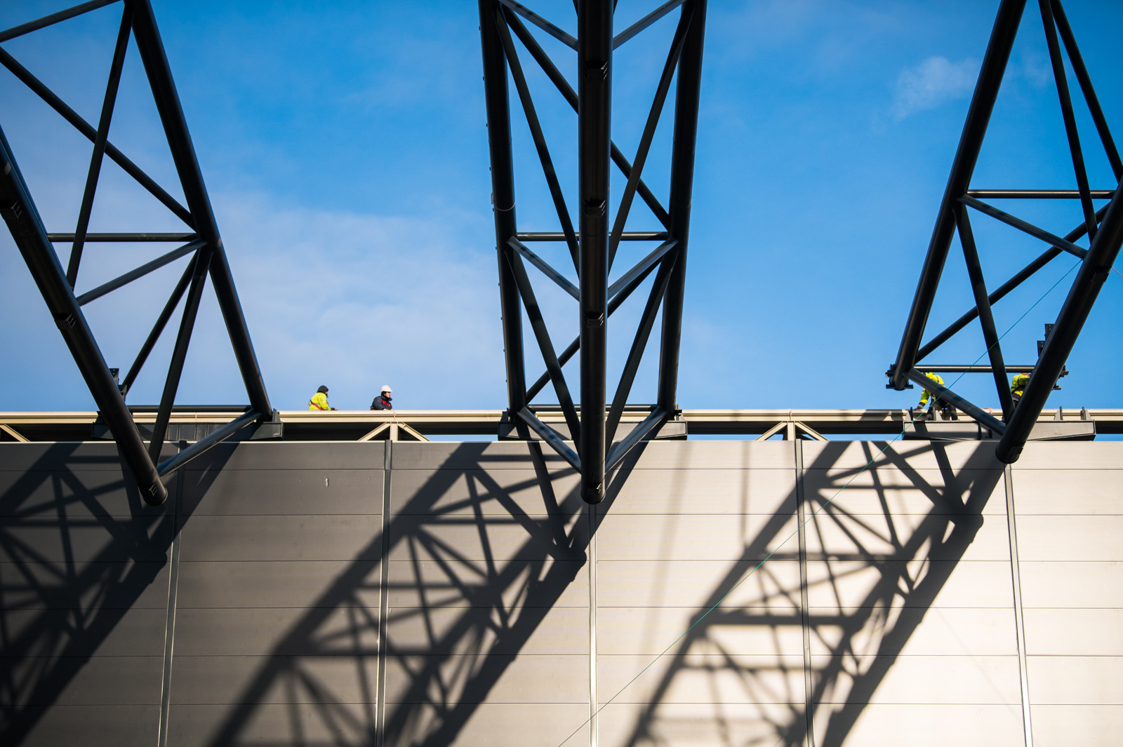 „Jelenleg az épület küzdőtere felett elhelyezkedő tíz darab, egyenként 63 méter hosszú és 43,8 tonnás főtartó beemelése zajlik”