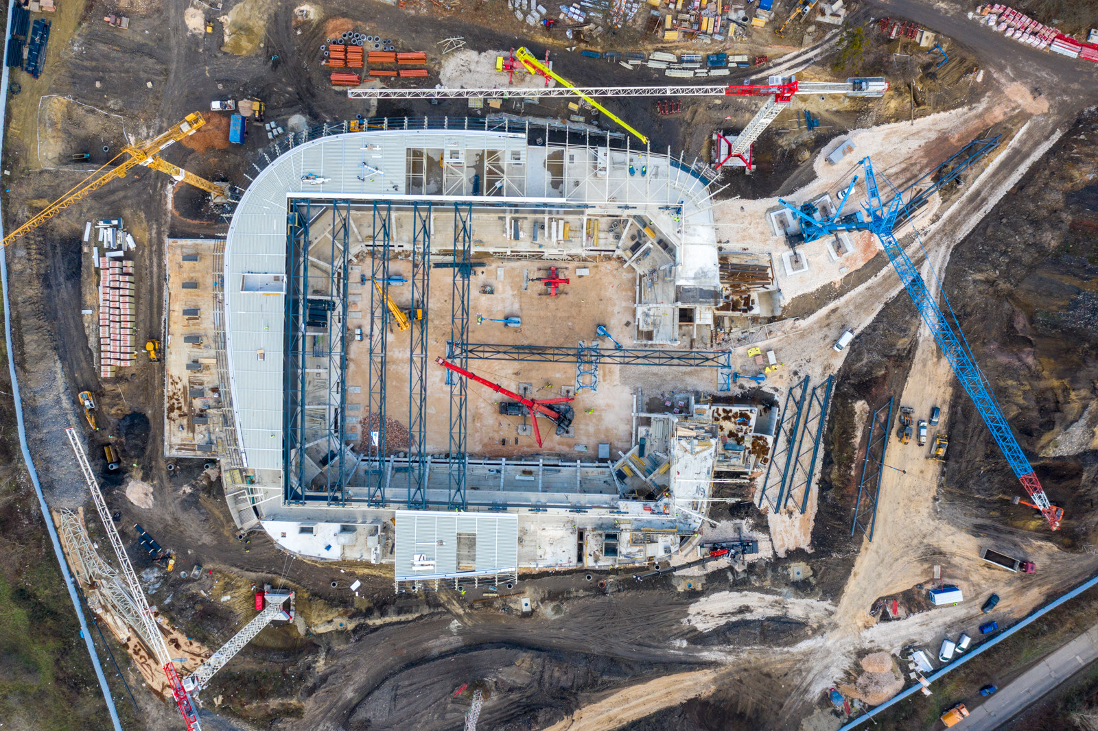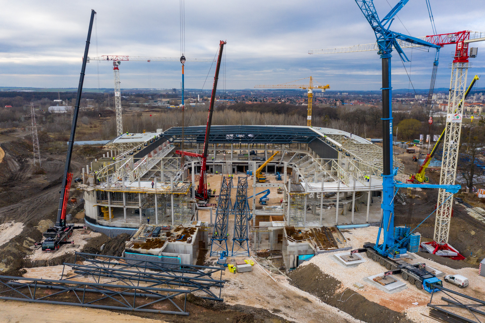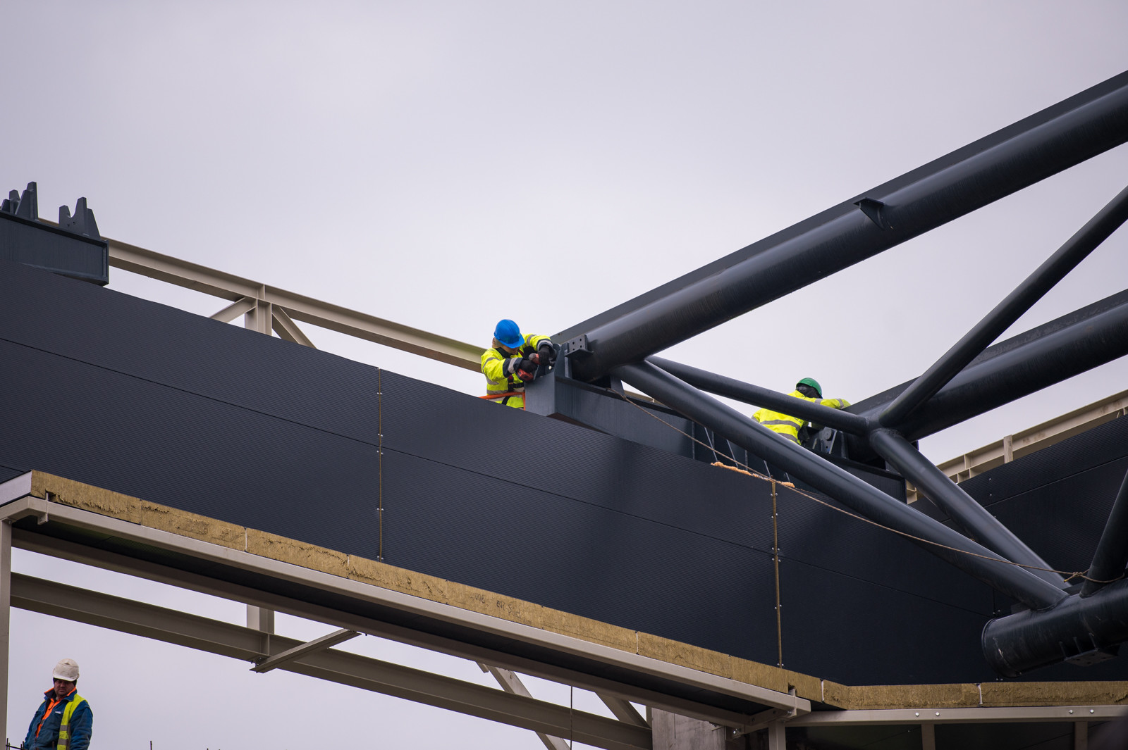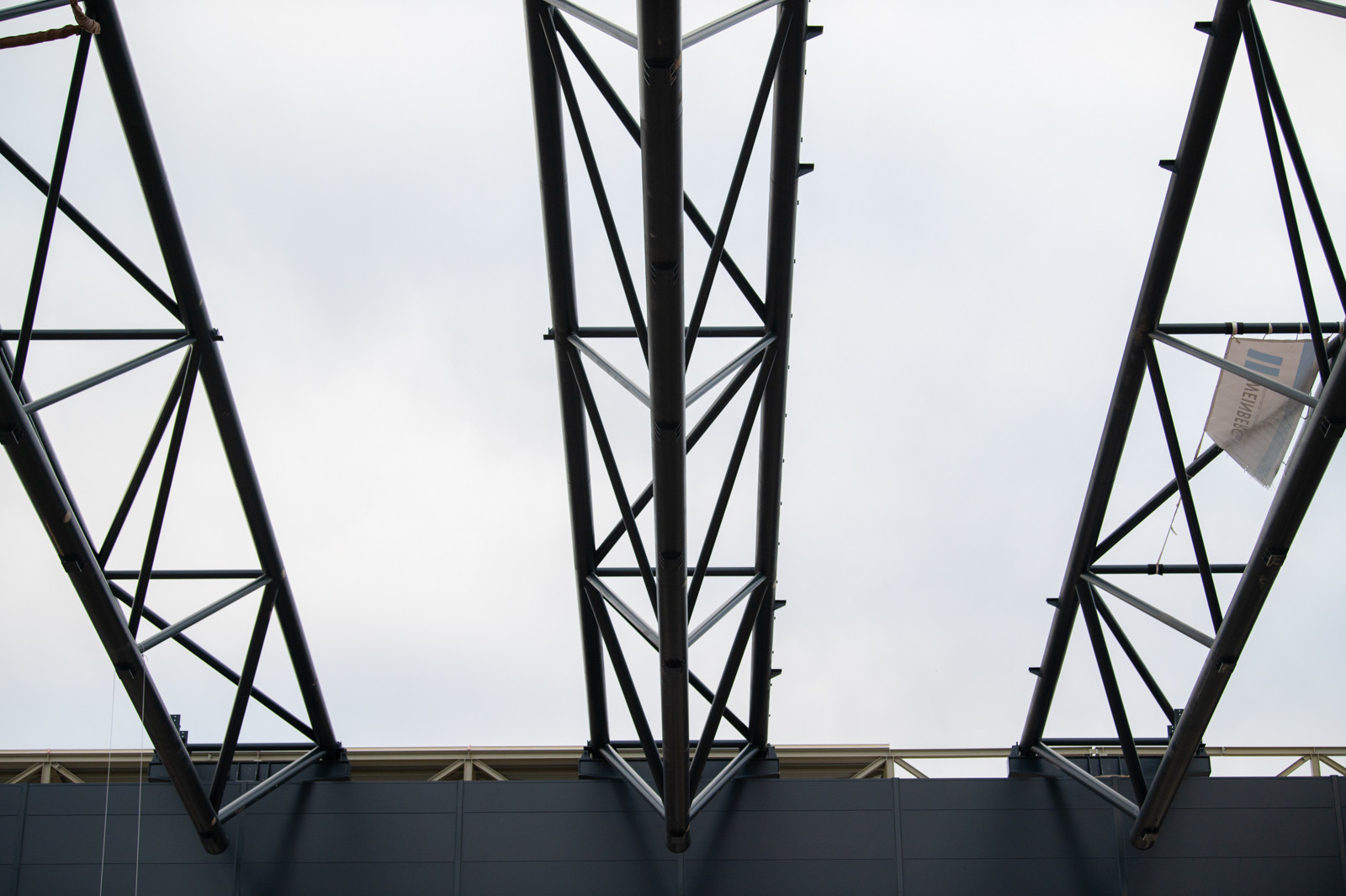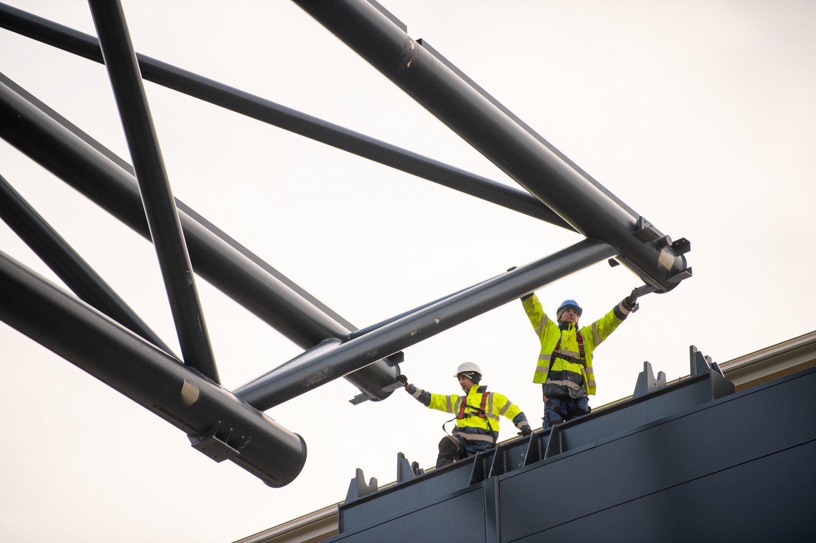 „Jelenleg az épület küzdőtere felett elhelyezkedő tíz darab, egyenként 63 méter hosszú és 43,8 tonnás főtartó beemelése zajlik”