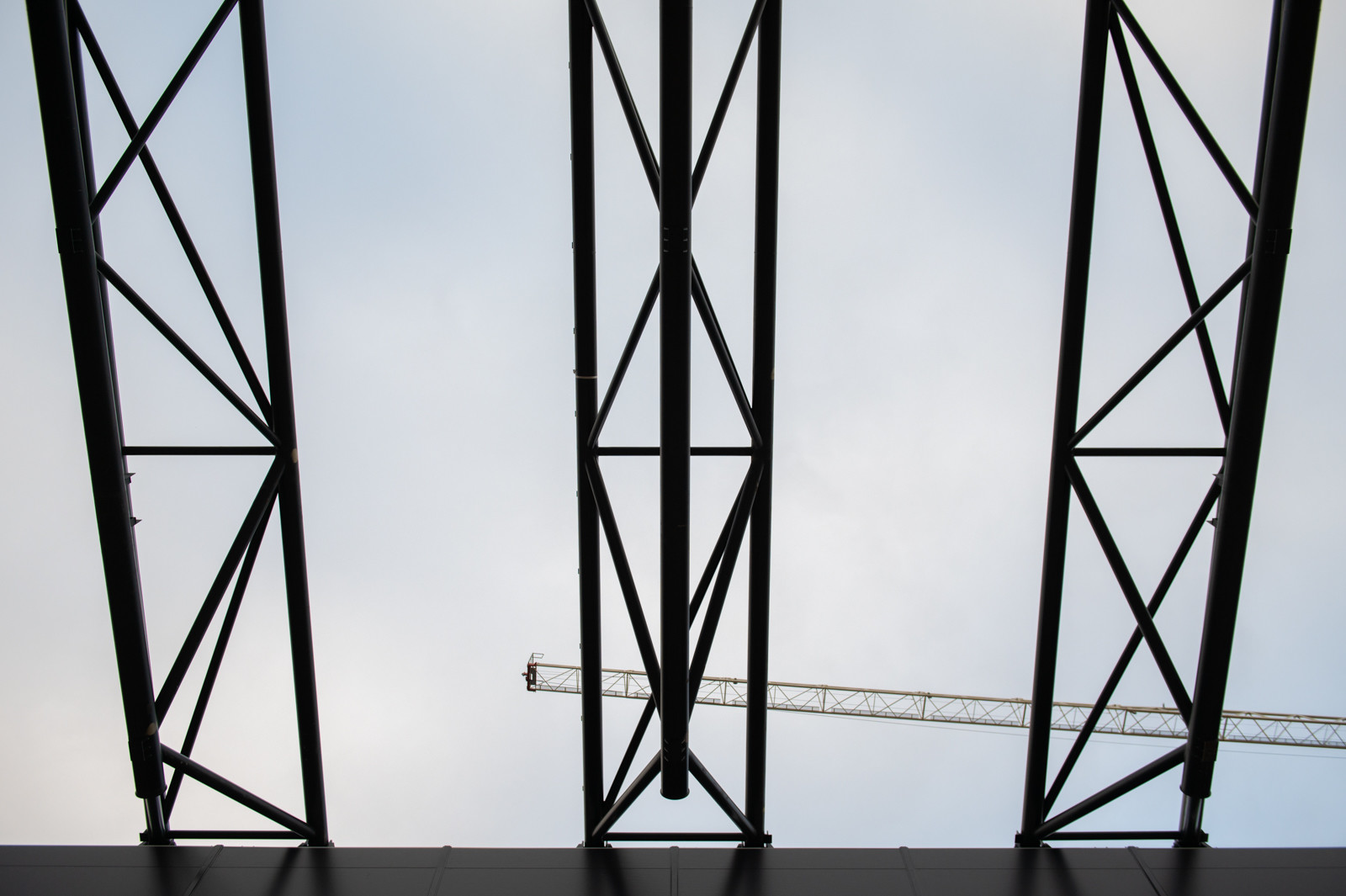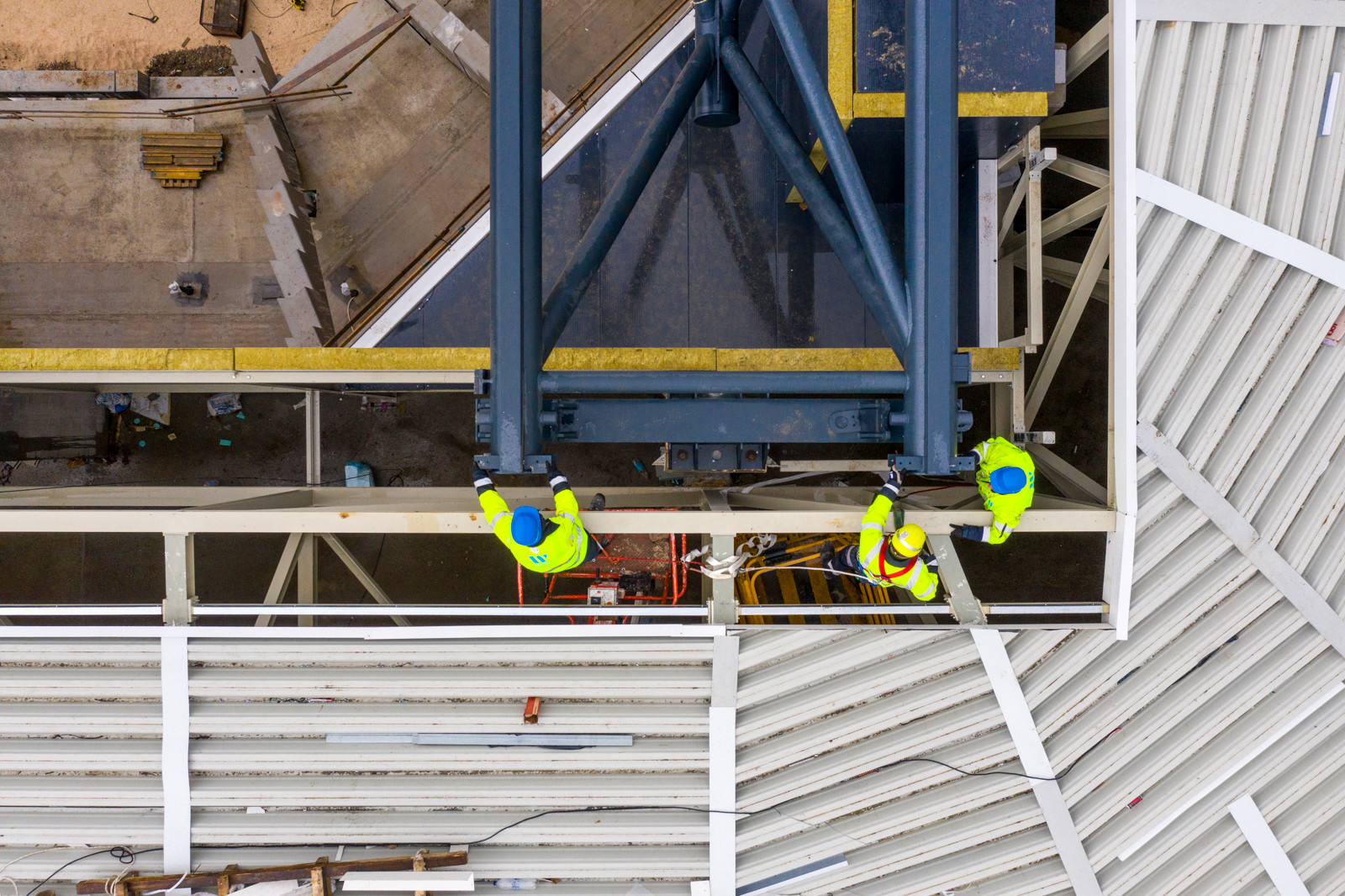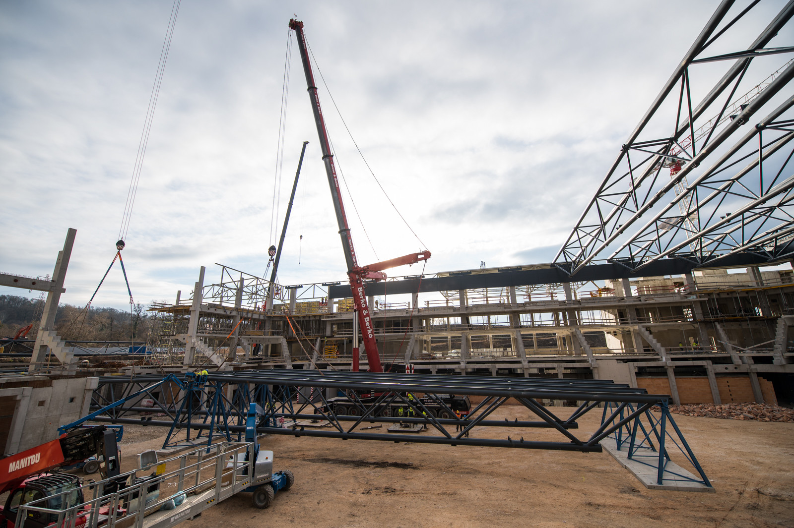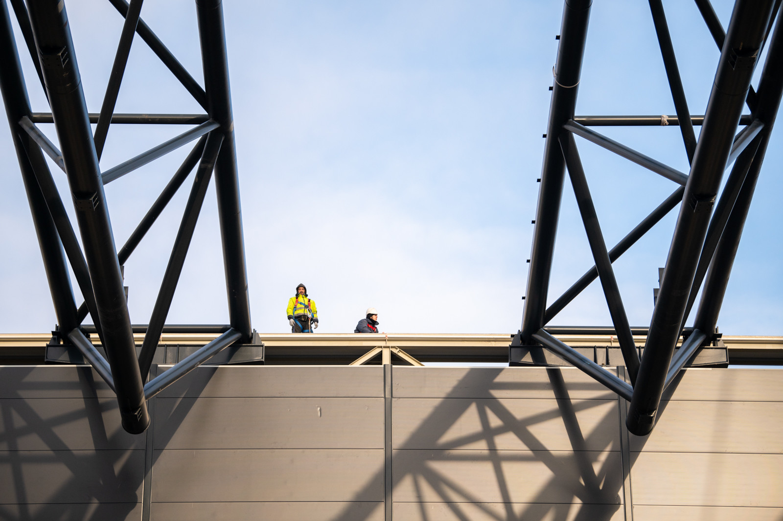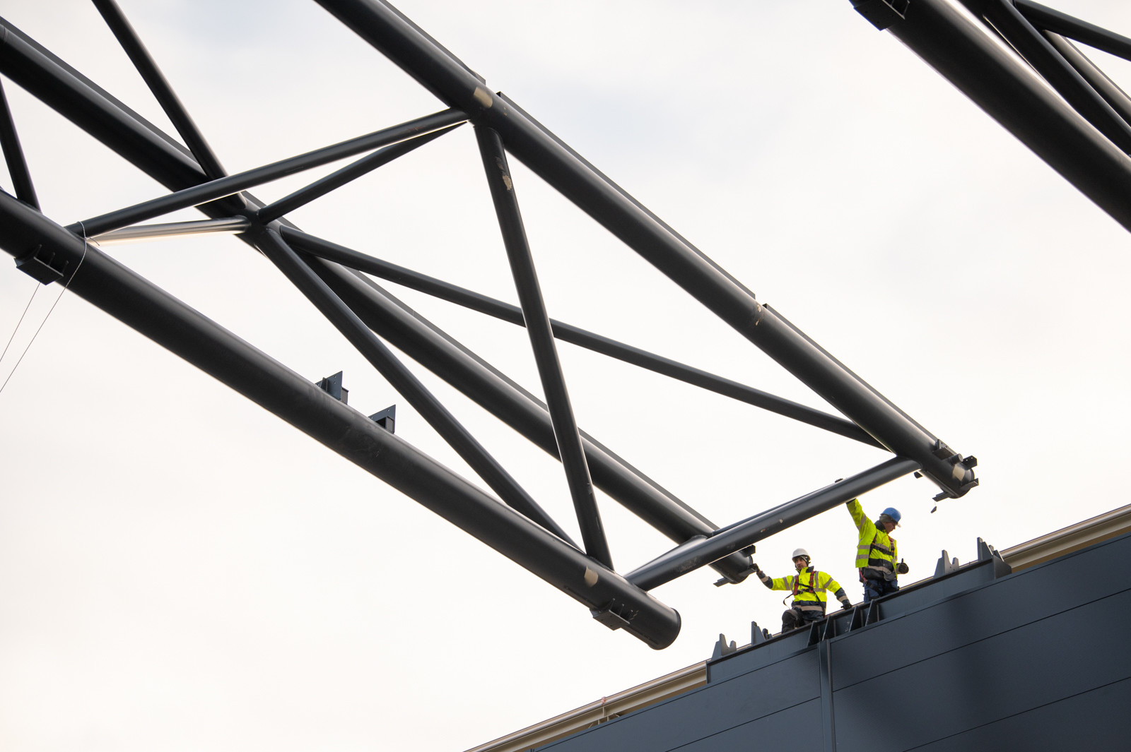 „Jelenleg az épület küzdőtere felett elhelyezkedő tíz darab, egyenként 63 méter hosszú és 43,8 tonnás főtartó beemelése zajlik”
