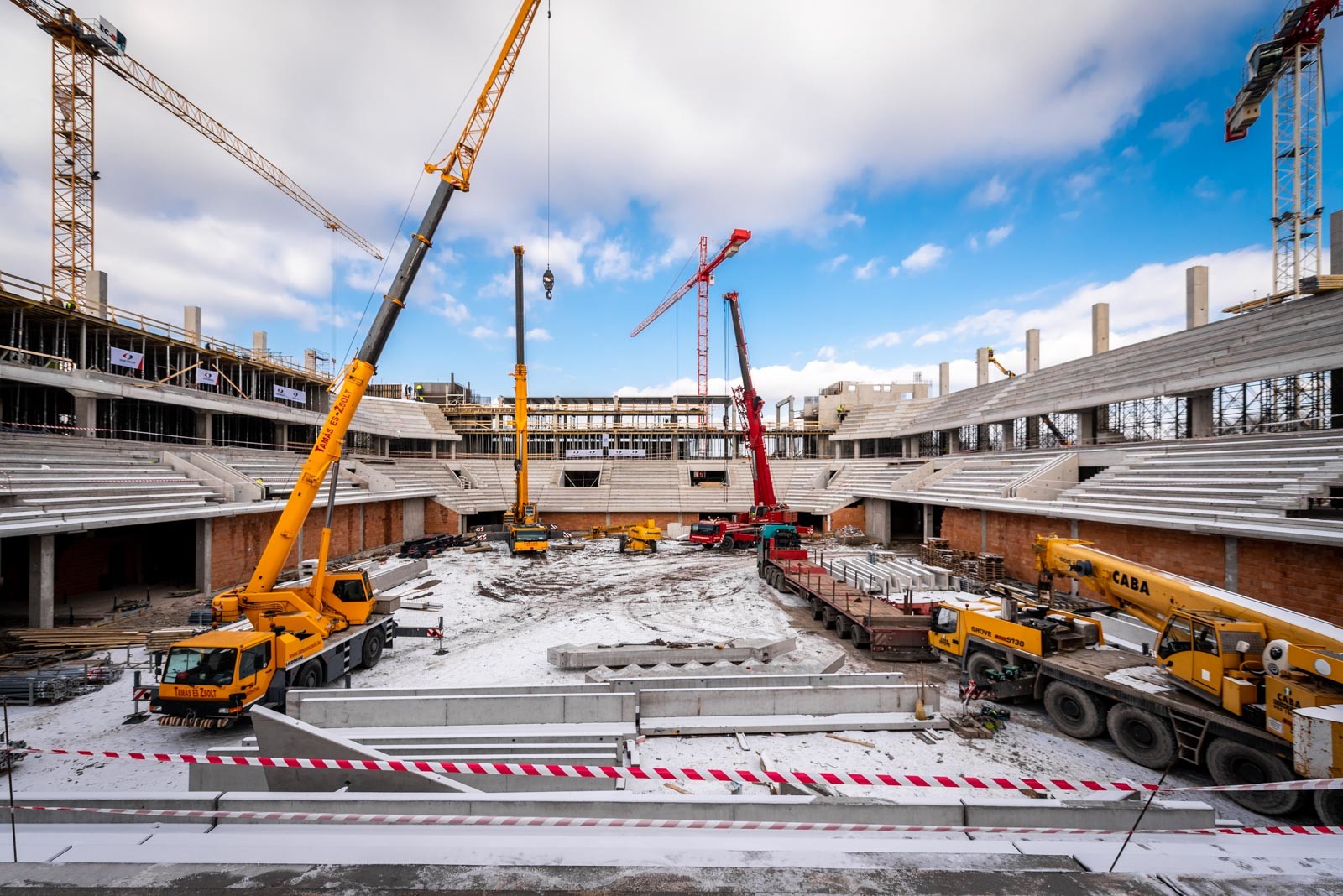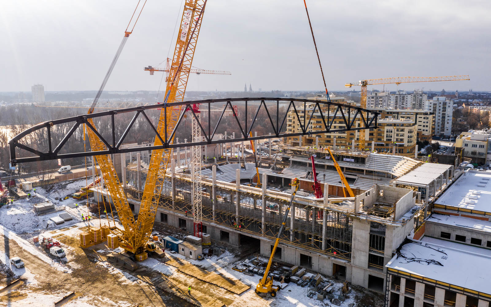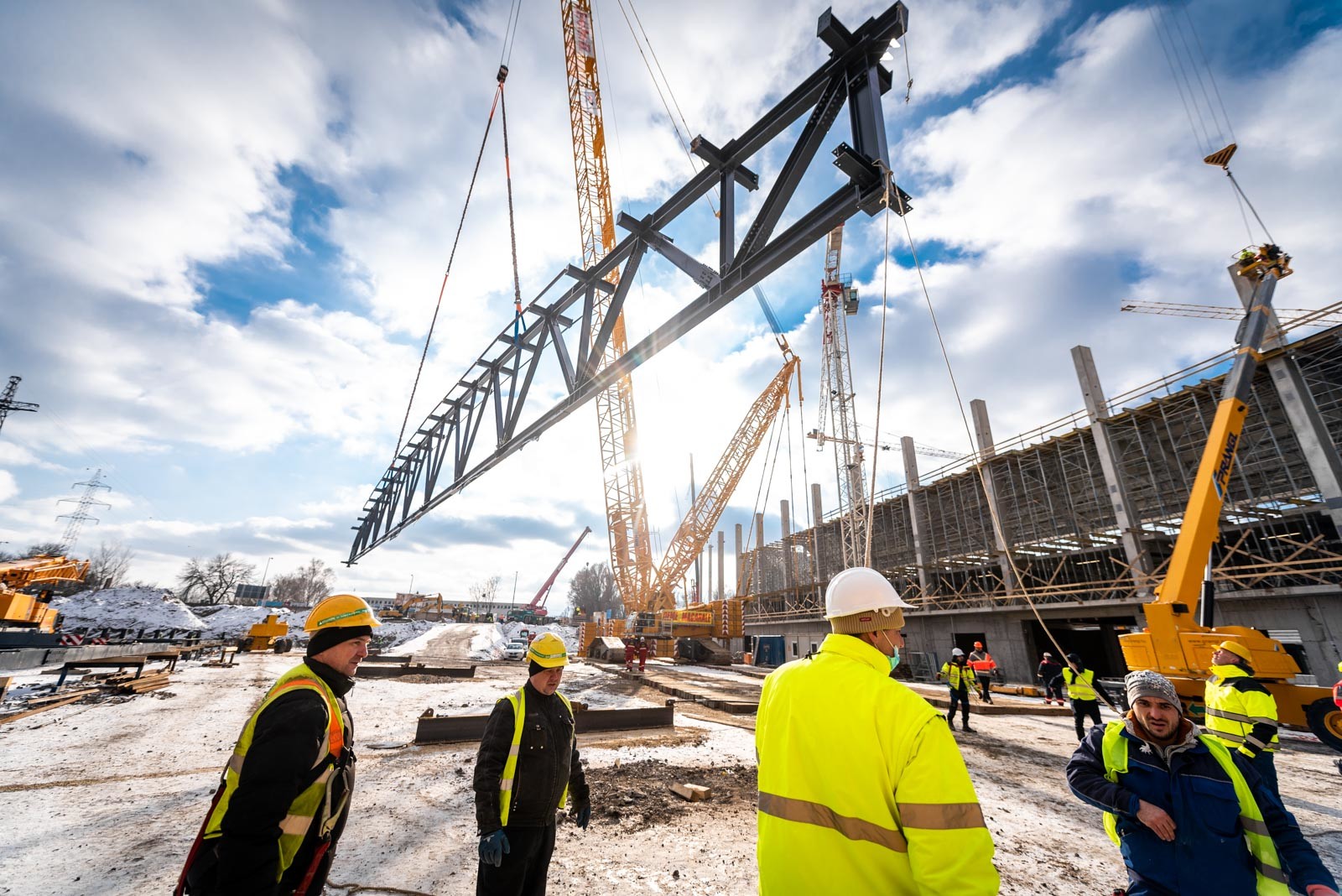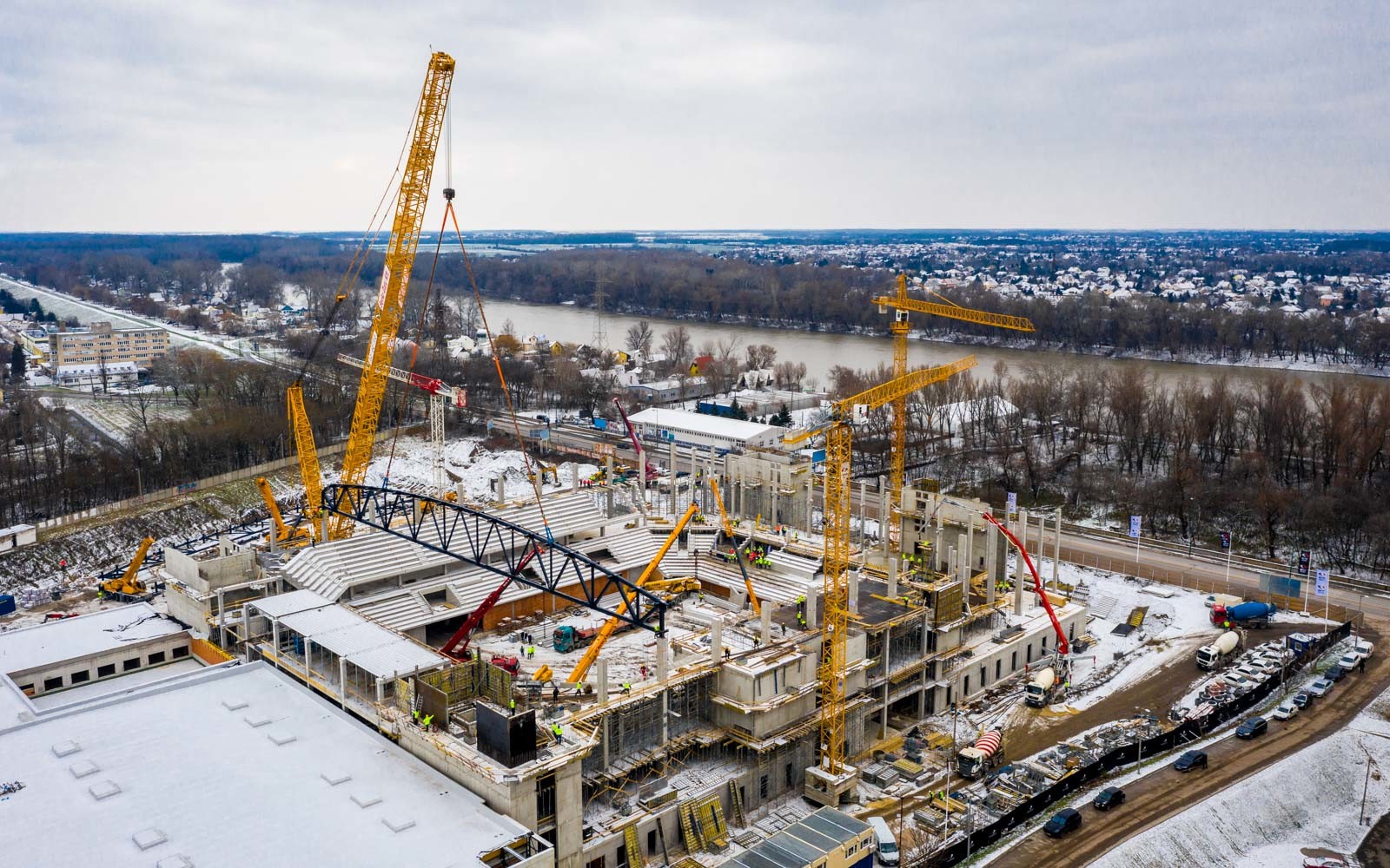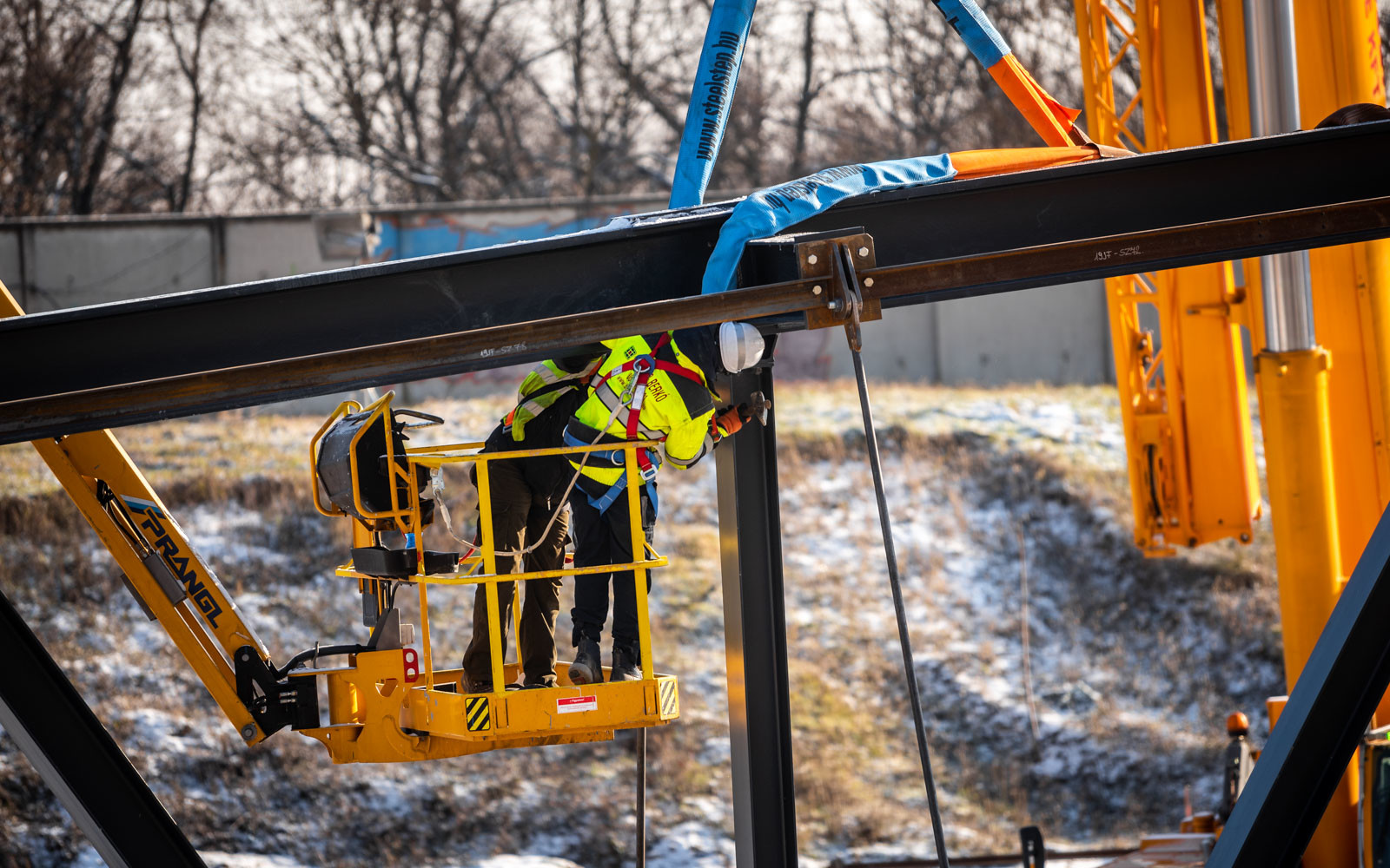 Január 18-án hétfőn különleges munkafázishoz érkezett a Szegedi Multifunkcionális Sportcsarnok kivitelezési munkája. A kivitelezést végző WEST HUNGÁRIA BAU Kft. szakemberei 22 méter magasságban beemelték az első főtartót, amely a 29 méter magas kézilabdacsarnok tetejét fogja tartani. A maradék 9 főtartót pedig ezt követően folyamatosan emelik be a helyére.