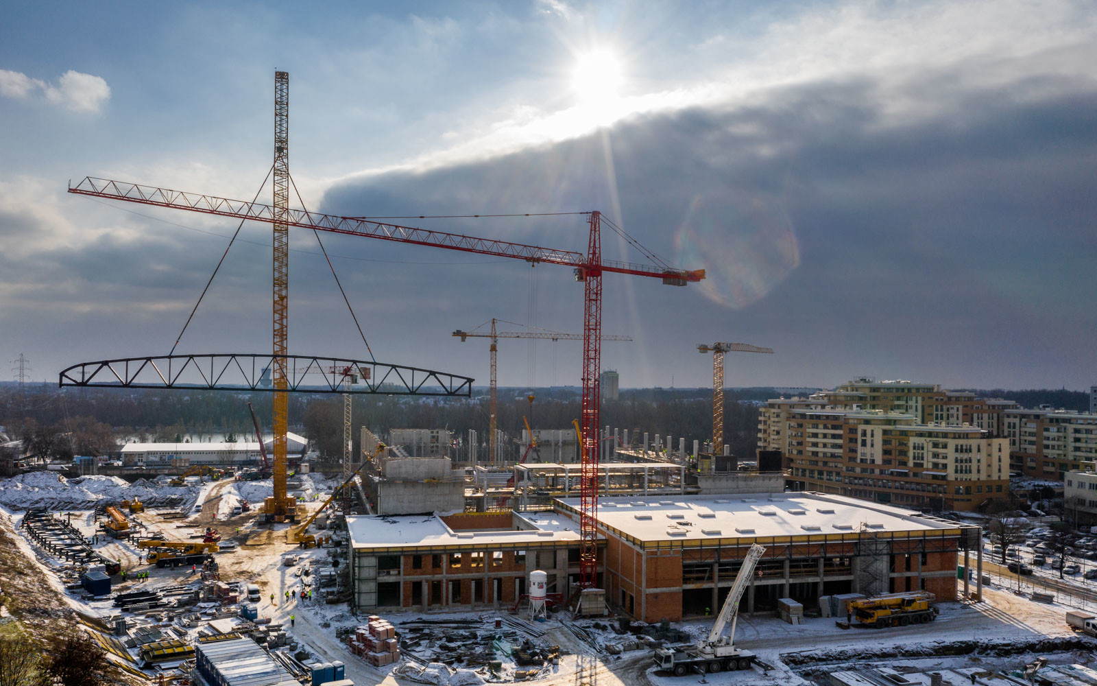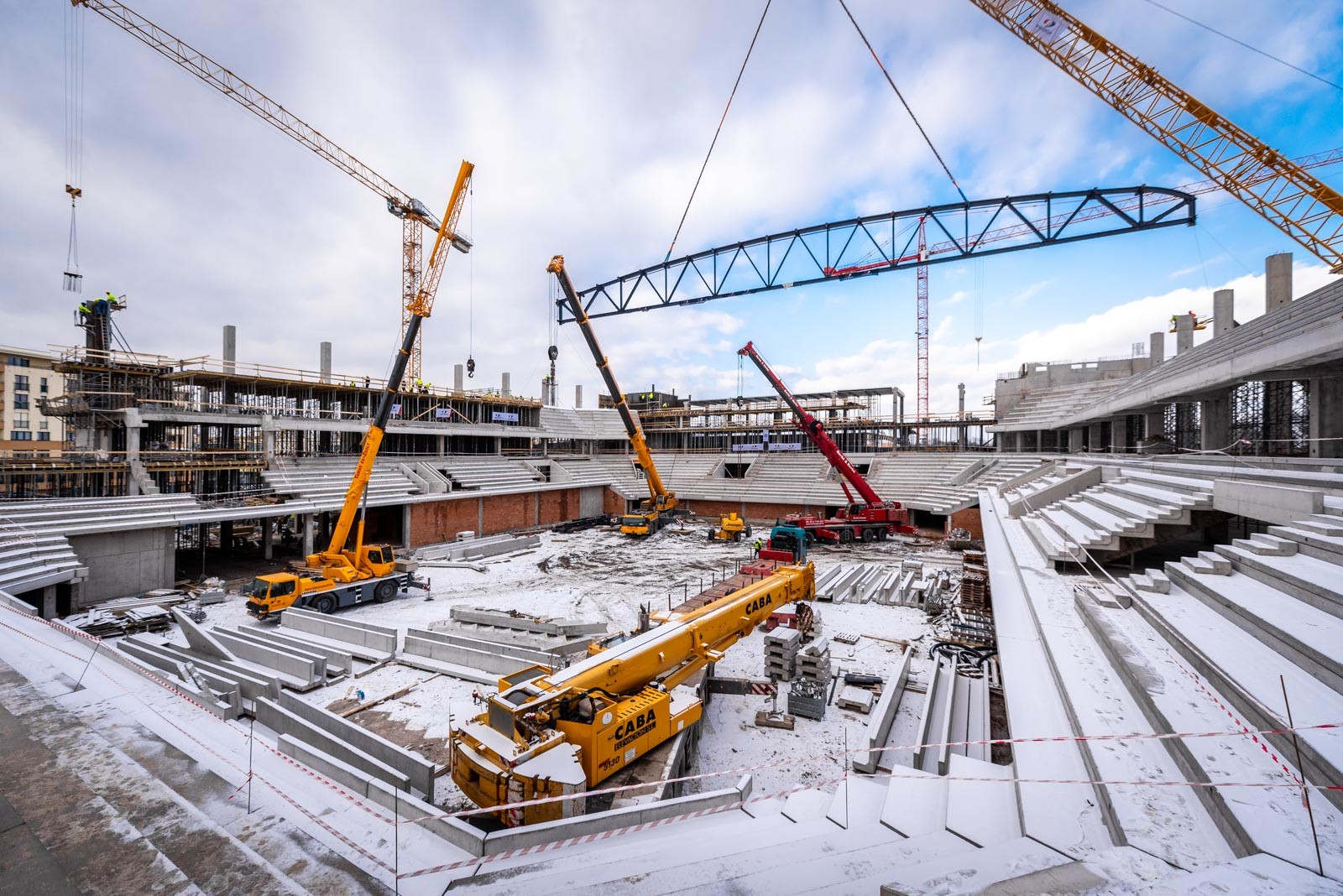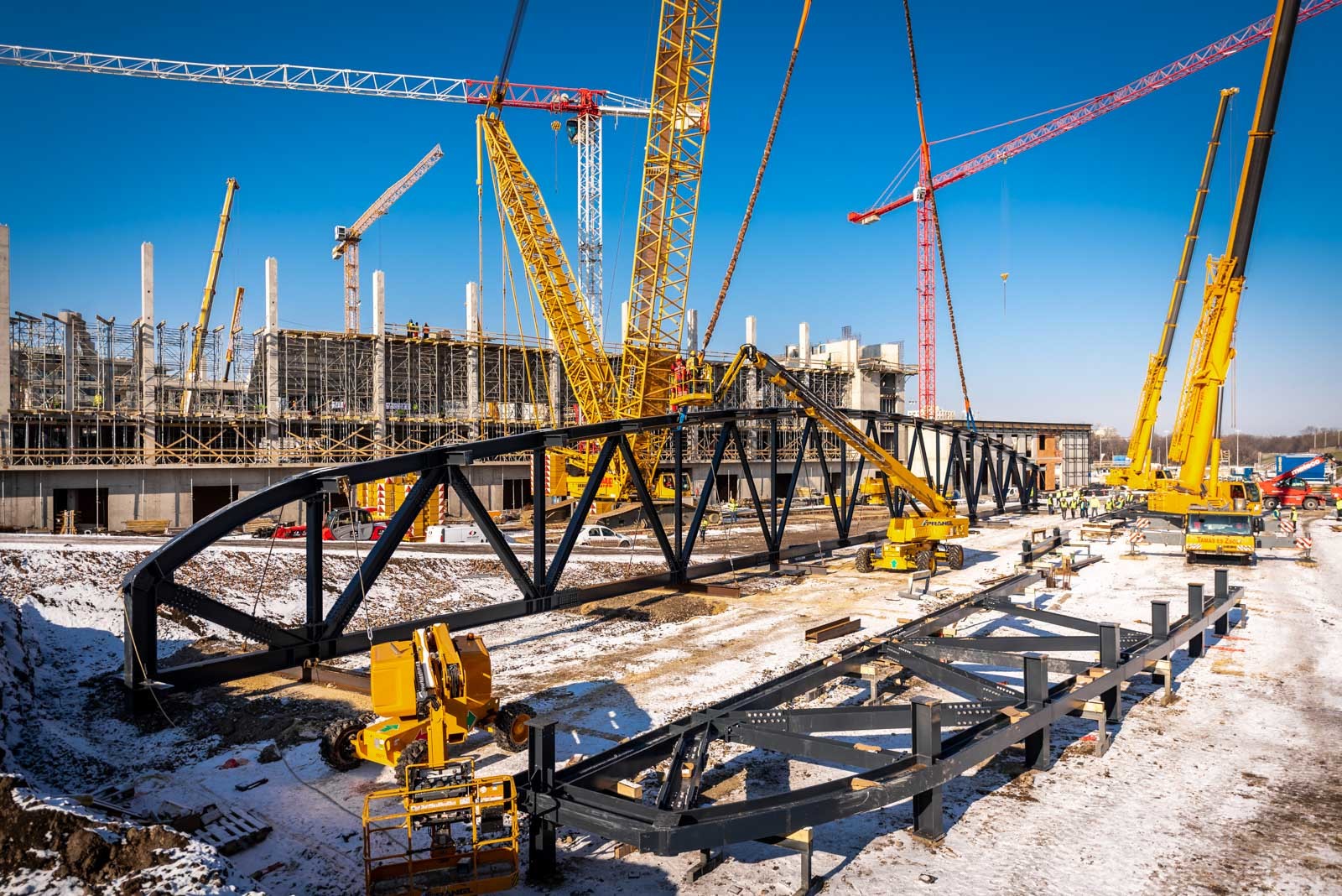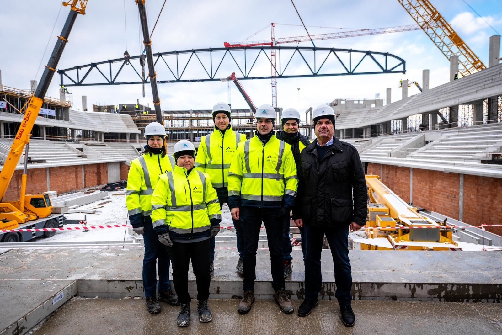 Január 18-án hétfőn különleges munkafázishoz érkezett a Szegedi Multifunkcionális Sportcsarnok kivitelezési munkája. A kivitelezést végző WEST HUNGÁRIA BAU Kft. szakemberei 22 méter magasságban beemelték az első főtartót, amely a 29 méter magas kézilabdacsarnok tetejét fogja tartani. A maradék 9 főtartót pedig ezt követően folyamatosan emelik be a helyére.